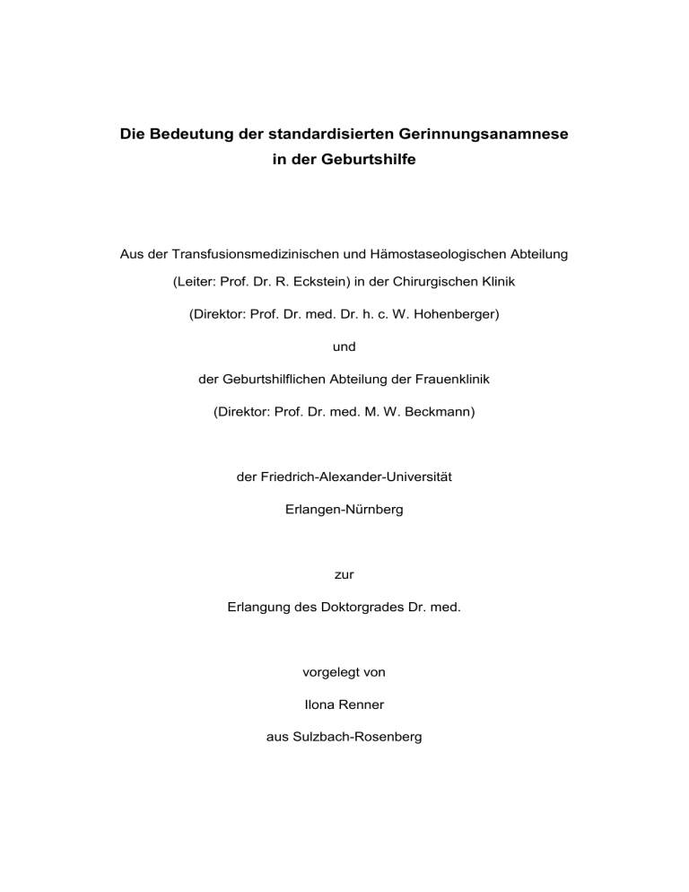 Die Bedeutung der standardisierten Gerinnungsanamnese in der Geburtshilfe Aus der Transfusionsmedizinischen und Hämostaseologischen Abteilung (Leiter: Prof. Dr. R. Eckstein) in der Chirurgischen Klinik (Direktor: Prof. Dr. med. Dr. h. c. W. Hohenberger) und der Geburtshilflichen Abteilung der Frauenklinik (Direktor: Prof. Dr. med. M. W. Beckmann) der Friedrich-Alexander-Universität Erlangen-Nürnberg zur Erlangung des Doktorgrades Dr. med. vorgelegt von Ilona Renner aus Sulzbach-Rosenberg Als Dissertation genehmigt von der Medizinischen Fakultät der Friedrich-Alexander-Universität Erlangen-Nürnberg Tag der mündlichen Prüfung: 10. März 2015 Vorsitzender des Promotionsorgans: Prof. Dr. med. Dr. h. c. J. Schüttler Gutachter/in: Prof. Dr. med. J. Ringwald Univ.-Prof. Dr. med. T. W. Goecke Für meine Eltern Horst und Kornelia Renner Inhaltsverzeichnis 1. Zusammenfassung und Abstract .............................................................. 1 1.1. Zusammenfassung ..................................................................................... 1 1.1.1. Hintergrund und Ziele ............................................................................. 1 1.1.2. Methoden ............................................................................................... 1 1.1.3. Ergebnisse und Beobachtungen ............................................................ 2 1.1.4. Praktische Schlussfolgerungen .............................................................. 2 1.2. Abstract ...................................................................................................... 3 1.2.1. Background and objektives .................................................................... 3 1.2.2. Methods ................................................................................................. 3 1.2.3. Results ................................................................................................... 3 1.2.4. Conclusions............................................................................................ 4 2. Einleitung .................................................................................................... 5 2.1. Müttersterblichkeit ...................................................................................... 5 2.1.1. Müttersterblichkeit - Definitionen ............................................................ 5 2.1.2. Müttersterblichkeit - Allgemeine Zahlen ................................................. 6 2.1.3. Müttersterblichkeit - Historischer Rückblick auf die Zahlen in Deutschland ............................................................................................................... 6 2.1.4. Müttersterblichkeit - Ursachen ................................................................ 7 2.2. Blutungskomplikationen in der Schwangerschaft und peripartal ................ 9 2.2.1. Ursachen, Häufigkeit und Symptome ..................................................... 9 2.2.2. Plasmatische Gerinnungsstörungen..................................................... 10 2.2.3. Thrombozytopenie und -pathie............................................................. 11 2.3. Bezug zu aktuellen Leitlinien .................................................................... 11 2.3.1. Prävention intra-/postpartaler Blutungskomplikationen in den nationalen und internationalen Leitlinien .......................................................................... 11 2.3.2. Leitlinien bezüglich präoperativer bzw. präpartaler Gerinnungsdiagnostik ............................................................................................................ 13 2.3.3. Österreichische Leitlinie - Bezug zum evaluierten Gerinnungsfragebogen ............................................................................................................. 14 2.4. Ziele dieser Doktorarbeit .......................................................................... 15 3. Material und Methoden............................................................................. 16 3.1. Studiendesign ........................................................................................... 16 3.2. Fragebogen .............................................................................................. 19 3.3. Auswahl der Studienteilnehmer ................................................................ 20 3.4. Datenerhebung ......................................................................................... 20 3.5. Datenstrukturierung .................................................................................. 21 4. Resultate ................................................................................................... 25 4.1. Übersicht Studienteilnehmerinnen und Beschreibung des analytischen Vorgehens ........................................................................................................ 25 4.2. Deskriptive Analyse aller 1000 Studienteilnehmerinnen ........................... 27 4.2.1. Altersverteilung .................................................................................... 27 4.2.2. Schwangerschaftswochen (SSW) bei Geburt ...................................... 27 4.2.3. Gravidität, Parität und Geburtsmodus .................................................. 27 4.2.4. Art und Dauer des Krankenhausaufenthalts nach Geburt .................... 28 4.2.5. Auswertungen zum Fragebogen .......................................................... 29 4.2.5.1. SSW beim Ausfüllen des Fragebogens............................................ 29 4.2.5.2. Aufschlüsselung der Antworten ........................................................ 30 4.2.5.3. Anzahl der mit Ja beantworteten Fragen ......................................... 30 4.2.5.4. Zahnfleischbluten ............................................................................. 30 4.2.6. Abklärung in Gerinnungsambulanz in Abhängigkeit vom Blutungsrisiko (mind. 1 Ja-A