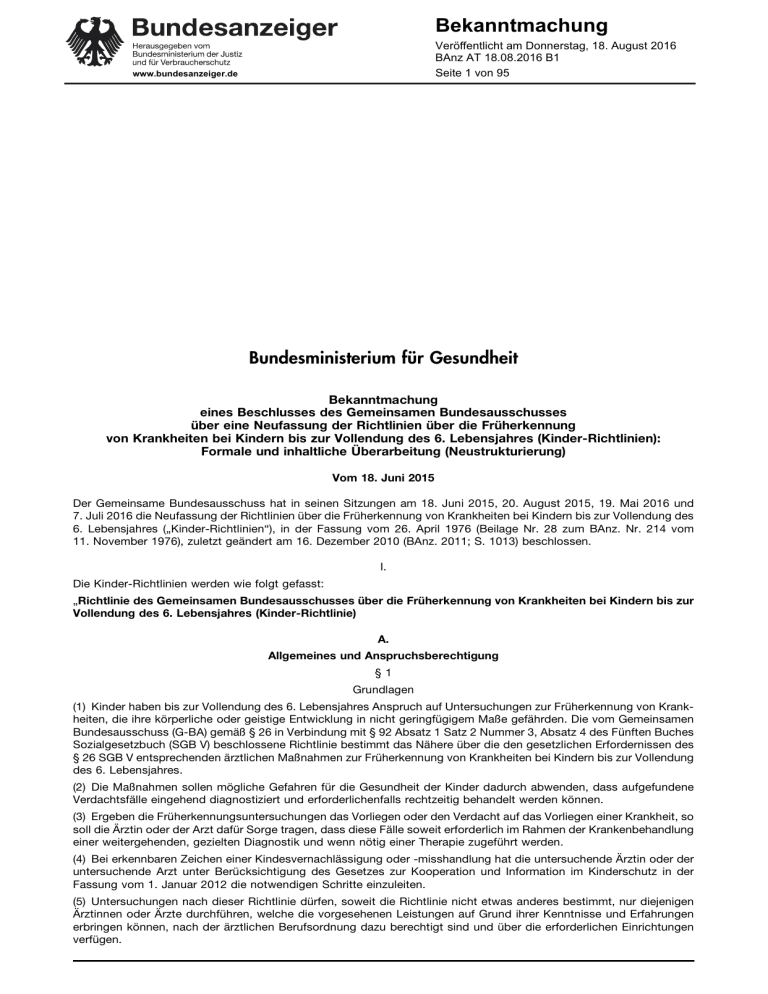 Bekanntmachung Veröffentlicht am Donnerstag, 18. August 2016 BAnz AT 18.08.2016 B1 Seite 1 von 95 www.bundesanzeiger.de Bundesministerium für Gesundheit Bekanntmachung eines Beschlusses des Gemeinsamen Bundesausschusses über eine Neufassung der Richtlinien über die Früherkennung von Krankheiten bei Kindern bis zur Vollendung des 6. Lebensjahres (Kinder-Richtlinien): Formale und inhaltliche Überarbeitung (Neustrukturierung) Vom 18. Juni 2015 Der Gemeinsame Bundesausschuss hat in seinen Sitzungen am 18. Juni 2015, 20. August 2015, 19. Mai 2016 und 7. Juli 2016 die Neufassung der Richtlinien über die Früherkennung von Krankheiten bei Kindern bis zur Vollendung des 6. Lebensjahres („Kinder-Richtlinien“), in der Fassung vom 26. April 1976 (Beilage Nr. 28 zum BAnz. Nr. 214 vom 11. November 1976), zuletzt geändert am 16. Dezember 2010 (BAnz. 2011; S. 1013) beschlossen. I. Die Kinder-Richtlinien werden wie folgt gefasst: „Richtlinie des Gemeinsamen Bundesausschusses über die Früherkennung von Krankheiten bei Kindern bis zur Vollendung des 6. Lebensjahres (Kinder-Richtlinie) A. Allgemeines und Anspruchsberechtigung §1 Grundlagen (1) Kinder haben bis zur Vollendung des 6. Lebensjahres Anspruch auf Untersuchungen zur Früherkennung von Krankheiten, die ihre körperliche oder geistige Entwicklung in nicht geringfügigem Maße gefährden. Die vom Gemeinsamen Bundesausschuss (G-BA) gemäß § 26 in Verbindung mit § 92 Absatz 1 Satz 2 Nummer 3, Absatz 4 des Fünften Buches Sozialgesetzbuch (SGB V) beschlossene Richtlinie bestimmt das Nähere über die den gesetzlichen Erfordernissen des § 26 SGB V entsprechenden ärztlichen Maßnahmen zur Früherkennung von Krankheiten bei Kindern bis zur Vollendung des 6. Lebensjahres. (2) Die Maßnahmen sollen mögliche Gefahren für die Gesundheit der Kinder dadurch abwenden, dass aufgefundene Verdachtsfälle eingehend diagnostiziert und erforderlichenfalls rechtzeitig behandelt werden können. (3) Ergeben die Früherkennungsuntersuchungen das Vorliegen oder den Verdacht auf das Vorliegen einer Krankheit, so soll die Ärztin oder der Arzt dafür Sorge tragen, dass diese Fälle soweit erforderlich im Rahmen der Krankenbehandlung einer weitergehenden, gezielten Diagnostik und wenn nötig einer Therapie zugeführt werden. (4) Bei erkennbaren Zeichen einer Kindesvernachlässigung oder -misshandlung hat die untersuchende Ärztin oder der untersuchende Arzt unter Berücksichtigung des Gesetzes zur Kooperation und Information im Kinderschutz in der Fassung vom 1. Januar 2012 die notwendigen Schritte einzuleiten. (5) Untersuchungen nach dieser Richtlinie dürfen, soweit die Richtlinie nicht etwas anderes bestimmt, nur diejenigen Ärztinnen oder Ärzte durchführen, welche die vorgesehenen Leistungen auf Grund ihrer Kenntnisse und Erfahrungen erbringen können, nach der ärztlichen Berufsordnung dazu berechtigt sind und über die erforderlichen Einrichtungen verfügen. Bekanntmachung Veröffentlicht am Donnerstag, 18. August 2016 BAnz AT 18.08.2016 B1 Seite 23 von 95 www.bundesanzeiger.de – Aufklärung über Impfungen/Vorschlag eines Impftermins, Impfstatus entsprechend Schutzimpfungs-Richtlinie des G-BA überprüfen – Verweis zum Zahnarzt zur zahnärztlichen Früherkennungsuntersuchung C. Spezielle Früherkennungsuntersuchungen I. Erweitertes Neugeborenen-Screening 1. Allgemeine Bestimmungen § 13 Allgemeines (1) Das nach dieser Richtlinie durchzuführende erweiterte Neugeborenen-Screening dient der Früherkennung von angeborenen Stoffwechseldefekten und endokrinen Störungen bei Neugeborenen, die die körperliche und geistige Entwicklung der Kinder in nicht geringfügigem Maße gefährden. Durch das Screening soll eine unverzügliche Therapieeinleitung im Krankheitsfall ermöglicht werden. (2) Das Screening umfasst ausschließlich die in § 17 als Zielkrankheiten aufgeführten Stoffwechseldefekte und endokrinen Störungen. § 14 Geltungsbereich Die Richtlinie gilt auf Grundlage von § 26 des SGB V für alle zu Lasten der gesetzlichen Krankenversicherung durchgeführten Neugeborenen-Screenings, unabhängig davon, welcher Leistungserbringer sie einleitet oder erbringt. § 15 Anspruchsberechtigung Neugeborene haben Anspruch auf Teilnahme am erweiterten Neugeborenen-Screening entsprechend dieser Richtlinie. § 16 Aufklärung und Einwilligung (1) Die Eltern (Personensorgeberechtigten) des Neugeborenen sind vor der Durchführung des Screenings eingehend und mit Unterstützung eines Informationsblatts entsprechend Anlage 3 durch den verantwortlichen Arzt (§ 19 Absatz 1) aufzuklären. Wird die Geburt durch eine Hebamme oder einen Entbindungspfleger geleitet, kann die Aufklärung durch diese erfolgen, wenn die Rückfragemöglichkeit an einen Arzt gewährleistet ist. Die Inhalte der Aufklärung sind vor der Untersuchung zu dokumentieren. (2) Zu Anforderungen an die Inhalte der Aufklärung gilt § 9 des Gendiagnostikgesetzes (GenDG). Die Aufklärung umfasst insbesondere Zweck, Art, Umfang und Aussagekraft der genetischen Untersuchung. Die Gendiagnostik-Kommission kann diese Inhalte in Richtlinie nach § 23 Absatz 2 Nummer 3 GenDG konkretisieren. (3) Nach der Aufklärung ist eine angemessene Bedenkzeit bis zur Entscheidung über die Einwilligung einzuräumen. Die Personensorgeberechtigten können auf die Bedenkzeit verzichten, sodass unmittelbar nach der Aufklärung die Einwilligung eingeholt und Blut abgenommen werden kann. Die Einwilligung umfasst den Umfang der genetischen Untersuchung und den Umfang der mit der Filterpapierkarte weiterzugebenden personenbezogenen Daten. Die Einwilligung hat gegenüber der Person zu erfolgen, die die Aufklärung nach Absatz 1 durchgeführt hat und ist mit der Unterschrift zumindest eines Elternteils (Personensorgeberechtigten) zu dokumentieren. Die Eltern erklären mit ihrer Einwilligung zum Screening, dass personenbezogene Daten an die Labore übermittelt werden dürfen. Als Nachweis der vorliegenden Einwilligung gegenübe