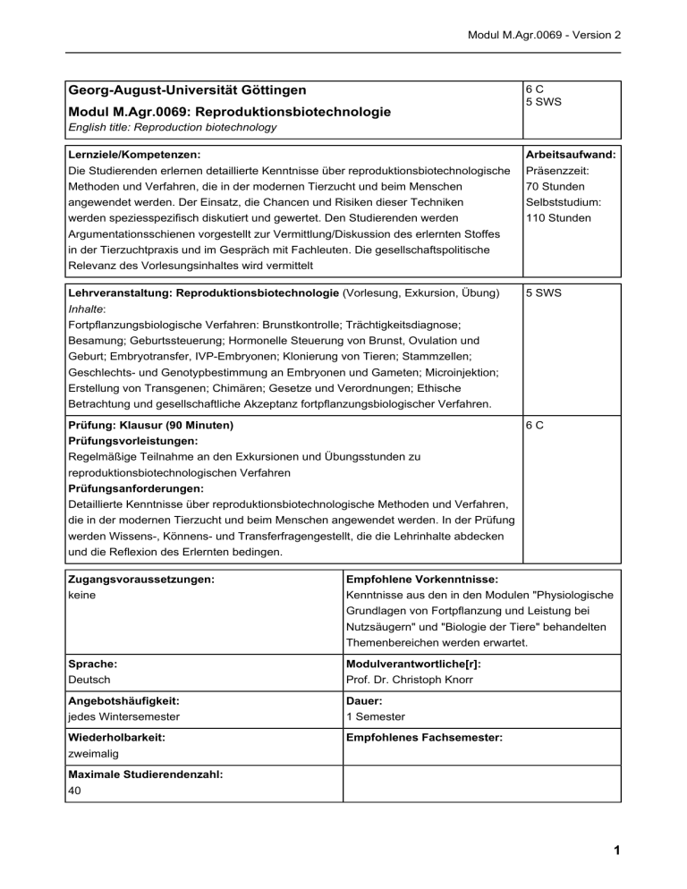 Modul M.Agr.0069 - Version 2 Georg-August-Universität Göttingen Modul M.Agr.0069: Reproduktionsbiotechnologie 6C 5 SWS English title: Reproduction biotechnology Lernziele/Kompetenzen: Die Studierenden erlernen detaillierte Kenntnisse über reproduktionsbiotechnologische Methoden und Verfahren, die in der modernen Tierzucht und beim Menschen angewendet werden. Der Einsatz, die Chancen und Risiken dieser Techniken werden speziesspezifisch diskutiert und gewertet. Den Studierenden werden Argumentationsschienen vorgestellt zur Vermittlung/Diskussion des erlernten Stoffes in der Tierzuchtpraxis und im Gespräch mit Fachleuten. Die gesellschaftspolitische Relevanz des Vorlesungsinhaltes wird vermittelt Arbeitsaufwand: Präsenzzeit: 70 Stunden Selbststudium: 110 Stunden Lehrveranstaltung: Reproduktionsbiotechnologie (Vorlesung, Exkursion, Übung) Inhalte: Fortpflanzungsbiologische Verfahren: Brunstkontrolle; Trächtigkeitsdiagnose; Besamung; Geburtssteuerung; Hormonelle Steuerung von Brunst, Ovulation und Geburt; Embryotransfer, IVP-Embryonen; Klonierung von Tieren; Stammzellen; Geschlechts- und Genotypbestimmung an Embryonen und Gameten; Microinjektion; Erstellung von Transgenen; Chimären; Gesetze und Verordnungen; Ethische Betrachtung und gesellschaftliche Akzeptanz fortpflanzungsbiologischer Verfahren. 5 SWS Prüfung: Klausur (90 Minuten) 6C Prüfungsvorleistungen: Regelmäßige Teilnahme an den Exkursionen und Übungsstunden zu reproduktionsbiotechnologischen Verfahren Prüfungsanforderungen: Detaillierte Kenntnisse über reproduktionsbiotechnologische Methoden und Verfahren, die in der modernen Tierzucht und beim Menschen angewendet werden. In der Prüfung werden Wissens-, Könnens- und Transferfragengestellt, die die Lehrinhalte abdecken und die Reflexion des Erlernten bedingen. Zugangsvoraussetzungen: keine Empfohlene Vorkenntnisse: Kenntnisse aus den in den Modulen "Physiologische Grundlagen von Fortpflanzung und Leistung bei Nutzsäugern" und "Biologie der Tiere" behandelten Themenbereichen werden erwartet. Sprache: Deutsch Modulverantwortliche[r]: Prof. Dr. Christoph Knorr Angebotshäufigkeit: jedes Wintersemester Dauer: 1 Semester Wiederholbarkeit: zweimalig Empfohlenes Fachsemester: Maximale Studierendenzahl: 40 1