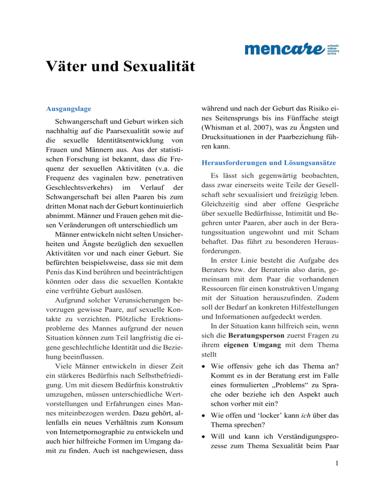 Väter und Sexualität Ausgangslage Schwangerschaft und Geburt wirken sich nachhaltig auf die Paarsexualität sowie auf die sexuelle Identitätsentwicklung von Frauen und Männern aus. Aus der statistischen Forschung ist bekannt, dass die Frequenz der sexuellen Aktivitäten (v.a. die Frequenz des vaginalen bzw. penetrativen Geschlechtsverkehrs) im Verlauf der Schwangerschaft bei allen Paaren bis zum dritten Monat nach der Geburt kontinuierlich abnimmt. Männer und Frauen gehen mit diesen Veränderungen oft unterschiedlich um Männer entwickeln nicht selten Unsicherheiten und Ängste bezüglich den sexuellen Aktivitäten vor und nach einer Geburt. Sie befürchten beispielsweise, dass sie mit dem Penis das Kind berühren und beeinträchtigen könnten oder dass die sexuellen Kontakte eine verfrühte Geburt auslösen. Aufgrund solcher Verunsicherungen bevorzugen gewisse Paare, auf sexuelle Kontakte zu verzichten. Plötzliche Erektionsprobleme des Mannes aufgrund der neuen Situation können zum Teil langfristig die eigene geschlechtliche Identität und die Beziehung beeinflussen. Viele Männer entwickeln in dieser Zeit ein stärkeres Bedürfnis nach Selbstbefriedigung. Um mit diesem Bedürfnis konstruktiv umzugehen, müssen unterschiedliche Wertvorstellungen und Erfahrungen eines Mannes miteinbezogen werden. Dazu gehört, allenfalls ein neues Verhältnis zum Konsum von Internetpornographie zu entwickeln und auch hier hilfreiche Formen im Umgang damit zu finden. Auch ist nachgewiesen, dass während und nach der Geburt das Risiko eines Seitensprungs bis ins Fünffache steigt (Whisman et al. 2007), was zu Ängsten und Drucksituationen in der Paarbeziehung führen kann. Herausforderungen und Lösungsansätze Es lässt sich gegenwärtig beobachten, dass zwar einerseits weite Teile der Gesellschaft sehr sexualisiert und freizügig leben. Gleichzeitig sind aber offene Gespräche über sexuelle Bedürfnisse, Intimität und Begehren unter Paaren, aber auch in der Beratungssituation ungewohnt und mit Scham behaftet. Das führt zu besonderen Herausforderungen. In erster Linie besteht die Aufgabe des Beraters bzw. der Beraterin also darin, gemeinsam mit dem Paar die vorhandenen Ressourcen für einen konstruktiven Umgang mit der Situation herauszufinden. Zudem soll der Bedarf an konkreten Hilfestellungen und Informationen aufgedeckt werden. In der Situation kann hilfreich sein, wenn sich die Beratungsperson zuerst Fragen zu ihrem eigenen Umgang mit dem Thema stellt • Wie offensiv gehe ich das Thema an? Kommt es in der Beratung erst im Falle eines formulierten „Problems“ zu Sprache oder beziehe ich den Aspekt auch schon vorher mit ein? • Wie offen und ‘locker’ kann ich über das Thema sprechen? • Will und kann ich Verständigungsprozesse zum Thema Sexualität beim Paar 1 Faktenblatt: Väter und Sexualität anleiten und begleiten? Weshalb? Weshalb nicht? • Welche Informationen zum Thema will ich unbedingt vermitteln? • Inwieweit ist es Teil meiner Aufgaben, dass sich das Paar während der Schwangerschaft / nach der Geburt in Sachen Sexualität neu orientieren kann? • Gebe ich z.B. Hinweise und Anleitungen zu sexuellen Stellungen während der Schwangerschaft und nach der Geburt? Spezifisch beim Kontakt mit dem Vater können folgende Fragen hilfreich sein: • Wie gut bin ich in der Lage, das Thema Sexualität in der Gegenwarteines Mannes offen anzusprechen? • Schränken äussere stereotype Vorstellungen von männlicher und weiblicher Sexualität einen offenen Blick auf die Situation ein? Verbinde ich dabei beispielsweise Weiblichkeit mit Hilfsbedürftigkeit und Männlichkeit mit Durchsetzungsmacht? • Welche Haltung und Wertung bringe ich selber zu den Themen Selbstbefriedigung, bezahlte Sex- und Liebesarbeit, oder Pornografie mit? • Spreche ich mögliche Ängste und falsche Befürchtungen von Vätern bezüglich sexueller Kontakte bewusst an? • Kann und will ich einen ‘„schwangeren’ Vater darin begleiten und unterstützen, seine sexuellen Bedürfnisse zum Ausdruck zu bringen? • Wenn ich einen Mann in seinen sexuellen Bedürfnissen als unsensibel und rücksichtslos empfinde, kann ich ihn mit seinen schwierigen Äusserungen auf eine respektvolle Art und Weise konfrontieren? • Welche Möglichkeiten habe ich, einen jungen Vater zu unterstützen, der rund um Schwangerschaft und Geburt Probleme mit seiner Sexualität bekundet? Wo weise ich ihn hin? Für die Praxis Wohin kann ich einen Vater für weiterführende Beratung rund um das Thema Sexualität verweisen? Hier eine Übersicht zu niederschwelligen Anlaufstellen: • Einen Überblick über alle Beratungsstellen für sexuelle Gesundheit, die Unterstützung im Themenfeld Partnerschaft, Sexualität und Schwangerschaft zur Verfügung stellen, bietet die Stiftung Sexuelle Gesundheit Schweiz (früher: Schweiz. Vereinigung für Familienplanung und Sexualerziehung SVFS) www.sante-sexuelle.ch/beratungsstellen/. • Zudem gibt es vor allem in den Städten zahlreiche Paarberater und Sexualtherapeuten in eigener Praxis, einige auch mit männer- bzw. väterspezifischen Einzelund Gruppenangeboten. • Das Zürcher Institut für Sexologie & Sexualtherapie als einer von verschiedenen Aus- und Weiterbildungsanbieter im Bereich Sexualität führt auch Einzel- und Paarberatungen durch: www.ziss.ch/angebot/beratung.htm • Hausärzte oder männliche Gynäkologe kommen je nach persönlicher Haltung und beruflichem Hintergrund ebenfalls als professionelle Ansprechpersonen in Frage. • An einigen Geburtskliniken sind spezialisierte Fachärzte/Fachärztinnen für Psy- 2 Faktenblatt: Väter und Sexualität chosomatik tätig, die Sprechstunden anbieten, z.B. www.frauenheilkunde.insel.ch/?id=4422 • Hinweise auf weitere Angebote zum Thema Sexualität in den Kantonen finden sie auch auf der Landkarte von MenCare unter dem Thema „Sorge um sich“: www.mencare.swiss/de/landkarte In den kantonalen Beratungsstellen für Familien- und Schwangerschaftsfr