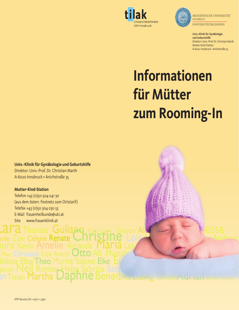 MEDIZINISCHE UNIVERSITÄT INNSBRUCK UNIVERSITÄTSKLINIKEN Univ.-Klinik für Gynäkologie und Geburtshilfe Direktor: Univ.-Prof. Dr. Christian Marth Mutter-Kind-Station A-6020 Innsbruck • Anichstraße 35 Informationen für Mütter zum Rooming-In r Stillen_D:Folder Stillen_D 26.03.2008 9:42 Uhr Seite 1 Univ.-Klinik für Gynäkologie und Geburtshilfe Direktor: Univ.-Prof. Dr. Christian Marth A-6020 Innsbruck • Anichstraße 35 Mutter-Kind-Station Telefon +43 (0)50 504-241 30 (aus dem österr. Festnetz zum Ortstarif) Telefax +43 (0)50 504-230 55 E-Mail [email protected] Site www.frauenklinik.at Lara Thomas Guliano Sharon Alexander Anna Vanessa Zoe Celeste Renate Christine Lois Valerie SusiJoschuar Andreas ardo aura Rosa Liam Kevin Amelie Amanda Maria Lea Julia Miriam Elias Caspar Lara Lilly Allya Jakob Niklas l Marc Christoph Lois Anton Otto Ali Mustafa Florance Melissa Elias Theo Moritz Sabine Elke Eugenie Sophie Noah Leo Dorian jamin Neil Roman Helga Sabrina Sascha Juan Ayse Timna Liam Cora Kurt an Tizian Martha Daphne Benedikt Ludwig OliverAdrian Ilona Meriem DTP-Service LKI • 1/11 • 13301 DTP-Service LKI • 03/11 • 13301 Sehr geehrte Mütter, Rooming-In soll kein Zwang sein! Sie haben bei uns auf der Mutter–Kind-Station der Univ.-Klinik für Gynäkologie und Geburtshilfe die Möglichkeit, Ihr Baby rund um die Uhr bei sich zu haben = Rooming-In. Wenn Sie müde oder erschöpft sind, können Sie Ihr Baby auch einmal für ein paar Stunden in das Kinderzimmer abgeben und Ihr Baby wird in dieser Zeit von qualifizierten, diplomierten Kinderkrankenschwestern oder Hebammen betreut. Die Beziehung zu Ihrem Baby kann sich damit gleich nach der Geburt intensivieren und Sie können emotional eine besondere Bindung aufbauen. Sie haben die Möglichkeit Ihr Baby wann immer Sie wollen zu streicheln, zu berühren, mit ihm zu kuscheln und auch zu stillen. Sie lernen Ihr Baby schneller und besser kennen, können rasch auf seine Bedürfnisse reagieren und lernen dabei die Äußerungen Ihres Babys zu verstehen. Wir unterstützen Sie gerne im Umgang mit Ihrem Baby, zeigen Ihnen die Babypflege wie Wickeln, Baden, An- und Umziehen sowie die Nabelpflege. Das alles wird in Ihrem Zimmer durchgeführt. Auch beim Stillen werden Sie von unserem fachkundigen Pflegepersonal betreut und beraten. Das Rooming-In ist die beste Voraussetzung für das Stillen, so kann das Stillen nach Bedarf und jederzeit erfolgen. Zusätzlich erhalten Sie eine eigene Stillbroschüre mit interessanten Informationen. Es ist sehr wichtig, dass ein guter Kontakt zum Pflegepersonal gewährleistet ist, damit Sie sich bei eventuellen Unklarheiten mit der neuen Situation vertrauensvoll an jemanden wenden können, der Sie fachkundig unterstützt. Vorteile von Rooming-In ✔✔ Das Stillen wird gefördert. ✔✔ Die Infektionsgefahr wird gesenkt, die Immunabwehr gestärkt. ✔✔ Der Gewichtsverlust des Babys wird gemildert. ✔✔ Das Baby weint weniger, schläft ruhiger und die Umstellung auf zu Hause gestaltet sich ebenfalls einfacher. ✔✔ Rooming-In fördert auch die Rückbildung der Gebärmutter, die Blutungen sind weniger stark. Sicherheit für Sie und Ihr Baby beim Rooming-In ✔✔ Babys nie unbeaufsichtigt lassen – besonders nicht am Wickeltisch. ✔✔ Bettgitter an Ihrem Bett anbringen lassen, wenn Ihr Baby bei Ihnen schläft. ✔✔ Babys über weitere Strecken im Säuglingsbettchen transportieren. Bei Auffälligkeiten Ihres Babys sofort das ­zuständige Pflegepersonal verständigen. Bei Fragen steht Ihnen unser Team der Mutter-KindStation jederzeit gerne zur Verfügung.