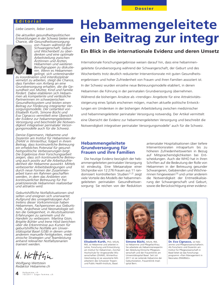 Dossier Editorial Liebe Leserin, lieber Leser Die aktuellen gesundheitspolitischen Entwicklungen in der Schweiz bieten eine Chance, die Gesundheitsversorgung von Frauen während der Schwangerschaft, Geburt und Wochenbett zu überdenken und eine optimale Arbeitsteilung zwischen Ärztinnen und Ärzten, Hebammen und weiteren Berufsgruppen zu diskutieren. Wenn es Hebammen gelingt, sich untereinander zu koordinieren und interdisziplinär vernetzt zu arbeiten, steigt die Chance, dass Familien von Anfang an eine Grundversorgung erhalten, die die Gesundheit von Mutter, Kind und Familie fördert. Dabei etablieren sich Hebammen als kompetente und verlässliche Partnerinnen im schweizerischen Gesundheitssystem und leisten einen Beitrag zur Förderung integrierter Versorgungsmodelle. Der Leitartikel von Elisabeth Kurth, Simone Büchi und Eva Cignacco vermittelt eine Übersicht der Evidenz zur hebammengeleiteten Versorgung und beschreibt die Notwendigkeit integrativer perinataler Versorgungsmodelle auch für die Schweiz. Denise Eigenmann, Hebamme und Dozentin am Institut für Hebammen der ZHAW in Winterthur, folgert in ihrem Beitrag, dass kontinuierliche Betreuung ein erhebliches Potenzial für gesundheitspolitische Verbesserungen birgt. Die Ergebnisse ihrer Forschungsarbeit zeigen, dass sich kontinuierliche Betreuung auch positiv auf die Arbeitszufriedenheit der Hebamme auswirkt. Mittels verbesserter Arbeitsbedingungen und durch neue Formen der Zusammenarbeit kann ein Rahmen geschaffen werden, in dem das Anbieten von kontinuierlicher Betreuung für frei praktizierende Hebammen realisierbar und attraktiv wird. Geburtshilfliche Notfallsituationen sind selten und ereignen sich unerwartet. Aufgrund des unregelmässigen Auftretens dieser Vorkommnisse haben Hebammen, Fachpersonen aus Geburtshilfe, Anästhesie und Neonatologie selten die Gelegenheit, in Akutsituationen Erfahrungen zu sammeln und ihr Handeln zu verbessern. Martina Gisin, Brigitte Bühler und Irene Hösli berichten über die Erkenntnisse aus Kursen für geburtshilfliche Notfälle am Universitätsspital Basel (USB) in denen unter anderem manuelle Fertigkeiten, medizinische Strategien und Teamleistung anhand relevanter Notfallszenarien trainiert werden. Wolfgang Wettstein Redaktor Hebamme.ch 4 Hebamme.ch 10/2011 Sage-femme.ch Hebammengeleitete ein Beitrag zur integr Ein Blick in die internationale Evidenz und deren Umsetz Internationale Forschungsergebnisse weisen darauf hin, dass eine hebammengeleitete Grundversorgung während der Schwangerschaft, der Geburt und des Wochenbetts trotz deutlich reduzierter Interventionsrate mit guten Gesundheitsergebnissen und hoher Zufriedenheit von Frauen und ihren Familien assoziiert ist. In der Schweiz wurden einzelne neue Betreuungsmodelle etabliert, in denen Hebammen die Führung in der perinatalen Grundversorgung übernehmen. Während die bisherigen Ansätze als «trendige» Angebote für eine Attraktivitätssteigerung eines Spitals erscheinen mögen, machen aktuelle politische Entwicklungen ein Umdenken in der bisherigen Arbeitsteilung zwischen medizinischer und hebammengeleiteter perinataler Versorgung notwendig. Der Artikel vermittelt eine Übersicht der Evidenz zur hebammengeleiteten Versorgung und beschreibt die Notwendigkeit integrativer perinataler Versorgungsmodelle1 auch für die Schweiz. Hebammengeleitete Grundversorgung für Frauen und ihre Familien Die heutige Evidenz bezüglich der hebammengeleiteten perinatalen Versorgung ist eindeutig. Eine Metaanalyse einer Stichprobe von 12 276 Frauen aus 11 randomisiert kontrollierten Studien [1,2] zeigt viele Vorteile des Modells der hebammengeleiteten perinatalen Gesundheitsversorgung: Sie reichen von der Reduktion Elisabeth Kurth, PhD, MScN, RM, ist Hebamme und arbeitet in Lehre, Forschung und Entwicklung am Institut für Hebammen, Zürcher Hochschule für Angewandte Wissenschaften (ZHAW), Winterthur. Gleichzeitig ist sie assoziierte Mitarbeiterin des Schweizer Tropenund Public Health-Instituts, Basel. antenataler Hospitalisationen über tiefere Interventionsraten intrapartum bis zu höheren Zufriedenheitswerten in Bezug auf Mitsprachemöglichkeiten bei Entscheidungen. Auch die WHO hat in ihren Schriften auf die Bedeutung der Rolle von Hebammen in der Betreuung gesunder Schwangeren, Gebärenden und Wöchnerinnen hingewiesen [3] und unter anderem die Notwendigkeit der Entmedikalisierung der Schwangerschaft und Geburt, sowie die Berücksichtigung einer evidenz- Simone Büchi, MScN, RM, Dr. Eva Cignacco, ist Heb- ist Hebamme und Pflegefachfrau. Sie arbeitete als Hebammenexpertin der Abteilung Klinische Pflegewissenschaft und der Frauenklinik am Universitätsspital Basel. Seit Juli 2011 ist sie Leitende Hebamme der Geburtsstation, Frauenklinik Inselspital Bern. amme und Pflegewissenschafterin. Als Forscherin und Dozentin am Institut für Pflegewissenschaft in Basel leitet sie das Forschungsprogramm «Pain Management in Neonates (PAMINA)». Betreuung: ierten perinatalen Versorgung? ung in der Schweiz Madlaina Ernesta Jann, 1989, Pontresina « ... dass Frauen selbstbestimmt und aufgeklärt über die Betreuung während der Schwangerschaft und Geburt entscheiden können und ich eine leidenschaftliche, einfühlsame und geduldige Hebamme sein darf.» basierten und familienzentrierten perinatalen Versorgung postuliert [3]. Trotzdem ist die Umsetzung der hebammengeleiteten perinatalen Versorgung im deutschsprachigen Raum noch nicht Teil der allgemeinen Grundversorgung, sondern bleibt auf vereinzelte Angebote beschränkt. Im Hinblick auf die aktuellen gesundheitspolitischen Entwicklungen in vielen westlichen Industrienationen, die von einer höheren Inan1 Integrierte Versorgung (in der Schweiz vor allem als Managed-Care-Modelle bekannt) bezeichnet die Idee einer Versorgungsform im Gesundheitswesen, die eine stärkere Vernetzung der Fachdisziplinen (Hausärzte, Fachärzte, Spitäler) umfasst. Dies mit dem Ziel, die Qualität der Gesundheitsversorgung zu verbessern