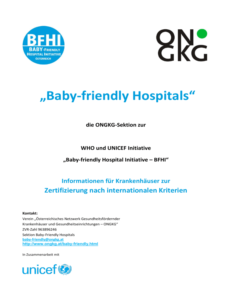„Baby-friendly Hospitals“ die ONGKG-Sektion zur WHO und UNICEF Initiative „Baby-friendly Hospital Initiative – BFHI“ Informationen für Krankenhäuser zur Zertifizierung nach internationalen Kriterien Kontakt: Verein „Österreichisches Netzwerk Gesundheitsfördernder Krankenhäuser und Gesundheitseinrichtungen – ONGKG“ ZVR-Zahl 963896246 Sektion Baby-Friendly Hospitals [email protected] http://www.ongkg.at/baby-friendly.html In Zusammenarbeit mit 1 Unterstützt durch 2 INHALT Warum ist Stillen wichtig? .......................................................................................................................................... 4 Die WHO / UNICEF-Initiative „Baby-friendly Hospitals“ ............................................................................................. 5 Was bewirken Baby-friendly Hospitals? .................................................................................................................... 5 Die ONGKG-Sektion „Baby-friendly Hospitals“ .......................................................................................................... 6 Wie wird das Stillen konkret gefördert? ..................................................................................................................... 6 Die „Zehn Schritte zum erfolgreichen Stillen“ ............................................................................................................ 6 Internationaler Kodex für die Vermarktung von Muttermilchersatzprodukten (WHO-Kodex) .................................. 14 Mütterfreundlichkeit – natürliche Geburt .................................................................................................................. 15 Der Weg zum „Baby-friendly Hospital“ – Ablauf des Zertifizierungs- und Begutachtungsprozesses ...................... 16 Kosten für Zertifizierung und Zwischenbegutachtung .............................................................................................. 21 Weiterführende Informationen im Internet ............................................................................................................... 23 Literaturhinweise...................................................................................................................................................... 24 3 Baby-friendly Hospitals: Informationen für Krankenhäuser W arum ist Stillen wichtig? Stillen ist die natürlichste und bestmögliche Ernährung für einen Säugling und stärkt die Verbindung zwischen Mutter und Kind. Die vielen Vorteile des Stillens für Mütter wie Kinder sind gut belegt: Stillen ist gut für die Figur der Mutter: da die mütterliche Milchproduktion Energie verbraucht, kann dies eine erwünschte Gewichtsabnahme nach der Schwangerschaft unterstützen. Muttermilch ist die von Natur aus vorgesehene Nahrung für einen Säugling und ideal auf die Bedürfnisse des heranwachsenden Kindes abgestimmt. Stillen ist umweltfreundlich und spart Geld, da weder aufwändige Fertigungen und Verpackungen noch Lagerung oder Transport benötigt werden. Stillen ermöglicht Kindern eine gesunde körperliche Entwicklung und fördert die Entwicklung des kindlichen Immunsystems. Gestillte Kinder erkranken seltener an Infektionen des Magen-Darm-Traktes, der Luftwege, des Mittelohrs, der Harnwege und der Hirnhäute. Trotzdem werden weltweit immer weniger Babys gestillt bzw. immer früher abgestillt. Gleichzeitig wird viel früher begonnen, mit industriell erzeugter Säuglingsnahrung zuzufüttern. Wichtige Kenntnisse und Erfahrungen mit dem Stillen und Stilltechniken werden immer seltener von Generation zu Generation weitergegeben. Das Stillen hat seine Selbstverständlichkeit verloren. Als Folge sterben jährlich vor allem in den Entwicklungsländern 1,5 Millionen Kinder an Krankheiten, die durch regelmäßiges Stillen vermieden werden könnten. In den entwickelten Ländern entstehen hohe Folgekosten durch Stilldefizite (z.B. medizinische Behandlungskosten). Auch die Gesundheit der Mütter wird gefördert: Stillen senkt das Risiko, an Brustkrebs, Eierstockkrebs, Wochenbettdepressionen oder an Diabetes mellitus (nach vorhandener Schwangerschaftsdiabetes) zu erkranken. Die Bindung zwischen Mutter und Kind wird gefördert und schon früh gefestigt. Muttermilch ist immer verfügbar, gebrauchsfertig und richtig temperiert. Nachtmahlzeiten gestalten sich unkompliziert und brauchen wenig Zeit. Auch Unternehmungen mit dem Baby sind einfacher, da Babys unabhängig von diversen Utensilien, Wasser und Strom versorgt werden können. Stillen und Stillförderung gehören zu den kostengünstigsten und wirksamsten Präventivmaßnahmen im Gesundheits- und Sozialbereich! Die WHO empfiehlt daher, dass Säuglinge in den ersten sechs Lebensmonaten nach Möglichkeit ausschließlich gestillt werden. Dazu sollten die Mütter jede notwendige Unterstützung erhalten. Anschließend kann langsam und schrittweise geeignete Beikost eingeführt und weitergestillt werden. Das Stillen kann bis ins zweite Lebensjahr – und wenn Mutter und Kind es wünschen, darüber hinaus – weitergeführt werden. Durch die beim Stillen und den damit verbundenen Saugreiz ausgeschütteten Hormone kommt es zu einer schnelleren Rückbildung der Gebärmutter. Der hormonelle Einfluss trägt auch zur Blutstillung und zur Verminderung des Wochenflusses bei. 4 Baby-friendly Hospitals: Informationen für Krankenhäuser D ie WHO / UNICEF-Initiative „Baby-friendly Hospitals“ Damit die Grundlagen dafür bereits in der Schwangerschaft und rund um die Geburt gelegt werden, wurde ein Zertifizierungsprogramm mit 10 Schritten zur Förderung des Stillens entwickelt, das sich in den letzten 20 Jahren weltweit bewährt hat. BFHI zeichnet Entbindungseinrichtungen aus, die gemäß internationalen Bewertungskriterien die „Zehn Schritte zum erfolgreichen Stillen“ und den „Internationalen Kodex für die Vermarktung von Muttermilchersatzprodukten“ erfü