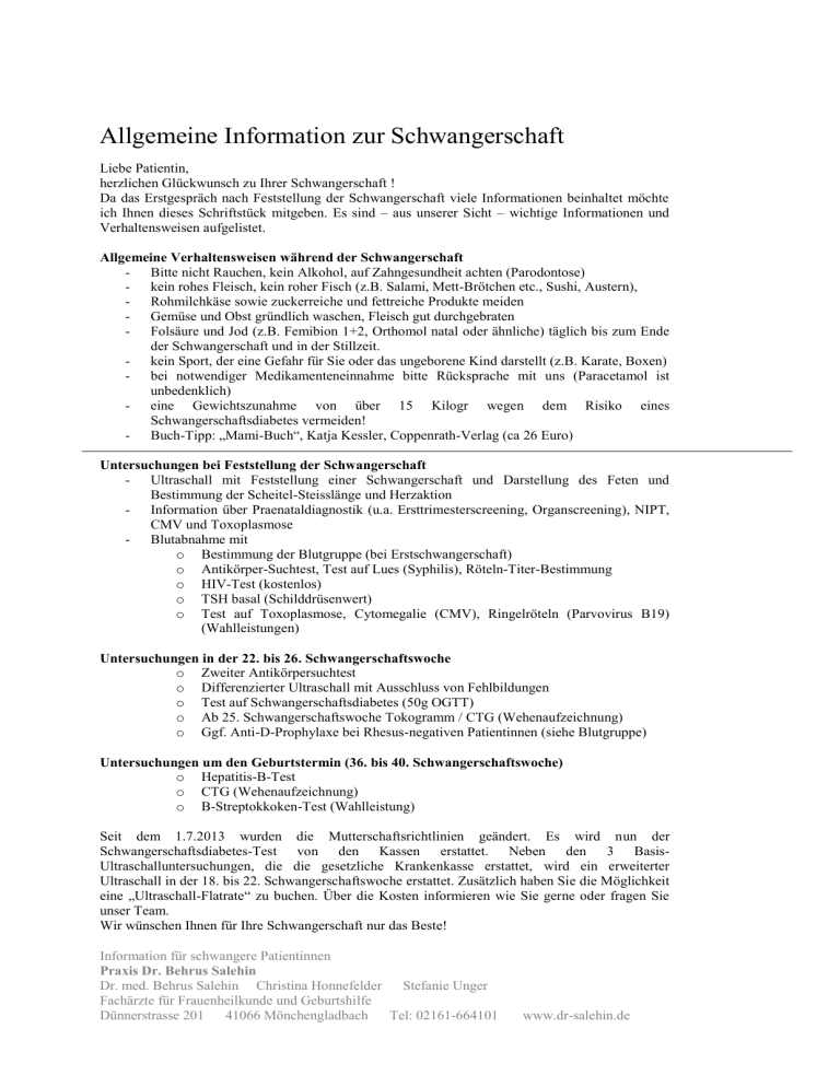Allgemeine Information zur Schwangerschaft Liebe Patientin, herzlichen Glückwunsch zu Ihrer Schwangerschaft ! Da das Erstgespräch nach Feststellung der Schwangerschaft viele Informationen beinhaltet möchte ich Ihnen dieses Schriftstück mitgeben. Es sind – aus unserer Sicht – wichtige Informationen und Verhaltensweisen aufgelistet. Allgemeine Verhaltensweisen während der Schwangerschaft - Bitte nicht Rauchen, kein Alkohol, auf Zahngesundheit achten (Parodontose) - kein rohes Fleisch, kein roher Fisch (z.B. Salami, Mett-Brötchen etc., Sushi, Austern), - Rohmilchkäse sowie zuckerreiche und fettreiche Produkte meiden - Gemüse und Obst gründlich waschen, Fleisch gut durchgebraten - Folsäure und Jod (z.B. Femibion 1+2, Orthomol natal oder ähnliche) täglich bis zum Ende der Schwangerschaft und in der Stillzeit. - kein Sport, der eine Gefahr für Sie oder das ungeborene Kind darstellt (z.B. Karate, Boxen) - bei notwendiger Medikamenteneinnahme bitte Rücksprache mit uns (Paracetamol ist unbedenklich) - eine Gewichtszunahme von über 15 Kilogr wegen dem Risiko eines Schwangerschaftsdiabetes vermeiden! - Buch-Tipp: „Mami-Buch“, Katja Kessler, Coppenrath-Verlag (ca 26 Euro) Untersuchungen bei Feststellung der Schwangerschaft - Ultraschall mit Feststellung einer Schwangerschaft und Darstellung des Feten und Bestimmung der Scheitel-Steisslänge und Herzaktion - Information über Praenataldiagnostik (u.a. Ersttrimesterscreening, Organscreening), NIPT, CMV und Toxoplasmose - Blutabnahme mit o Bestimmung der Blutgruppe (bei Erstschwangerschaft) o Antikörper-Suchtest, Test auf Lues (Syphilis), Röteln-Titer-Bestimmung o HIV-Test (kostenlos) o TSH basal (Schilddrüsenwert) o Test auf Toxoplasmose, Cytomegalie (CMV), Ringelröteln (Parvovirus B19) (Wahlleistungen) Untersuchungen in der 22. bis 26. Schwangerschaftswoche o Zweiter Antikörpersuchtest o Differenzierter Ultraschall mit Ausschluss von Fehlbildungen o Test auf Schwangerschaftsdiabetes (50g OGTT) o Ab 25. Schwangerschaftswoche Tokogramm / CTG (Wehenaufzeichnung) o Ggf. Anti-D-Prophylaxe bei Rhesus-negativen Patientinnen (siehe Blutgruppe) Untersuchungen um den Geburtstermin (36. bis 40. Schwangerschaftswoche) o Hepatitis-B-Test o CTG (Wehenaufzeichnung) o B-Streptokkoken-Test (Wahlleistung) Seit dem 1.7.2013 wurden die Mutterschaftsrichtlinien geändert. Es wird nun der Schwangerschaftsdiabetes-Test von den Kassen erstattet. Neben den 3 BasisUltraschalluntersuchungen, die die gesetzliche Krankenkasse erstattet, wird ein erweiterter Ultraschall in der 18. bis 22. Schwangerschaftswoche erstattet. Zusätzlich haben Sie die Möglichkeit eine „Ultraschall-Flatrate“ zu buchen. Über die Kosten informieren wie Sie gerne oder fragen Sie unser Team. Wir wünschen Ihnen für Ihre Schwangerschaft nur das Beste! Information für schwangere Patientinnen Praxis Dr. Behrus Salehin Dr. med. Behrus Salehin Christina Honnefelder Stefanie Unger Fachärzte für Frauenheilkunde und Geburtshilfe Dünnerstrasse 201 41066 Mönchengladbach Tel: 02161-664101 www.dr-salehin.de Information zur Cytomegalie (CMV) Die Cytomegalie ist eine Infektionserkrankung, die durch das Cytomegalovirus (CMV) verursacht wird. Die Infektion kann auf einer Vielzahl von Wegen erfolgen, denn das Cytomegalovirus wird von infizierten Menschen mit den Körperflüssigkeiten wie Speichel, Tränen, Muttermilch, Urin, Sperma oder Vaginalsekret ausgeschieden. Eine Erstinfektion verläuft bei gesunden Erwachsenen in den meisten Fällen ohne oder nur mit geringen Krankheitssymptomen. Mögliche Anzeichen können Fieber, eine Schwellung der Lymphknoten, Kopf- und Gliederschmerzen sein. In seltenen Fällen kann es zu Flankenschmerzen und Abgeschlagenheit kommen. Da die Cytomegalie-Infektion für Mutter und Kind meist ohne Symptome verläuft, wird sie oft nicht erkannt. Treten erst später beim Kind Symptome auf, ist ein Zusammenhang mit einer Infektion vor oder während der Schwangerschaft nicht mehr so offensichtlich. Eine Infektion mit dem Cytomegalievirus ist für die Schwangere selbst ungefährlich, da ihr abwehrbereites Immunsystem gut mit dem Virus umgehen kann. Im Falle einer Erstinfektion der Schwangeren bedeutet jedoch dasselbe Virus für das Ungeborene eine ernstzunehmende Gefahr: Da sein unreifes Immunsystem noch keine Zeit hatte, sich im jahrelangen Umgang mit Erregern zu trainieren und zu stärken, kann das Virus bei ihm schwere Schäden (z.B. Hirnschädigungen) verursachen. Deshalb kommt der Vorbeugung und der Therapie der konnatalen Cytomegalie eine besondere Bedeutung zu. Bei Bestehen einer Schwangerschaft oder bei Kinderwunsch sollten Frauen ihr individuelles Risikoprofil durch einen Antikörpertest bestimmen lassen, um im Falle einer Erstinfektion und damit einer möglichen Übertragung des Cytomegalovirus auf das ungeborene Kind vorbeugen zu können. Die Antikörper-Testung sollte bei Feststellung der Schwangerschaft erfolgen und ist eine Wahlleistung. Sie kostet ca 40 Euro und wird von unserem Labor in Rechnung gestellt. Weitere Informationen in unserer Praxis oder unter www.icon-cmv.de Ich wünsche die Laboruntersuchung auf CMV (Cytomegalie-Virus) Ja Nein Bitte bringen Sie dieses Schreiben unterschrieben wieder mit in die Praxis. Mönchengladbach, den _______________ Name der Patientin _______________ Unterschrift Patientin ________________ Information für schwangere Patientinnen Praxis Dr. Behrus Salehin Dr. med. Behrus Salehin Christina Honnefelder Stefanie Unger Dr.med. Marion Wolter (WBA) Fachärzte für Frauenheilkunde und Geburtshilfe Dünnerstrasse 201 41066 Mönchengladbach Tel: 02161-664101 www.dr-salehin.de 2 Information über nicht invasive Pränatale Diagnostik Früher Fehlbildungsausschluss Bei nicht-invasiven (= nicht in den Körper der Schwangeren eindringenden) Untersuchungen, wie einer Untersuchung mütterlichen Bluts und auch bei einer Ultraschalluntersuchung bestehen nach heutigem Wissensstand keine Risiken für das Ungeborene und seine Mutte