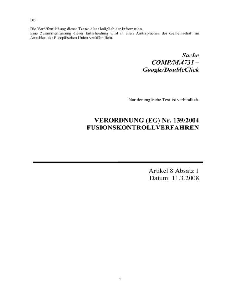DE Die Veröffentlichung dieses Textes dient lediglich der Information. Eine Zusammenfassung dieser Entscheidung wird in allen Amtssprachen der Gemeinschaft im Amtsblatt der Europäischen Union veröffentlicht. Sache COMP/M.4731 – Google/DoubleClick Nur der englische Text ist verbindlich. VERORDNUNG (EG) Nr. 139/2004 FUSIONSKONTROLLVERFAHREN Artikel 8 Absatz 1 Datum: 11.3.2008 1 KOMMISSION DER EUROPÄISCHEN GEMEINSCHAFTEN Brüssel, den 11.3.2008 K(2008) 927 NICHTVERTRAULICHE FASSUNG ENTSCHEIDUNG DER KOMMISSION vom 11.3.2008 zur Feststellung der Vereinbarkeit eines Zusammenschlusses mit dem Gemeinsamen Markt und dem EWR-Abkommen (Sache COMP/M.4731 – Google/ DoubleClick) (Nur der englische Text ist verbindlich) 2 Inhaltsverzeichnis 1 EINLEITUNG ........................................................................................................... 4 2 DIE BETEILIGTEN UNTERNEHMEN ................................................................ 5 3 DER ZUSAMMENSCHLUSS................................................................................... 6 4 GEMEINSCHAFTSWEITE BEDEUTUNG............................................................ 6 5 BESCHREIBUNG DES MARKTES....................................................................... 6 6 RELEVANTE MÄRKTE ........................................................................................ 18 6.1. Relevante Produktmärkte ............................................................................ 18 6.2. 7 6.1.1. Bereitstellung von Online-Werbefläche ........................................ 18 6.1.2. Vermittlung von Online-Werbung................................................. 22 6.1.3. Bereitstellung von Online-Display-Adserving-Technologie ........ 26 Räumlich relevanter Markt........................................................................... 27 6.2.1. Bereitstellung von Online-Werbefläche ........................................ 27 6.2.2. Vermittlung von Online-Werbung................................................. 28 6.2.3. Bereitstellung von Online-Display-Adserving-Technologie ........ 28 WETTBEWERBSRECHTLICHE WÜRDIGUNG............................................... 29 7.1. Stellung der beteiligten Unternehmen auf den relevanten Märkten............ 29 7.1.1. Google ............................................................................................... 29 7.1.2. DoubleClick...................................................................................... 39 7.2. Horizontale Effekte ....................................................................................... 59 7.2.1. Bestehender Wettbewerb................................................................ 59 7.2.2. Potenzieller Wettbewerb................................................................. 69 7.3. Nicht-horizontale Effekte.............................................................................. 84 7.3.1. Abschottungsstrategien auf Basis der Marktposition von DoubleClick im Bereich Adserving................................................ 85 7.3.2. Abschottungsstrategien auf Basis der Marktposition von Google in den Bereichen suchgebundene Werbung und Werbevermittlung ......................................................................... 100 7.3.3. Abschottung auf Basis einer Zusammenlegung der Vermögenswerte von Google und DoubleClick .......................... 111 Entscheidung der Kommission vom 11.3.2008 zur Feststellung der Vereinbarkeit eines Zusammenschlusses mit dem Gemeinsamen Markt und dem EWR-Abkommen (Sache COMP/M.4731 – Google/DoubleClick) (Nur der englische Text ist verbindlich) (Text von Bedeutung für den EWR) DIE KOMMISSION DER EUROPÄISCHEN GEMEINSCHAFTEN – gestützt auf den Vertrag zur Gründung der Europäischen Gemeinschaft, gestützt auf das Abkommen über den Europäischen Wirtschaftsraum, insbesondere Artikel 57, gestützt auf die Verordnung (EG) Nr. 139/2004 des Rates vom 20. Januar 2004 über die Kontrolle von Unternehmenszusammenschlüssen1, insbesondere Artikel 8 Absatz 1, gestützt auf den Beschluss der Kommission vom 13. November 2007 zur Einleitung eines Verfahrens in dieser Sache, gestützt auf die Stellungnahme Unternehmenszusammenschlüsse, des Beratenden Ausschusses für gestützt auf den Abschlussbericht der Anhörungsbeauftragten in dieser Sache, in Erwägung nachstehender Gründe: 1 EINLEITUNG 1. Am 21. September 2007 ist aufgrund einer Verweisung nach Artikel 4 Absatz 5 der Verordnung (EG) Nr. 139/2004 des Rates (im Folgenden "Fusionskontrollverordnung" genannt) die Anmeldung eines Zusammenschlusses nach Artikel 4 bei der Kommission eingegangen. Danach ist Folgendes beabsichtigt: Das Unternehmen Google Inc. ("Google", USA) erwirbt im Sinne von Artikel 3 Absatz 1 Buchstabe b der Verordnung durch Erwerb von 1 ABl. L 24 vom 29.1.2004, S. 1 4 Anteilen die Kontrolle über die Gesamtheit des Unternehmens DoubleClick Inc. ("DoubleClick", USA). 2. Am 13. November 2007 stellte die Kommission fest, dass das Rechtsgeschäft Anlass zu ernsten Bedenken hinsichtlich der Vereinbarkeit mit dem Gemeinsamen Markt und dem EWR-Abkommen gibt, und leitete daraufhin das Verfahren nach Artikel 6 Absatz 1 Buchstabe c der Fusionskontrollverordnung ein2. 3. Nach einer zweiten Untersuchung kam die Kommission zu der Feststellung, dass der Zusammenschluss wahrscheinlich keine erhebliche Behinderung des wirksamen Wettbewerbs auf dem Gemeinsamen Markt oder auf einem wesentlichen Teil desselben zur Folge haben wird und daher nach Artikel 8 Absatz 1 und Artikel 10 Absatz 2 der Fusionskontrollverordnung sowie Artikel 57 des EWR-Abkommens für mit dem Gemeinsamen Markt und dem EWR-Abkommen vereinbar zu erklären ist. 2 DIE BETEILIGTEN UNTERNEHMEN 4. Google, ein US-amerikanisches und an der Börse Nasdaq notiertes Unternehmen, betreibt die heute meistgenutzte Internetsuchmaschine und stellt dem Endverbraucher deren Suchdienste kostenlos zur Verfügung. Seit einiger Zeit bietet das Unternehmen auch Online-Werb