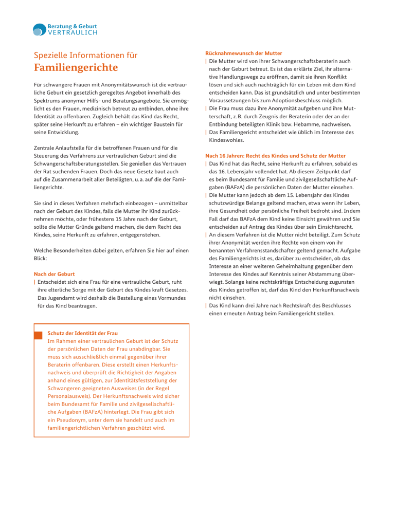 Beratung & Geburt VERTRAULICH Spezielle Informationen für Familiengerichte Für schwangere Frauen mit Anonymitätswunsch ist die vertrauliche Geburt ein gesetzlich geregeltes Angebot innerhalb des Spektrums anonymer Hilfs- und Beratungsangebote. Sie ermöglicht es den Frauen, medizinisch betreut zu entbinden, ohne ihre Identität zu offenbaren. Zugleich behält das Kind das Recht, später seine Herkunft zu erfahren – ein wichtiger Baustein für seine Entwicklung. Zentrale Anlaufstelle für die betroffenen Frauen und für die Steuerung des Verfahrens zur vertraulichen Geburt sind die Schwangerschaftsberatungsstellen. Sie genießen das Vertrauen der Rat suchenden Frauen. Doch das neue Gesetz baut auch auf die Zusammenarbeit aller Beteiligten, u. a. auf die der Familiengerichte. Sie sind in dieses Verfahren mehrfach einbezogen – unmittelbar nach der Geburt des Kindes, falls die Mutter ihr Kind zurücknehmen möchte, oder frühestens 15 Jahre nach der Geburt, sollte die Mutter Gründe geltend machen, die dem Recht des Kindes, seine Herkunft zu erfahren, entgegenstehen. Welche Besonderheiten dabei gelten, erfahren Sie hier auf einen Blick: Nach der Geburt || Entscheidet sich eine Frau für eine vertrauliche Geburt, ruht ihre elterliche Sorge mit der Geburt des Kindes kraft Gesetzes. Das Jugendamt wird deshalb die Bestellung eines Vormundes für das Kind beantragen. Schutz der Identität der Frau Im Rahmen einer vertraulichen Geburt ist der Schutz der persönlichen Daten der Frau unabdingbar. Sie muss sich ausschließlich einmal gegenüber ihrer Beraterin offenbaren. Diese erstellt einen Herkunftsnachweis und überprüft die Richtigkeit der Angaben anhand eines gültigen, zur Identitätsfeststellung der Schwangeren geeigneten Ausweises (in der Regel Personalausweis). Der Herkunftsnachweis wird sicher beim Bundesamt für Familie und zivilgesellschaftliche Aufgaben (BAFzA) hinterlegt. Die Frau gibt sich ein Pseudonym, unter dem sie handelt und auch im familiengerichtlichen Verfahren geschützt wird. Rücknahmewunsch der Mutter || Die Mutter wird von ihrer Schwangerschaftsberaterin auch nach der Geburt betreut. Es ist das erklärte Ziel, ihr alternative Handlungswege zu eröffnen, damit sie ihren Konflikt lösen und sich auch nachträglich für ein Leben mit dem Kind entscheiden kann. Das ist grundsätzlich und unter bestimmten Voraussetzungen bis zum Adoptionsbeschluss möglich. || Die Frau muss dazu ihre Anonymität aufgeben und ihre Mutterschaft, z.B. durch Zeugnis der Beraterin oder der an der Entbindung beteiligten Klinik bzw. Hebamme, nachweisen. || Das Familiengericht entscheidet wie üblich im Interesse des Kindeswohles. Nach 16 Jahren: Recht des Kindes und Schutz der Mutter || Das Kind hat das Recht, seine Herkunft zu erfahren, sobald es das 16. Lebensjahr vollendet hat. Ab diesem Zeitpunkt darf es beim Bundesamt für Familie und zivilgesellschaftliche Aufgaben (BAFzA) die persönlichen Daten der Mutter einsehen. || Die Mutter kann jedoch ab dem 15. Lebensjahr des Kindes schutzwürdige Belange geltend machen, etwa wenn ihr Leben, ihre Gesundheit oder persönliche Freiheit bedroht sind. Indem Fall darf das BAFzA dem Kind keine Einsicht gewähren und Sie entscheiden auf Antrag des Kindes über sein Einsichtsrecht. || An diesem Verfahren ist die Mutter nicht beteiligt. Zum Schutz ihrer Anonymität werden ihre Rechte von einem von ihr benannten Verfahrensstandschafter geltend gemacht. Aufgabe des Familiengerichts ist es, darüber zu entscheiden, ob das Interesse an einer weiteren Geheimhaltung gegenüber dem Interesse des Kindes auf Kenntnis seiner Abstammung überwiegt. Solange keine rechtskräftige Entscheidung zugunsten des Kindes getroffen ist, darf das Kind den Herkunftsnachweis nicht einsehen. || Das Kind kann drei Jahre nach Rechtskraft des Beschlusses einen erneuten Antrag beim Familiengericht stellen.