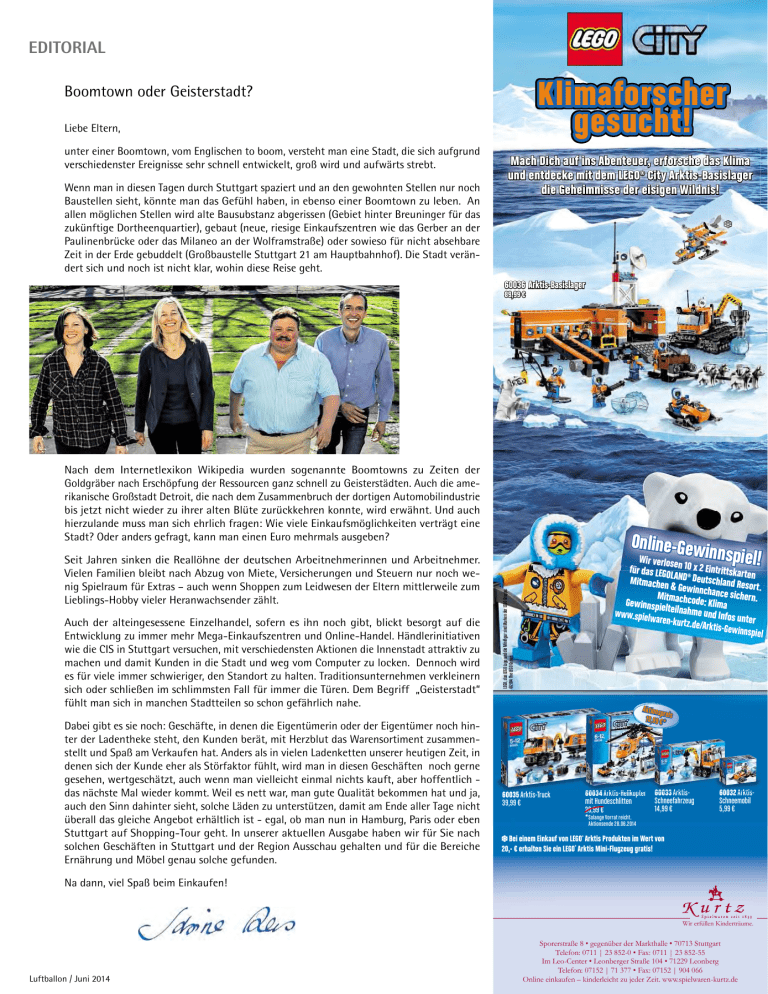 EDITORIAL Klimaforscher gesucht! Boomtown oder Geisterstadt? Liebe Eltern, unter einer Boomtown, vom Englischen to boom‚ versteht man eine Stadt, die sich aufgrund verschiedenster Ereignisse sehr schnell entwickelt, groß wird und aufwärts strebt. Wenn man in diesen Tagen durch Stuttgart spaziert und an den gewohnten Stellen nur noch Baustellen sieht, könnte man das Gefühl haben, in ebenso einer Boomtown zu leben. An allen möglichen Stellen wird alte Bausubstanz abgerissen (Gebiet hinter Breuninger für das zukünftige Dortheenquartier), gebaut (neue, riesige Einkaufszentren wie das Gerber an der Paulinenbrücke oder das Milaneo an der Wolframstraße) oder sowieso für nicht absehbare Zeit in der Erde gebuddelt (Großbaustelle Stuttgart 21 am Hauptbahnhof). Die Stadt verändert sich und noch ist nicht klar, wohin diese Reise geht. Mach Dich auf ins Abenteuer, erforsche das Klima und entdecke mit dem LEGO® City Arktis-Basislager die Geheimnisse der eisigen Wildnis! ❄ 60036 Arktis-Basislager © Jim Martin 89,99 € Nach dem Internetlexikon Wikipedia wurden sogenannte Boomtowns zu Zeiten der Goldgräber nach Erschöpfung der Ressourcen ganz schnell zu Geisterstädten. Auch die amerikanische Großstadt Detroit, die nach dem Zusammenbruch der dortigen Automobilindustrie bis jetzt nicht wieder zu ihrer alten Blüte zurückkehren konnte, wird erwähnt. Und auch hierzulande muss man sich ehrlich fragen: Wie viele Einkaufsmöglichkeiten verträgt eine Stadt? Oder anders gefragt, kann man einen Euro mehrmals ausgeben? Auch der alteingesessene Einzelhandel, sofern es ihn noch gibt, blickt besorgt auf die Entwicklung zu immer mehr Mega-Einkaufszentren und Online-Handel. Händlerinitiativen wie die CIS in Stuttgart versuchen, mit verschiedensten Aktionen die Innenstadt attraktiv zu machen und damit Kunden in die Stadt und weg vom Computer zu locken. Dennoch wird es für viele immer schwieriger, den Standort zu halten. Traditionsunternehmen verkleinern sich oder schließen im schlimmsten Fall für immer die Türen. Dem Begriff „Geisterstadt“ fühlt man sich in manchen Stadtteilen so schon gefährlich nahe. Dabei gibt es sie noch: Geschäfte, in denen die Eigentümerin oder der Eigentümer noch hinter der Ladentheke steht, den Kunden berät, mit Herzblut das Warensortiment zusammenstellt und Spaß am Verkaufen hat. Anders als in vielen Ladenketten unserer heutigen Zeit, in denen sich der Kunde eher als Störfaktor fühlt, wird man in diesen Geschäften noch gerne gesehen, wertgeschätzt, auch wenn man vielleicht einmal nichts kauft, aber hoffentlich das nächste Mal wieder kommt. Weil es nett war, man gute Qualität bekommen hat und ja, auch den Sinn dahinter sieht, solche Läden zu unterstützen, damit am Ende aller Tage nicht überall das gleiche Angebot erhältlich ist - egal, ob man nun in Hamburg, Paris oder eben Stuttgart auf Shopping-Tour geht. In unserer aktuellen Ausgabe haben wir für Sie nach solchen Geschäften in Stuttgart und der Region Ausschau gehalten und für die Bereiche Ernährung und Möbel genau solche gefunden. nnspiel! Wir verlose für das LEGO n 10 x 2 Eintrittskarte LA Mitmachen ND® Deutschland Reson & Gewinnch ance sichernrt. Mit . Gewinnspie machcode: Klima lt e il n a h m eu www.spielw aren-kurtz.d nd Infos unter e/Arktis-Gew innspiel LEGO, das LEGO Logo und die Minifigur sind Marken der LEGO Gruppe. ©2014 The LEGO Group. Seit Jahren sinken die Reallöhne der deutschen Arbeitnehmerinnen und Arbeitnehmer. Vielen Familien bleibt nach Abzug von Miete, Versicherungen und Steuern nur noch wenig Spielraum für Extras – auch wenn Shoppen zum Leidwesen der Eltern mittlerweile zum Lieblings-Hobby vieler Heranwachsender zählt. Online-Gewi Aktionsp re 19,99 €* is 60035 Arktis-Truck 39,99 € 60034 Arktis-Helikopter 60033 ArktisSchneefahrzeug mit Hundeschlitten 14,99 € 29,99 € *Solange Vorrat reicht. 60032 ArktisSchneemobil 5,99 € Aktionsende 28.06.2014 " Bei einem Einkauf von LEGO® Arktis Produkten im Wert von 20,- € erhalten Sie ein LEGO® Arktis Mini-Flugzeug gratis! Na dann, viel Spaß beim Einkaufen! Wir erfüllen Kinderträume. Luftballon / Juni 2014 Sporerstraße 8 • gegenüber der Markthalle • 70713 Stuttgart Telefon: 0711 | 23 852-0 • Fax: 0711 | 23 852-55 Im Leo-Center • Leonberger Straße 104 • 71229 Leonberg Telefon: 07152 | 71 377 • Fax: 07152 | 904 066 Online einkaufen – kinderleicht zu jeder Zeit. www.spielwaren-kurtz.de3 INHALT 12 Aktuell Großer Run auf G9-Gymnasien Im Kessel wimmelt´s: ein Stuttgart-Bilderbuch Deutsch-Türkisches Familienfest Verrücktes Badewannenrennen im Fildorado Aus der Online-Redaktion Pferde-Rallye durch Stuttgart - neues Kartenspiel Hock am Turm - Fest der Musikhochschule 5. Vegan Street Day Opstapje - im EKiZ Lilalu - Neues Ferienprogramm der Johanniter Reihe Kinderparadiese: Besuch auf der Jugendfarm Elsental 5 6 6 6 7 7 8 8 8 8 9 Stuttgart und Region Sommerfest im F3 20 Jahre PTE in Waiblingen © Barmer GEK Welzheimer Römertage Selbsthilfegruppe für Eltern von Kindern mit Autismus 10 10 11 11 Rund um die Geburt Über den richtigen Zeitpunkt für ein zweites Kind Vater werden braucht Zeit und Vorbereitung Schwangerschaftsbetreuung im Ausland - Frauen berichten Der erste Kinderarzt für´s Baby - Tipps Familienhebammen helfen im ersten Lebensjahr Gibt es einen richtigen Zeitpunkt für ein zweites Kind? Und wie läuft die Schwangerenversorgung und Geburt in anderen Ländern? Diese Themen und mehr finden Sie bei „Rund um die Geburt“ ab Seite 12. Kultur Musical: Die Cats schnurren in S-Vaihingen Kinder-Kunst-Tour in den Stadtteilen Theater Atelier: Ein neues Theater am Stöckach 22 23 23 Kultur regional 24 26 26 Freilufttheatersaison: Ein Überblick Ritterspiele in Horb - Verlosung! Kinderuni Ludwigsburg: Faszination Fußball © Naturgut 30 12 14 16 18 20 Buchtipps Cristina Rieck stellt neue Bücher für junge Fußballfans vor 27 Die kunterbunte Kinderzeitung Unsere Kinderseiten mit Luftikus und 