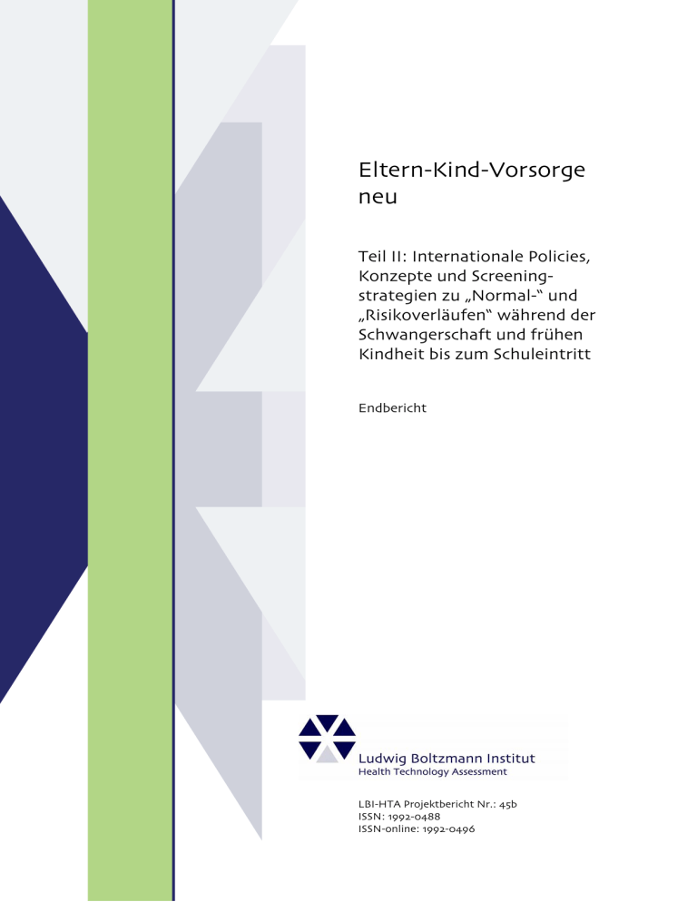 Eltern-Kind-Vorsorge neu Teil II: Internationale Policies, Konzepte und Screeningstrategien zu „Normal-“ und „Risikoverl ufen“ w hrend der Schwangerschaft und fr hen Kindheit bis zum Schuleintritt Endbericht LBI-HTA Projektbericht Nr.: 45b ISSN: 1992-0488 ISSN-online: 1992-0496 Eltern-Kind-Vorsorge neu Teil II: Internationale Policies, Konzepte und Screeningstrategien zu „Normal-“ und „Risikoverla¨ufen“ wa¨hrend der Schwangerschaft und fru¨hen Kindheit bis zum Schuleintritt Endbericht Wien, Ma¨rz 2011 Projektteam Projektleitung: Dr.in med. Brigitte Piso, MPH Projektbearbeitung: Mag. phil. Dr. phil. Roman Winkler, MSc Projektbeteiligung Systematische Literatursuche: Tarquin Mittermayr, BA Handsuche und Informationsaufbereitung: Imke Schall, Bakk. Externe Begutachtung: Dr.in Reli Mechtler, Leiterin der Abteilung Gesundheitssystemforschung am Institut f r Pflege- und Gesundheitssystemforschung (IPG) der Johannes Kepler Universit t, Linz Interne Begutachtung: Priv.-Doz.in Dr.in phil. Claudia Wild Dr.in med. Brigitte Piso, MPH Dr.in rer. soc. oec. Ingrid Zechmeister, MA Danksagung F r die Erstellung dieses Berichts waren wir auf die Daten von zahlreichen Institutionen angewiesen. Wir m chten uns an dieser Stelle bei allen ExpertInnen in sterreich und international bedanken, die uns diese Daten und Informationen mit teilweise gro em Aufwand zur Verf gung gestellt haben. Zudem gilt unser Dank den TeilnehmerInnen am LBI-HTA ExpertInnenworkshop „ElternKind Vorsorge neu“ (23.06.2010, Wien) sowie den internationalen TeilnehmerInnen an der LBIHTA Fragebogenuntersuchung. Korrespondenz: Roman Winkler, [email protected] Dieser Bericht soll folgenderma en zitiert werden/The report should be referenced as follows: Winkler, Roman. Eltern Kind Vorsorge neu, Teil II internationale Policies, Konzepte und Screeningstrategien zu „Normal-“ und „Risikoverl ufen“ w hrend der Schwangerschaft und der fr hen Kindheit bis zum Schuleintritt. HTA-Projektbericht. 2011; Nr. 45b. Interessenskonflikt Alle beteiligten AutorInnen erkl ren, dass keine Interessenskonflikte im Sinne der Uniform Requirements of Manuscripts Statement of Medical Journal Editors (www.icmje.org) bestehen Im Auftrag des Bundesministeriums für Gesundheit IMPRESSUM Medieninhaber und Herausgeber: Ludwig Boltzmann Gesellschaft GmbH Nu dorferstr. 64, 6. Stock, A-1090 Wien http://www.lbg.ac.at/de/lbg/impressum F r den Inhalt verantwortlich: Ludwig Boltzmann Institut f r Health Technology Assessment (LBI-HTA) Garnisongasse 7/20, A-1090 Wien http://hta.lbg.ac.at/ Die LBI-HTA-Projektberichte erscheinen unregelm ig und dienen der Ver ffentlichung der Forschungsergebnisse des Ludwig Boltzmann Instituts f r Health Technology Assessment. Die Berichte erscheinen in geringer Auflage im Druck und werden ber das Internetportal „http://eprints.hta.lbg.ac.at“ der ffentlichkeit zur Verf gung gestellt: LBI-HTA Projektbericht Nr.: 45b ISSN: 1992-0488 ISSN-online: 1992-0496 © 2011 LBI-HTA – Alle Rechte vorbehalten Inhalt Zusammenfassung .............................................................................................................................................. 7 Summary.............................................................................................................................................................. 9 1 Einleitung .................................................................................................................................................... 11 1.1 1.2 1.3 2 Methodologie............................................................................................................................................... 15 2.1 2.2 2.3 2.4 3 3.3 Policy-Ansätze zu Eltern-Kind Routinescreenings.................................................................................. 26 Policy-Ansätze zur Identifizierung und Versorgung von vulnerablen Eltern-Kind Gruppen ............. 27 Pränatale Routinescreenings für Schwangere im internationalen Vergleich ........................................ 31 5.1 5.2 5.3 5.4 5.5 5.6 5.7 5.8 6 Strategien auf supranationaler Ebene....................................................................................................... 19 Strategien auf nationaler Ebene ................................................................................................................ 19 3.2.1 Verfügbarkeit von „Maternal und Child Health Booklets“ ..............................................................20 3.2.2 Elektronische „Maternal und Child Health Booklets“......................................................................21 Internationale Evaluierungen und Forschungsnetzwerke ...................................................................... 22 3.3.1 Evaluierungserfahrungen aus Großbritannien und Norwegen ........................................................22 3.3.2 Laufende Evaluierungen in Deutschland ...........................................................................................23 3.3.3 Internationale Forschung zu Eltern-Kind Screenings.......................................................................24 Politikgestaltung zu Eltern-Kind Screeningprogrammen....................................................................... 25 4.1 4.2 5 Zielsetzungen.............................................................................................................................................. 15 Länderanalyse............................................................................................................................................. 15 Review 16 Forschungsfoki ........................................................................................................................................... 17 Internationale Eltern-Kind Screeningstrategien...................................................................................... 19 3.1 3.2 4 Der Österreichische Mutter-Kind-Pass ............
