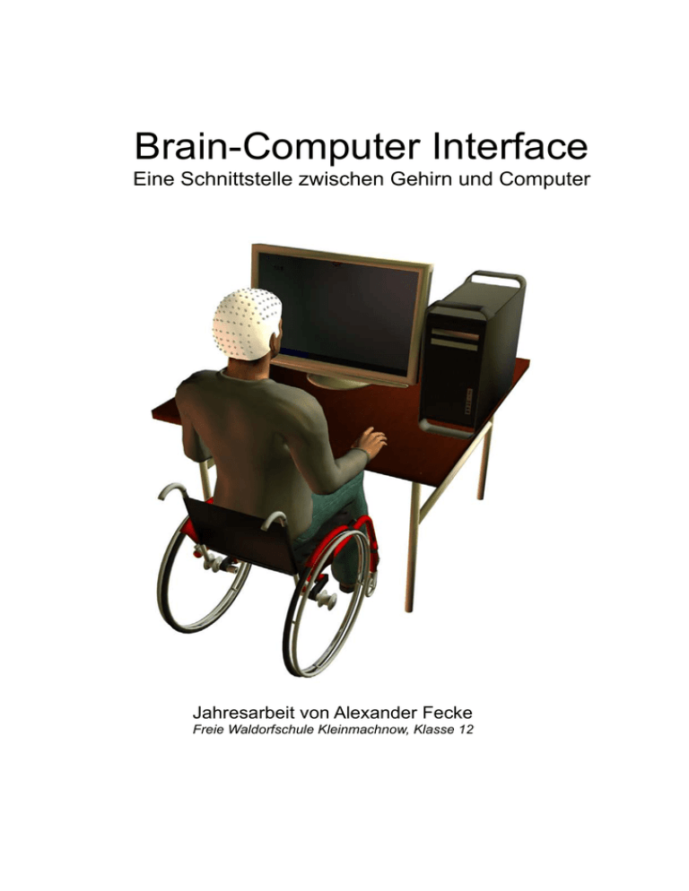 Kapitel 1 Einleitung Brain-Computer Interface Eine Schnittstelle zwischen Gehirn und Computer Jahresarbeit von Alexander Fecke Freie Waldorfschule Kleinmachnow, Klasse 12 Seite 1 Kapitel 1 Einleitung Für die besondere Unterstützung meiner Arbeit danke ich Sebastian Welke, Thorsten Zander und Christian Kothe von der TU Berlin sowie meiner Mentorin an der FWS Kleinmachnow, Ulrike Böttger Seite 2 Kapitel 1 Inhaltsverzeichnis Einleitung Inhaltsverzeichnis 1. Brain-Computer Interface - Jahresarbeit von Alexander Fecke ........................5 1.1 Einleitung .........................................................................................................5 1.2 Gliederung der Arbeit .......................................................................................6 2. Das Gehirn ...............................................................................................................7 2.1 Grundlagen ......................................................................................................7 2.1.1 Das Gehirn............................................................................................7 2.1.2 Die Evolution des Gehirns ....................................................................8 2.1.3 Ein Lageplan des Gehirns ....................................................................8 2.1.4 Nervenzellen.........................................................................................9 2.1.5 Dendriten ..............................................................................................9 2.1.6 Axone....................................................................................................9 2.1.7 Neuronale Vernetzung ........................................................................11 2.1.8 Synapsen ............................................................................................11 2.1.9 Neurotransmitter .................................................................................11 2.2 Zuständigkeiten im menschlichen Gehirn ......................................................12 2.2.1 Die Problematik ..................................................................................13 2.2.2 Motorik ................................................................................................13 2.3 Monitoring ......................................................................................................14 2.3.1 Magnetresonanztomographie .............................................................14 2.3.2 Funktionelle Magnetresonanztomographie.........................................14 2.3.3 Positronen-Emissions-Tomographie ...................................................15 2.3.4 Elektroenzephalografie .......................................................................15 2.4 Zusammenfassung ........................................................................................15 3. Das Brain-Computer Interface.............................................................................16 Grundlagen ..........................................................................................................16 3.1 Brain-Computer Interface...............................................................................16 3.1.1 Wer braucht ein Brain-Computer Interface? .......................................16 3.1.2 Anwendungsbereiche von BCIs in der Zukunft...................................17 3.1.3 Gedankenlesen...................................................................................17 3.1.4 Mentales vs. motorisches BCI ............................................................18 3.1.5 Online/Offline ......................................................................................18 3.1.6 Synchron und asynchrones BCI .........................................................18 3.1.7 Training ...............................................................................................18 3.2 Elektrische Impulse im menschlichen Körper ................................................19 3.2.1 Elektromyografie.................................................................................20 3.2.2 Elektroocculogramm ...........................................................................20 3.2.3 Elektroencephalografie .......................................................................20 Die Ableitung ........................................................................................................22 3.3 Das EEG ........................................................................................................22 3.3.1 Frequenzen.........................................................................................22 3.3.2 Ereigniskorrelierte Potentiale..............................................................23 3.3.3 Ereignisbezogene De-/Synchronisation..............................................24 3.3.4 Error related Potentials .......................................................................25 Die Klassifikation..................................................................................................26 3.4 Vorverarbeitung..............................................................................................26 3.4.1 Der räumlich/zeitliche Filter ................................................................26 3.4.2 Der FFT-Filter .....................................................................................26 3.4.3 Der Laplace-Filter ...............................................................................27 3.5 Merkmalsextraktion ........................................................................................27 3.5.1 Common Spatial Patterns - CSP ........................................................27 Seite 3 Kapitel 1 Einleitung 3.6 Klassifikation ..................................................................................................29 3.6.1 Lineare Diskriminanz Analyse..............................