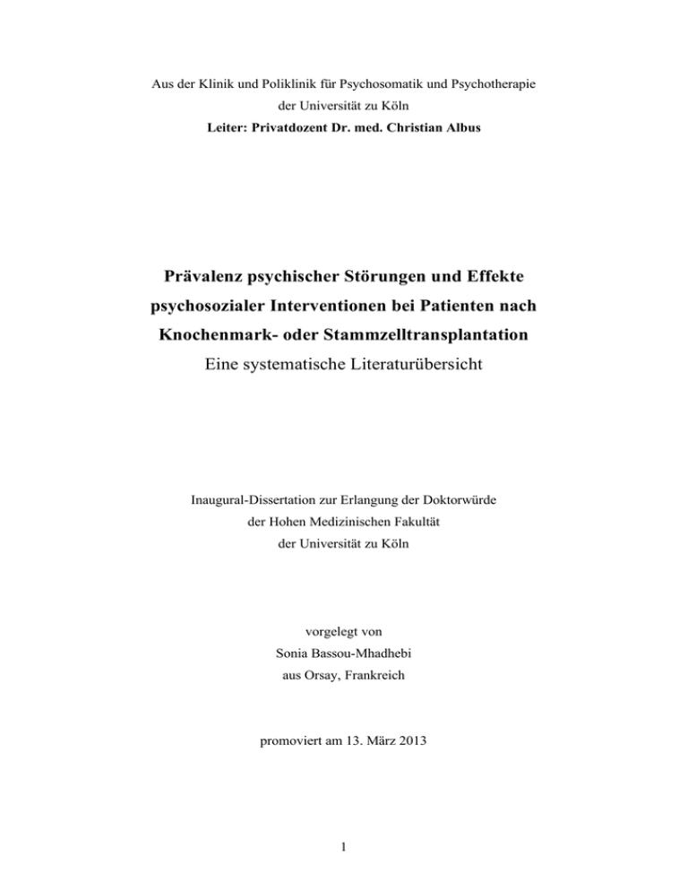 Aus der Klinik und Poliklinik für Psychosomatik und Psychotherapie der Universität zu Köln Leiter: Privatdozent Dr. med. Christian Albus Prävalenz psychischer Störungen und Effekte psychosozialer Interventionen bei Patienten nach Knochenmark- oder Stammzelltransplantation Eine systematische Literaturübersicht Inaugural-Dissertation zur Erlangung der Doktorwürde der Hohen Medizinischen Fakultät der Universität zu Köln vorgelegt von Sonia Bassou-Mhadhebi aus Orsay, Frankreich promoviert am 13. März 2013 1 Gedruckt mit Genehmigung der medizinischen Fakultät der Universität zu Köln 2013 2 Dekan: Universitätsprofessor Dr. med. Dr. h.c. Th. Krieg 1. Berichterstatter: Professor Dr. med. C. H. Albus 2. Berichterstatter: Privatdozent Dr. med. C. Scheid Erklärung Ich erkläre hiermit, dass ich die vorliegende Dissertationsschrift ohne unzulässige Hilfe Dritter und ohne Benutzung anderer als der angegebenen Hilfsmittel angefertigt habe; die aus fremden Quellen direkt oder indirekt übernommenen Gedanken sind als solche kenntlich gemacht. Bei der Auswahl und Auswertung des Materials sowie bei der Herstellung des Manuskriptes habe ich Unterstützungsleistungen von folgenden Personen erhalten: Dr. med. Frank Vitinius Weitere Personen waren an der geistigen Herstellung der vorliegenden Arbeit nicht beteiligt. Insbesondere habe ich nicht die Hilfe einer Promotionsberaterin/eines Promotionsberaters in Anspruch genommen. Dritte haben von mir weder unmittelbar noch mittelbar geldwerte Leistungen für Arbeiten erhalten, die im Zusammenhang mit dem Inhalt der vorgelegten Dissertationsschrift stehen. Die Dissertation wurde von mir bisher weder im Inland noch im Ausland in gleicher oder ähnlicher Form einer anderen Prüfungsbehörde vorgelegt. Köln, den 30. April 2012 Sonia Bassou-Mhadhebi 3 Die dieser Arbeit zugrunde liegende systematische Literaturrecherche ist von mir auf Anregung von Herrn Privatdozent Dr. Albus und Herrn Dr. Vitinius durchgeführt worden. 4 Danksagung Ein herzlicher Dank gilt Herrn Privatdozent Dr. Albus für die Möglichkeit, in der Klinik und Poliklinik für psychosomatische Medizin und Psychotherapie zu promovieren. Herrn Dr. Vitinius gilt mein überaus großer Dank für die exzellente Betreuung der Dissertation und Überlassung des Themas. Die Zusammenarbeit mit ihm hat mich stets motiviert und seine konstruktiven Anregungen haben diese Arbeit mitgeprägt. Meinem Mann Marouen Mhadhebi danke ich für die stete Unterstützung. Danke auch für sein Vertrauen und seine Liebe. Bei meinen Kindern Sarah und Ryan bedanke ich mich für ihre Lebensfreude und ihre Lebensenergie. 5 Inhaltsverzeichnis Abkürzungs- und Akronymverzeichnis ................................................................. 8 1. Einleitung............................................................................................................11 1.1. Grundlagen....................................................................................................11 1.2. Mortalität.......................................................................................................15 1.3. Historie..........................................................................................................16 1.4. Aktuelles .......................................................................................................17 1.5. Fragestellung .................................................................................................18 2. Methodik.............................................................................................................19 2.1. Suchstrategie und Instrumente .......................................................................19 2.2. Studienauswertung ........................................................................................36 3. Ergebnisse...........................................................................................................38 3.1. Psychische Störungen bei der Knochenmarktransplantation ...........................38 3.1.1. Depressive Störungen .............................................................................38 3.1.2. Angststörungen.......................................................................................48 3.1.3. Andere psychische oder psychosomatische Störungen.............................52 3.1.3.1. Sexualverhalten/sexuelle Dysfunktion..............................................52 3.1.3.2. Schmerz ...........................................................................................57 3.1.3.3. Belastungsstörung ............................................................................60 3.1.3.4. Stress ...............................................................................................62 3.2. Lebensqualität ...............................................................................................66 3.3. Soziale Unterstützung/psychosozialer Beratungsbedarf..................................78 3.4. Psychosomatische und psychiatrische Interventionen.....................................87 3.4.1. Interventionen während und/oder nach der Transplantation.....................87 3.4.2. Interventionen zur Reduzierung von Schmerzen, Übelkeit und Erbrechen ..................................................................................101 6 3.5. Isolierung während der KMT/HSZT ............................................................111 3.5.1. Auswirkungen der Isolation auf die Patienten .......................................111 3.5.2. Interventionen während der Isolation ....................................................118 3.6. Medikamentöse Unterstützung.....................................................................121 3.6.1. Schmerztherapie ...................................................................................121 3.6.2. Anxiolytika...........................................................................................122 3.6.3. Antidepressiva ...