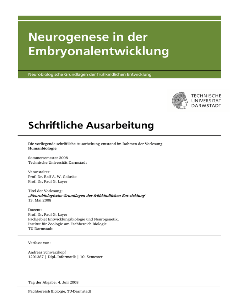 Neurogenese in der Embryonalentwicklung Neurobiologische Grundlagen der frühkindlichen Entwicklung Schriftliche Ausarbeitung Die vorliegende schriftliche Ausarbeitung entstand im Rahmen der Vorlesung Humanbiologie Sommersemester 2008 Technische Universität Darmstadt Veranstalter: Prof. Dr. Ralf A. W. Galuske Prof. Dr. Paul G. Layer Titel der Vorlesung: „Neurobiologische Grundlagen der frühkindlichen Entwicklung“ 13. Mai 2008 Dozent: Prof. Dr. Paul G. Layer Fachgebiet Entwicklungsbiologie und Neurogenetik, Institut für Zoologie am Fachbereich Biologie TU Darmstadt Verfasst von: Andreas Schwarzkopf 1201387 | Dipl.-Informatik | 10. Semester Tag der Abgabe: 4. Juli 2008 Fachbereich Biologie, TU-Darmstadt Neurogenese in der Embryonalentwicklung Inhaltsverzeichnis Förmliche Erklärung ................................................................................................... 3 Einleitung ................................................................................................................... 4 Forschung und Gesellschaft.................................................................................................................. 4 Humanbiologische Aspekte .................................................................................................................. 5 Vom Rohr zum Hirn .................................................................................................... 6 Neurulation .......................................................................................................................................... 7 Neurogenese als Forschungsfeld......................................................................................................... 10 Die Entwicklung des Hirns beim Menschen........................................................................................ 14 Funktion & Struktur .................................................................................................. 15 Zusammenfassung .................................................................................................... 18 Literaturverzeichnis .................................................................................................. 19 Abbildungsverzeichnis............................................................................................... 20 Seite: 2/20 Förmliche Erklärung Die vorliegende Ausarbeitung stützt sich auf die Inhalte des Vortrages von Herrn Prof. Dr. Paul Layer „Neurobiologische Grundlagen der frühkindlichen Entwicklung“ im Sommersemester 2008 an der Technischen Universität Darmstadt. Dieser Vortrag fand am 13. Mai 2008 im Rahmen der Vorlesung Humanbiologie von Herrn Prof. Dr. Ralf A. W. Galuske statt. Ich versichere hiermit gegenüber dem veranstaltenden Institut der Technischen Universität Darmstadt, dass die vorliegende schriftliche Ausarbeitung selbstständig und nur unter Zuhilfenahme der im Literatur- und Abbildungsverzeichnis genannten Quellen angefertigt wurde. Zitate und übernommene Ausführungen innerhalb der Ausarbeitung sind als solche deutlich kenntlich gemacht. Hanau, den ______________________ _________________________________ Andreas Schwarzkopf Seite: 3/20 Einleitung Die Neurogenese ist der Prozess der Bildung von Nervenzellen, der im weitesten Sinne mit der Neurulation beginnt. Die Neurogenese beginnt also schon in den frühen Stadien der Embryogenese, sobald sich das Neuralrohr vom Ektoderm, dem äusseren Keimblatt, löst und damit den Grundstein für Hirn und Rückenmark legt. Sie umfasst alle Entwicklungen von der Absonderung der Neuralleistenzellen und der Entstehung der ersten Hirnvesikel bis hin zur Ausdifferenzierung des gesamten Nervensystems und der eigentlichen Innervation des Körpers. Über die Embryogenese hinaus, durch die gesamte Fetalentwicklung, aber auch postnatal und nach jüngeren Erkenntnissen bis ins Hohe Alter werden Nervenzellen aus Stammzellen gebildet. Der Fokus liegt im Folgenden zwar zunächst auch auf der embryonalen Frühentwicklung bis hin zur Geburt, aber – gerade vor dem Hintergrund der Humanbiologie – spielen die postnatalen Prozesse der Struktur- und Funktionsentwicklung eine bedeutende Rolle und werden ebenfalls angesprochen. Abb. 1: Das Hirn als Zentrum des Bewusstseins. Carter 1999: Mapping the Mind Die im Laufe der vorliegenden Ausarbeitung vorgestellten Themengebiete basieren auf den Vorlesungsinhalten und verschiedener einschlägiger Literatur, deren Autoren durchweg gerade diesen einen Punkt immer wieder hervorheben: Während man lange Zeit ausschließlich die embryonale und juvenile Neurogenese untersuchte und davon ausging, dass der Entwicklungsprozess auch beim Menschen spätestens mit der Pubertät abgeschlossen sei, ist mittlerweile bekannt, dass es bis ins hohe Alter – wenn auch mit verminderter Rate – zur Bildung neuer Nervenfasern aus neuronalen Stammzellen und der entsprechenden Synaptogenese kommt. Forschung und Gesellschaft Die adulte Neurogenese ist damit zu einem sehr aktuellen Forschungsgebiet mit wissenschaftlicher und auch gesellschaftlicher Relevanz evolviert, deren Ergebnisse das Bild des modernen Menschen verändern. Schlagworte wie „Lebenslanges Lernen“ erscheinen vor diesem Hintergrund in einem neuen Licht. Ausserdem ist bereits seit langem bekannt, dass Personen, die sich geistig fit halten („Gehirnjogging“) bis ins hohe Alter keinen signifikanten Leistungsabfall des Gehirns oder gar altersbedingte Degeneration verzeichnen müssen; anders ist dies natürlich bei krankheitsbedingten Zerstörungen der Struktur, die im Regelfall sehr wohl mit dem Alter korrelieren. Jedwede Perspektive kurative Maßnahmen für die verschiedenen Formen von klinischer Demenz (allen voran die Alzheimer-Krankheit als deren bekannteste Form) Seite: 4/20 bereitzustellen, lässt gewisse Erwartungen der Gesellschaft an das Forschunggebiet aufkeimen, das einerseits vor der Aufgabe steht allgemeine Grundlagenforschung zu betreiben und and
