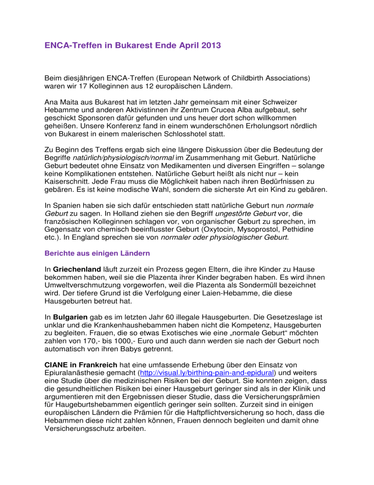 ENCA-Treffen in Bukarest Ende April 2013 Beim diesjährigen ENCA-Treffen (European Network of Childbirth Associations) waren wir 17 Kolleginnen aus 12 europäischen Ländern. Ana Maita aus Bukarest hat im letzten Jahr gemeinsam mit einer Schweizer Hebamme und anderen Aktivistinnen ihr Zentrum Crucea Alba aufgebaut, sehr geschickt Sponsoren dafür gefunden und uns heuer dort schon willkommen geheißen. Unsere Konferenz fand in einem wunderschönen Erholungsort nördlich von Bukarest in einem malerischen Schlosshotel statt. Zu Beginn des Treffens ergab sich eine längere Diskussion über die Bedeutung der Begriffe natürlich/physiologisch/normal im Zusammenhang mit Geburt. Natürliche Geburt bedeutet ohne Einsatz von Medikamenten und diversen Eingriffen – solange keine Komplikationen entstehen. Natürliche Geburt heißt als nicht nur – kein Kaiserschnitt. Jede Frau muss die Möglichkeit haben nach ihren Bedürfnissen zu gebären. Es ist keine modische Wahl, sondern die sicherste Art ein Kind zu gebären. In Spanien haben sie sich dafür entschieden statt natürliche Geburt nun normale Geburt zu sagen. In Holland ziehen sie den Begriff ungestörte Geburt vor, die französischen Kolleginnen schlagen vor, von organischer Geburt zu sprechen, im Gegensatz von chemisch beeinflusster Geburt (Oxytocin, Mysoprostol, Pethidine etc.). In England sprechen sie von normaler oder physiologischer Geburt. Berichte aus einigen Ländern In Griechenland läuft zurzeit ein Prozess gegen Eltern, die ihre Kinder zu Hause bekommen haben, weil sie die Plazenta ihrer Kinder begraben haben. Es wird ihnen Umweltverschmutzung vorgeworfen, weil die Plazenta als Sondermüll bezeichnet wird. Der tiefere Grund ist die Verfolgung einer Laien-Hebamme, die diese Hausgeburten betreut hat. In Bulgarien gab es im letzten Jahr 60 illegale Hausgeburten. Die Gesetzeslage ist unklar und die Krankenhaushebammen haben nicht die Kompetenz, Hausgeburten zu begleiten. Frauen, die so etwas Exotisches wie eine „normale Geburt“ möchten zahlen von 170,- bis 1000,- Euro und auch dann werden sie nach der Geburt noch automatisch von ihren Babys getrennt. CIANE in Frankreich hat eine umfassende Erhebung über den Einsatz von Epiuralanästhesie gemacht (http://visual.ly/birthing-pain-and-epidural) und weiters eine Studie über die medizinischen Risiken bei der Geburt. Sie konnten zeigen, dass die gesundheitlichen Risiken bei einer Hausgeburt geringer sind als in der Klinik und argumentieren mit den Ergebnissen dieser Studie, dass die Versicherungsprämien für Haugeburtshebammen eigentlich geringer sein sollten. Zurzeit sind in einigen europäischen Ländern die Prämien für die Haftpflichtversicherung so hoch, dass die Hebammen diese nicht zahlen können, Frauen dennoch begleiten und damit ohne Versicherungsschutz arbeiten. In Rumänien gab es vor kurzem einen Skandal als publik wurde, wie ÄrztInnen manipulieren und Frauen zu einem Kaiserschnitt überreden und so Zahlen bis zu 80% in Privatkliniken zustande kommen. Nach erheblichem Druck von der Öffentlichkeit gibt es nun eine Anfrage ans Ministerium, was unternommen wird, um dieses Situation zu ändern. So wie in anderen Ländern auch, werden in Rumänien Doulas ausgebildet. Michel Odent – Arzt und Geburtshelfer mit jahrzehntelanger Erfahrung – leitet diese Ausbildungslehrgänge. Doula ist gedacht als emotionale und physische vor, während und nach der Geburt Begleitung und Unterstützung. Es ist keine medizinische Ausbildung und hat nichts mit der Funktion einer Hebamme zu tun. Da es in Rumänien keine legalen Hausgeburten gibt, begleiten einige dieser „Doulas“ Frauen bei ihren Geburten zu Hause und diese zahlen 200 € dafür. iese gut gemeinte Vorgehensweise gefährdet die Hausgeburt und sollte von den Doula Organisationen unterbunden werden. In Tschechien können Hebammen außerklinisch arbeiten, wenn sie registriert sind, aber sie können sich nicht registrieren lassen! Zurzeit gibt es eine Arbeitsgruppe von engagierten Müttern und ÄrztInnen, die ein Projekt zur Geburtshilfe für das Gesundheitsministerium erarbeiten sollen. Leider ist die Kommunikation in der Gruppe ist so schwierig, dass effizientes Arbeiten erschwert wird. In Ungarn ist der Prozess gegen die Hebamme Agnes Gereb noch immer nicht abgeschlossen und sie steht weiterhin unter Hausarrest. Im Frühling wurde ihr der Preis einer dänischen Wohlfahrtsorganisation „A good start in Life“ verliehen. Sie wurde explizit eingeladen, den Preis persönlich entgegen zu nehmen und eine öffentliche Rede zu halten, das wurde ihr vom ungarischen Gericht aber nicht genehmigt. In den Niederlanden ist die Hausgeburt nach wie vor bei einer Höhe von ca. 16% aller Geburten, aber es werden immer mehr Geburtszentren in unmittelbarer Nähe von einer Klinik eröffnet, die noch mehr Sicherheit suggerieren. Aus Österreich haben wir bei der Konferenz von einer Hebammen-Diplomarbeit berichtet, in der die vaginalen Eingriffe während der Geburt thematisiert werden. Jede vaginale Untersuchung ist schon eine Intervention und kann den Geburtsverlauf beeinträchtigen. Nachzulesen unter http:// http://www.nanaya.at/?menu=11&id=231 Die spanischen Kolleginnen waren wieder sehr aktiv. Als eine eindeutige Mütter– und damit Konsumentinnen-Organisation setzen sie sich hauptsächlich für die Mütter (und nicht so sehr für die Hebammen) ein. Ihr Schwerpunkt liegt auf Information und Offenlegung von Informationen, sodass Frauen ihre eigenen gut informierten Entscheidungen treffen können. Sie arbeiten viel übers Internet, betreiben einen Blog und machen zur Zeit gerade eine Aktion „Stop Kristeller“. Dieser Handgriff wird in vielen Ländern am Ende der Geburt ziemlich häufig angewendet, wobei es sehr wenig Studien und Dokumentationen darüber gibt. Sie lassen Frauen von ihren diesbezüglichen Erfahrungen berichten, klären über den Ablauf, die Risiken für Mutter und Kind auf und bringen die Ergebnisse an die Öffentlichkeit. Sog