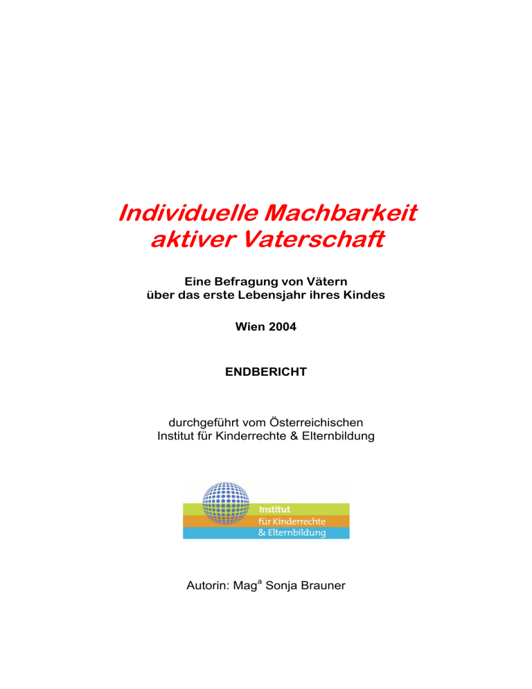 Individuelle Machbarkeit aktiver Vaterschaft Eine Befragung von Vätern über das erste Lebensjahr ihres Kindes Wien 2004 ENDBERICHT durchgeführt vom Österreichischen Institut für Kinderrechte & Elternbildung Autorin: Maga Sonja Brauner Individuelle Machbarkeit aktiver Vaterschaft Impressum: Österreichisches Institut für Kinderrechte & Elternbildung Ballgasse 2 A-1010 Wien Tel: 01/ 513 83 93 Im Auftrag der: Oberösterreichischen Landesregierung Abteilung Jugendwohlfahrt Bahnhofsplatz 1 A - 4021 Linz 2 Individuelle Machbarkeit aktiver Vaterschaft Inhalt: Einleitung.............................................................................................................S. 4 I. Partnerschaft und Lebensentwürfe...........................................................S. 5 I.1. Traditionell.................................................................................................S. 6 I.2. Pragmatisch...............................................................................................S. 7 I.3. Modern:Halbe/Halbe..................................................................................S. 9 II. Beziehung zum Kind..................................................................................S. 11 II.1. Die Geburt..................................................................................................S. 11 II.2. Was Männer im ersten Monat alles tun..................................................... S. 13 II.3. Veränderung der Beziehung zum Kind im ersten Jahr.............................. S. 15 III. Individuelle Machbarkeit aktiver Vaterschaft..............................................S. 16 III.1. Erfahrungen in der eigenen Kindheit .........................................................S. 17 III.2. Reflexion des Rollenverhaltens in der Jugend...........................................S. 20 III.3. Das Alter der Väter.....................................................................................S. 21 III.4. Einstellung zur Vaterschaft.........................................................................S. 22 IV. Veränderung der Beziehung zur Partnerin................................................ S. 23 V. Maßnahmen zur Förderung aktiver Vaterschaft.........................................S. 26 VI. Resümee....................................................................................................S. 28 Kurzbeschreibung der befragten Väter.................................................................S. 30 Studiendesign ......................................................................................................S. 31 Literatur.................................................................................................................S. 32 3 Individuelle Machbarkeit aktiver Vaterschaft Einleitung Ein Drittel aller Väter1 will gerne in Karenz gehen, aber nur etwas mehr als 2 Prozent verwirklichen diesen Wunsch. Zwei Drittel der jungen Männer definieren sich primär als Erzieher (Zulehner, 2003), sie bemühen sich um eine tiefe emotionale Beziehung zu ihrem Kind und wollen es auch fürsorglich betreuen. Das reale Engagement der Väter entspricht bei weitem nicht ihren in Studien artikulierten Bedürfnissen. Es gibt quantitative Erhebungen zum Themenkreis Männlichkeit und Vaterschaft, aber keine qualitative Ursachenforschung. Unsere mittels Tiefeninterviews angelegte Befragung versuchte herauszufinden, wieso Wunsch und Wirklichkeit des väterlichen Engagements so stark auseinander klaffen. Es wurde bei der Befragung vor allem auf die individuelle Machbarkeit von aktiver Vaterschaft fokussiert. Folgende Themenbereiche wurden erhoben: Die Beziehung zum Kind, die Beziehung zur Frau, die Reflexion des eigenen Vater- und Männlichkeitsbildes, sowie die Beziehung zur Herkunftsfamilie mit besonderer Berücksichtigung des Vaters. Wir versuchten herauszufinden, auf welche förderlichen und hemmenden Faktoren Väter im ersten Lebensjahr ihres Kindes in Beruf, Partnerschaft, Gesellschaft und in ihrem Bewusstsein gestoßen sind. Befragt wurden Väter mit einjährigen Kindern, um den Übergang zur Vaterschaft und die damit verbundenen Einstellungs- und Verhaltensänderung herauszufiltern. In der Familienforschung werden Übergangsphasen als Zeiten der Risiken und Chancen betrachtet, denn diese beinhalten individuelle, familiäre und kontextuelle Veränderungen zur Anpassung an die neue Situation. Die Väter erzählten in den Interviews wie sie die Geburt, das erste Monat und die weitere Entwicklung ihres Kindes erlebt haben und welche Auswirkung diese Erlebnisse auf ihre zukünftige Lebensplanung haben. Zusammenfassung der wichtigsten Ergebnisse: • Väter verbringen viel mehr Zeit mit ihren Kindern als ihre Väter mit ihnen. Sie sind bei der Geburt dabei und versorgen von Anfang an aktiv ihre Kinder und lassen sich voll auf eine intensive Beziehung zum Kind ein. • Väter sind nach wie vor sehr erwerbsorientiert, aber sie sind bereit ihre Frauen zu unterstützen, damit diese den Anschluss im Beruf nicht verlieren. Kinder werden genau geplant und die Betreuung so gut es geht partnerschaftlich aufgeteilt. • Die Beziehung zwischen den Eltern verändert sich stark im ersten Lebensjahr. Alles dreht sich um das Kind, es bleibt kaum Zeit für die Paarbeziehung und kaum Zeit zum Rückzug zur eigenen Regeneration. • Aktive Vaterschaft basiert auf den Erfahrungen aus der eigenen Kindheit und der Reflexion darüber. Unterstützende Faktoren sind eine gute Beziehung zum Vater, Solidarität mit der Mutter, sowie Erfahrungen mit jüngeren Geschwistern. 1 Stampler 2004, Lehner 2003b 4 Individuelle Machbarkeit aktiver Vaterschaft I. Partnerschaft und Lebensentwürfe Die moderne Gesellschaft befindet sich in einem Umbruch. Vor allem der Bereich Partnerschaft hat sich durch das gestiegene Erwerbsverhalten von Frauen stark verändert. Dazu kommt ein radikaler Wandel am Arbeitsmarkt, in Richtung vielfältigere und instabilere Erwerbsf