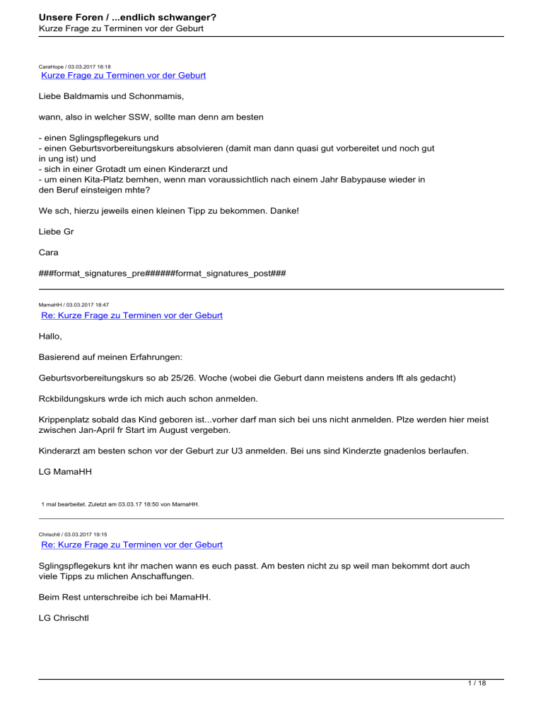 Unsere Foren / ...endlich schwanger? Kurze Frage zu Terminen vor der Geburt CaraHope / 03.03.2017 18:18 Kurze Frage zu Terminen vor der Geburt Liebe Baldmamis und Schonmamis, wann, also in welcher SSW, sollte man denn am besten - einen Sglingspflegekurs und - einen Geburtsvorbereitungskurs absolvieren (damit man dann quasi gut vorbereitet und noch gut in ung ist) und - sich in einer Grotadt um einen Kinderarzt und - um einen Kita-Platz bemhen, wenn man voraussichtlich nach einem Jahr Babypause wieder in den Beruf einsteigen mhte? We sch, hierzu jeweils einen kleinen Tipp zu bekommen. Danke! Liebe Gr Cara ###format_signatures_pre######format_signatures_post### MamaHH / 03.03.2017 18:47 Re: Kurze Frage zu Terminen vor der Geburt Hallo, Basierend auf meinen Erfahrungen: Geburtsvorbereitungskurs so ab 25/26. Woche (wobei die Geburt dann meistens anders lft als gedacht) Rckbildungskurs wrde ich mich auch schon anmelden. Krippenplatz sobald das Kind geboren ist...vorher darf man sich bei uns nicht anmelden. Plze werden hier meist zwischen Jan-April fr Start im August vergeben. Kinderarzt am besten schon vor der Geburt zur U3 anmelden. Bei uns sind Kinderzte gnadenlos berlaufen. LG MamaHH 1 mal bearbeitet. Zuletzt am 03.03.17 18:50 von MamaHH. Chrischtl / 03.03.2017 19:15 Re: Kurze Frage zu Terminen vor der Geburt Sglingspflegekurs knt ihr machen wann es euch passt. Am besten nicht zu sp weil man bekommt dort auch viele Tipps zu mlichen Anschaffungen. Beim Rest unterschreibe ich bei MamaHH. LG Chrischtl 1 / 18 Unsere Foren / ...endlich schwanger? Kurze Frage zu Terminen vor der Geburt ###format_signatures_pre### Mai 2013 bis August 2014 NFP ohne Erfolg; August 2014 1 x abgebrochene IUI; November 2014 1. ICSI (31 befruchtete EZ, kein TF); Dezember 2014 1. Kryo (TF 8- und 4-Zeller) NEGATIV; Februar 2015 2. Kryo (TF 2 Blastos) kurzes POSITIV (biochemische SS) Mein kleiner Schmetterling - dein Besuch hat uns Tren gekostet aber trotzdem Mut gemacht! Die 3. Kryo hat uns unseren wunderschen Sohn geschenkt, der an 31+4 etwas eilig aber gesund zu uns kam. Wir sind so verliebt! *love5* Wir gehen in die 2. Runde. September 2016 4. Kryo (TF 1 Blasto) NEGATIV November 2016: die 5. Kryo unserer letzten zwei eingefrorenen Embryonen, die als 4-Zeller an Tag 2 bertragen werden, ist wieder POSITIV. An 33+1 erblicken die beiden zuckersn Mse das Licht der Welt. *** Ich war der stolze Storch von Duke 13 und nach langer Wartezeit durfte sie nun auch meiner sein! Danke fr deinen Beistand! Ich drck dich ganz fest! *knutschen* * **###format_signatures_post### Juna30 / 03.03.2017 19:34 Re: Kurze Frage zu Terminen vor der Geburt Bei Kinderzren wrde ich mich unbedingt nach Empfehlungen umhen und die abtelefonieren. Manche haben eine Warteliste, andere muss man nach der Geburt schnellstmlich kontaktieren und hoffen, dass man eine von 3 ist, die in der Woche genommen werden. Wenn du privatversichert bist, knte es einfacher sein. Beim GVK wrde ich eher riskieren 1-2 Termine am Ende bei Geburt 35+/36+ nicht mehr mitzubekommen, als den zu frh zu belegen. Sehr viele Fragen ergeben sich einfach nicht wrend eines GVK, wenn man diesen z. B. 25+ bis 31+ machen will. Unsere Hebammen empfehlen bei 6whigem Kurs einen Beginn frhestens 28+ bis 30+. Meiner startet 33+ Sollte in deiner Ne ein Sglingspflegekurs monatlich angeboten werden, wrde ich den letztmlichen vor der Geburt nehmen. Viel wichtiger als das finde ich aber einen "echten" Erste Hilfe Kurs am Kind, keinen Auffrischungskurs. Den auch so sp wie mlich und dann alle 2-3 Jahre die Auffrischungsveranstaltung. Beim KiTa-Platz wrde ich mich ebenfalls umhen und die Empfehlungen ggf. durchtelefonieren. Hier gibt es beliebte KiTas, in denen man sich ab der 12. SSW anmelden muss. Viel Erfolg. ###format_signatures_pre###Freiheit bedeutet, dass man nicht unbedingt alles so machen muss wie andere Menschen. Astrid Lindgren ###format_signatures_post### 1 mal bearbeitet. Zuletzt am 03.03.17 19:40 von Juna30. CaraHope / 03.03.2017 19:51 2 / 18 Unsere Foren / ...endlich schwanger? Kurze Frage zu Terminen vor der Geburt Re: Kurze Frage zu Terminen vor der Geburt Vielen Dank fr die Antworten! Ist ja erschreckend, dass man sich in der 12. SSW schon fr einen Kita-Platz anmelden sollte :(. Leider kenne ich im Freundes-/Bekanntenkreis niemanden, den ich wegen Kitas befragen knte. Bezglich der Kinderzte: Sollte ich mir da etwa jetzt schon einen Platz sichern? Ich finde das alles wahnsinnig frh, aber zur Not lieber jetzt, als womlich im Endspurtstress. Was Anschaffungen fr das Kleine betrifft, werden da im Sglingspflegekurs viele Tipps gegeben? Dann we ja ein sper Termin nicht so gut. Allerdings klingt es natrlich auch wirklich logisch, nicht zu frh sich alles zeigen zu lassen, damit man nichts verlernt. Hmmm... Cara ###format_signatures_pre######format_signatures_post### Kala1005 / 03.03.2017 20:29 Re: Kurze Frage zu Terminen vor der Geburt Hallo Cara, ich freu mir immer noch ein Loch in den Bauch, dass du dich jetzt um solche Dinge kmmern darfst. *megafreu* Also: GVK hab ich ab der 29.SSW gemacht. Sglingspflegekurs 8 Wochen vor der Geburt (war nur 1x im Monat). Infoabend fr werdende Eltern haben wir an 3 verschiedenen KH gemacht (ab 25.SSW). Den Spatz im KiGa angemeldet habe ich in der 15.SSW, weil es hier im Gemeindegebiet nur eine Einrichtung gibt, die die Kinder ab 1 Jahr aufnehmen. Zum Kinderarzt kann ich nichts beitragen, da ich da immer sehr weit fahren msste (Nur einer in der nhsten Stadt und der ist total berlaufen. Der nhste we 45min Fahrt.). Gehe mit unserem Sohn zum Hausarzt, der auch sehr viele Kinder in Behandlung hat und fhle mich sehr gut aufgehoben. Ach ja, 1. Hilfe Kurs beim ASB habe ich 6 Wochen vor ET gemacht. Aber das war nicht nur fr mich privat, sondern auch berufsbedingt angeordnet. LG Kala 1 mal bearbeitet. Zuletzt am 03.03.17 20:47 von Kala1005. MamaHH / 03.03.2017 20:30 Re: Kurze Frage zu Terminen vor der Geburt Hallo, ersten Hilfe Kurs haben wir auch gemacht. Allerdings m.