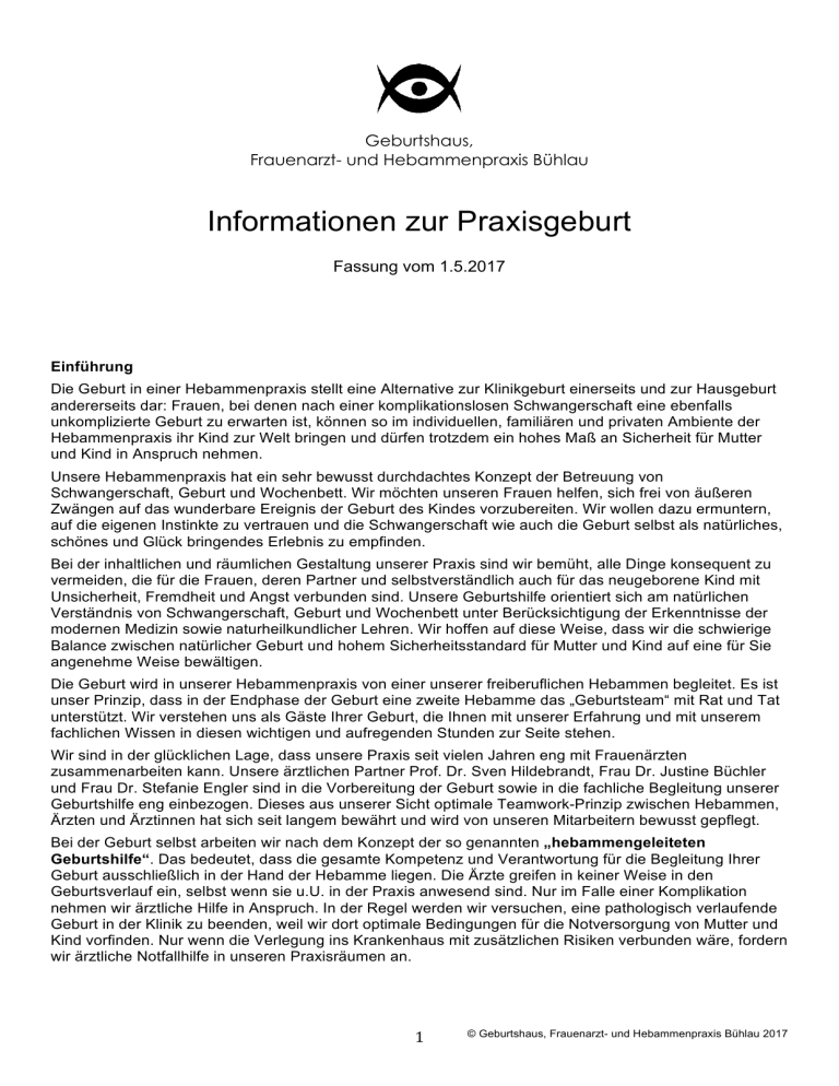 Geburtshaus, Frauenarzt- und Hebammenpraxis Bühlau Informationen zur Praxisgeburt Fassung vom 1.5.2017 Einführung Die Geburt in einer Hebammenpraxis stellt eine Alternative zur Klinikgeburt einerseits und zur Hausgeburt andererseits dar: Frauen, bei denen nach einer komplikationslosen Schwangerschaft eine ebenfalls unkomplizierte Geburt zu erwarten ist, können so im individuellen, familiären und privaten Ambiente der Hebammenpraxis ihr Kind zur Welt bringen und dürfen trotzdem ein hohes Maß an Sicherheit für Mutter und Kind in Anspruch nehmen. Unsere Hebammenpraxis hat ein sehr bewusst durchdachtes Konzept der Betreuung von Schwangerschaft, Geburt und Wochenbett. Wir möchten unseren Frauen helfen, sich frei von äußeren Zwängen auf das wunderbare Ereignis der Geburt des Kindes vorzubereiten. Wir wollen dazu ermuntern, auf die eigenen Instinkte zu vertrauen und die Schwangerschaft wie auch die Geburt selbst als natürliches, schönes und Glück bringendes Erlebnis zu empfinden. Bei der inhaltlichen und räumlichen Gestaltung unserer Praxis sind wir bemüht, alle Dinge konsequent zu vermeiden, die für die Frauen, deren Partner und selbstverständlich auch für das neugeborene Kind mit Unsicherheit, Fremdheit und Angst verbunden sind. Unsere Geburtshilfe orientiert sich am natürlichen Verständnis von Schwangerschaft, Geburt und Wochenbett unter Berücksichtigung der Erkenntnisse der modernen Medizin sowie naturheilkundlicher Lehren. Wir hoffen auf diese Weise, dass wir die schwierige Balance zwischen natürlicher Geburt und hohem Sicherheitsstandard für Mutter und Kind auf eine für Sie angenehme Weise bewältigen. Die Geburt wird in unserer Hebammenpraxis von einer unserer freiberuflichen Hebammen begleitet. Es ist unser Prinzip, dass in der Endphase der Geburt eine zweite Hebamme das „Geburtsteam“ mit Rat und Tat unterstützt. Wir verstehen uns als Gäste Ihrer Geburt, die Ihnen mit unserer Erfahrung und mit unserem fachlichen Wissen in diesen wichtigen und aufregenden Stunden zur Seite stehen. Wir sind in der glücklichen Lage, dass unsere Praxis seit vielen Jahren eng mit Frauenärzten zusammenarbeiten kann. Unsere ärztlichen Partner Prof. Dr. Sven Hildebrandt, Frau Dr. Justine Büchler und Frau Dr. Stefanie Engler sind in die Vorbereitung der Geburt sowie in die fachliche Begleitung unserer Geburtshilfe eng einbezogen. Dieses aus unserer Sicht optimale Teamwork-Prinzip zwischen Hebammen, Ärzten und Ärztinnen hat sich seit langem bewährt und wird von unseren Mitarbeitern bewusst gepflegt. Bei der Geburt selbst arbeiten wir nach dem Konzept der so genannten „hebammengeleiteten Geburtshilfe“. Das bedeutet, dass die gesamte Kompetenz und Verantwortung für die Begleitung Ihrer Geburt ausschließlich in der Hand der Hebamme liegen. Die Ärzte greifen in keiner Weise in den Geburtsverlauf ein, selbst wenn sie u.U. in der Praxis anwesend sind. Nur im Falle einer Komplikation nehmen wir ärztliche Hilfe in Anspruch. In der Regel werden wir versuchen, eine pathologisch verlaufende Geburt in der Klinik zu beenden, weil wir dort optimale Bedingungen für die Notversorgung von Mutter und Kind vorfinden. Nur wenn die Verlegung ins Krankenhaus mit zusätzlichen Risiken verbunden wäre, fordern wir ärztliche Notfallhilfe in unseren Praxisräumen an. 1 © Geburtshaus, Frauenarzt- und Hebammenpraxis Bühlau 2017 Wir sind davon überzeugt, dass für eine wirklich beglückende Geburt in erster Linie Vertrauen und Vertrautheit wichtig sind: Vertrauen zwischen der Schwangeren und ihrer Hebamme, Vertrautheit mit den Räumen und mit den Methoden der Praxis, Vertrauen in das eigene Gebären-Können, Vertrautheit auch mit den Schwächen und Ängsten der an der Geburt beteiligten Menschen. Deshalb ist es für uns wichtig zu betonen, dass in jeder Phase der Geburt - also sowohl vor der Aufnahme in die Praxis als auch während oder nach der Geburt - eine Veränderung Ihrer Vorstellungen hinsichtlich des Geburtsortes Ihres Kindes möglich ist. Sie können also jederzeit in die Klinik wechseln, wenn Sie ein ungutes Gefühl überkommen sollte. Sie müssen dies weder vor uns begründen noch rechtfertigen - wir werden diesen Schritt selbstverständlich akzeptieren und unterstützen. Natürlich müssen auch wir uns das Recht vorbehalten, Ihnen die Klinikgeburt anzuraten, wenn wir Gefahren für Sie oder Ihr Kind erkennen sollten. Wir glauben, dass bei einem vertrauensvollen und offenen Austausch zwischen uns dies keinerlei Probleme bereiten wird. Und natürlich hoffen wir, dass dies die seltene Ausnahme bleiben wird und dass in den meisten Fällen Mutter, Vater und Kind glücklich und gesund die Geburt in den Räumen unserer Praxis erleben können. Welche Voraussetzungen müssen für eine Praxisgeburt erfüllt sein? 1. Es muss eine unkomplizierte Schwangerschaft vorliegen, die einen ebenfalls komplikationslosen Geburtsverlauf erwarten lässt. Sie sollten mit dem Frauenarzt, der Ihre Schwangerschaft betreut, Ihr Vorhaben einer Praxisgeburt besprechen und seine Meinung dazu hören. Sollte er Bedenken haben, die Sie nicht so ganz überzeugen, so empfehlen wir Ihnen, eine telefonische Besprechung der Problematik zwischen Ihrem Frauenarzt und Herrn Dr. Hildebrandt anzuregen. Wir werden Sie bei der Bahnung dieses Kontakts nach bestem Vermögen unterstützen. 2. Sie sollten einen geburtsvorbereitenden Kurs unserer Praxis besucht haben. Wir wollen nicht falsch verstanden werden: Gute Kurse werden natürlich ebenso auch von anderen Hebammen angeboten. In den Kursen unserer Praxis werden Sie jedoch ganz gezielt auf unser Verständnis der Geburt und auf die besonderen Aspekte der Praxisgeburt vorbereitet. Außerdem lernen wir uns kennen, Sie werden mit der Umgebung, in der Ihr Kind zur Welt kommen soll, vertraut. Deshalb wünschen wir uns, dass wir die Zeit der Geburtsvorbereitung gemeinsam verbringen. 3. Sie sollten einen der vier Vortragsabende „Sternstunde Geburt“, „... und hat ein Kind geboren