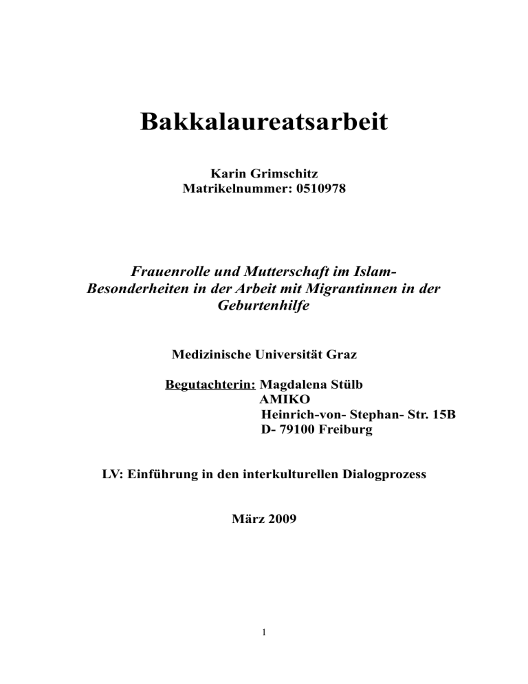 Bakkalaureatsarbeit Karin Grimschitz Matrikelnummer: 0510978 Frauenrolle und Mutterschaft im IslamBesonderheiten in der Arbeit mit Migrantinnen in der Geburtenhilfe Medizinische Universität Graz Begutachterin: Magdalena Stülb AMIKO Heinrich-von- Stephan- Str. 15B D- 79100 Freiburg LV: Einführung in den interkulturellen Dialogprozess März 2009 1 Eigenwörtliche Erklärung: Ich erkläre ehrenwörtlich, dass ich die vorliegende Bakkalaureatsarbeit selbstständig und ohne fremde Hilfe verfasst habe, andere als die angegeben Quellen nicht verwendet habe und die den benutzen Quellen wörtlich und inhaltlich entnommenen Stellen als solche kenntlich gemacht habe. Weiter erkläre ich, dass ich diese Arbeit in gleicher oder ähnlicher Form noch keiner anderen Prüfungsbehörde vorgelegt habe. Graz, am 27.03.2009 Karin Grimschitz 2 INHALTSVERZEICHNIS Einleitung S. 6 1. Der Islam- Entwicklung und Grundlagen S. 7 2. Die Rolle der Frau und Mutterschaft im Islam S. 9 2.1. Das traditionelle Familienleben und Pflichten in islamischen Gesellschaften S. 9 2.2. Bildung und Beruf der Frau S.10 2.3. Heirat und Ehe (-leben) im Islam S.12 2.4. Scheidung im Islam S.14 2.5. Sexualität im Islam S.17 2.6. Erziehung und Mutterschaft im Islam S.18 3. Arbeit mit muslimischen Migrantinnen S.21 3.1. Definition S.21 3.2. Migration in Österreich S.21 3.3. Gesundheit und Migration S.22 3.4. Besonderheiten in der Arbeit mit muslimischen Migrantinnen im Gesundheitswesen S.23 3.4.1. Besonderheit: „Sprache und Kommunikation“ S.23 3.4.2. Besonderheit: „Gesundheits- und Krankheitsbild im Islam“ S.24 Das Gesundheits- und Krankheitsbild in der Türkei S.24 Das Gesundheits- und Krankheitsbild in den Ländern des ehemaligen Jugoslawiens S.25 Das Gesundheits- und Krankheitsbild in Afghanistan S.25 3.4.3. Besonderheit: „Familienangehörige“ S.27 3.4.4. Besonderheit: „Ernährung und Essgewohnheiten“ S.28 3.4.5. Besonderheit: „die muslimische Frau als Patientin“ S.28 4. Besonderheiten bei der Arbeit mit muslimischen Migrantinnen in der Geburtenhilfe S.30 3 4.1. Beistand und Begleitung bei der Geburt S. 30 4.2. Kommunikation mit Migrantinnen in der Geburtenhilfe S .31 4.3. Schmerz und Äußerung von Schmerz bei der Geburt S. 31 4.4. Die operative Entbindung bei Migrantinnen S. 32 4.5. Vorsorgeuntersuchungen S. 32 4.6. Schwangerschaftsverhalten S. 33 4.7. Die Geburtsvorbereitung S. 34 4.8. Die Geburt S. 34 4.9. Die Pflege des Neugeborenen S. 35 4.10 Die Wöchnerin S. 36 5. Ausblick und eigenes Statement S. 37 6. Literaturangaben S. 38 4 Zusammenfassung In meiner Bakkalaureatsarbeit bearbeite ich das Thema „Frauenrolle und Mutterschaft im IslamBesonderheiten in der Arbeit mit Migrantinnen in der Geburtenhilfe“. Vorne weg möchte ich erwähnen, dass sich die behandelte Thematik nur auf den Islam im engeren Sinne bezieht, und länderübergreifende Differenzen außer Acht gelassen werden. Im ersten Kapitel möchte ich, nach einer kurzen Einleitung, eine Allgemeininformation über den Islam, seine Grundlagen und seine Entwicklung geben. Dabei gehe ich näher auf Mohammed, den Stifter des Islams, den Koran die Sunna und die Trennung von Schiiten und Sunniten ein. Im nächsten Teil meiner Arbeit lege ich mein Augenmerk auf die Rolle der Frau im Islam. Hier berichte ich über das traditionelle Familienleben im Islam, über Bildung und Beruf der Frau, Heirat und Scheidung, Sexualität und Mutterschaft. Diese einzelnen Punkte behandle ich deswegen in, weil ich finde, dass sie wichtig sind und man mehr darüber wissen sollte, wenn man im Gesundheitswesen mit muslimischen Patientinnen arbeitet. Die behandelten Themen dienen der allgemeinen Aufklärung und dazu, dass man das Leben einer muslimischen Frau besser versteht. Im letzten Teil meiner Arbeit beschäftige ich mich mit dem Thema Migration allgemein, mit Gesundheit und Migration sowie mit Besonderheiten, die sich durch muslimische Patientinnen ergeben können. Diese Punkte habe ich besonders deswegen gewählt, weil ich der Meinung bin, dass auf diesen Bereiche in der täglichen Praxis zu wenig eingegangen wird. Zum Schluss befasse ich mich noch speziell mit dem Gebiet „Migrantinnen in der Geburtenhilfe“. 5 Einleitung Da Österreich ein Land ist, in dem viele Migranten und Migrantinnen leben und ich selbst viele Freunde habe, deren Eltern vor vielen Jahren nach Österreich eingewandert sind, habe ich mich schon immer sehr für andere Kulturen interessiert. Als wir dann letztes Jahr im Rahmen des Seminars „Einführung in den interkulturellen Dialogprozess“ auch sehr viel über Moslems gehört haben und mich dieses Thema sehr interessiert hat, habe ich beschlossen mich mit der islamischen Religion näher zu beschäftigen. Vor allem die Stellung der Frau und ihre Rechte haben mich besonders beschäftigt, da man in unserer Gesellschaft viele Unwahrheiten über muslimische Frauen hört. Ein einfaches Beispiel dafür wäre, dass Frauen von ihren Vätern zu einer Heirat gedrängt werden, damit diese finanziell abgesichert sind . Auch im Rahmen unseres Studiums haben wir immer wieder gehört, dass es speziell im Gesundheitswesen wichtig ist auf Unterschiede von verschiedenen Kulturen zu achten. Vor allem als Pflegeperson hat man sehr intensiven Kontakt zu den Patienten und auch im Managementbereich ist es wichtig mehr über andere Kulturen und Religionen zu wissen, damit man auf solche Aspekte, zum Beispiel in der Planung einer Krankenhausstation, näher eingehen kann. Genau diese Betrachtungsweisen waren für mich Grund genug mich näher mit einer anderen Kultur, einer anderen Religion und dem sich darauf beziehenden Frauenbild zu beschäftigen. Mein Ziel hierbei war es einen generellen Überblick über das Leben einer muslimischen Frau zu geben und zu zeigen, welche Besonderheiten sich im Gesundheitswesen durch eine muslimische Patientin ergeben können und worauf man im Umgang mit Migrantinnen im Bereich der Geburtshilfe achten soll. 6 1. Der Islam- Entwicklung un