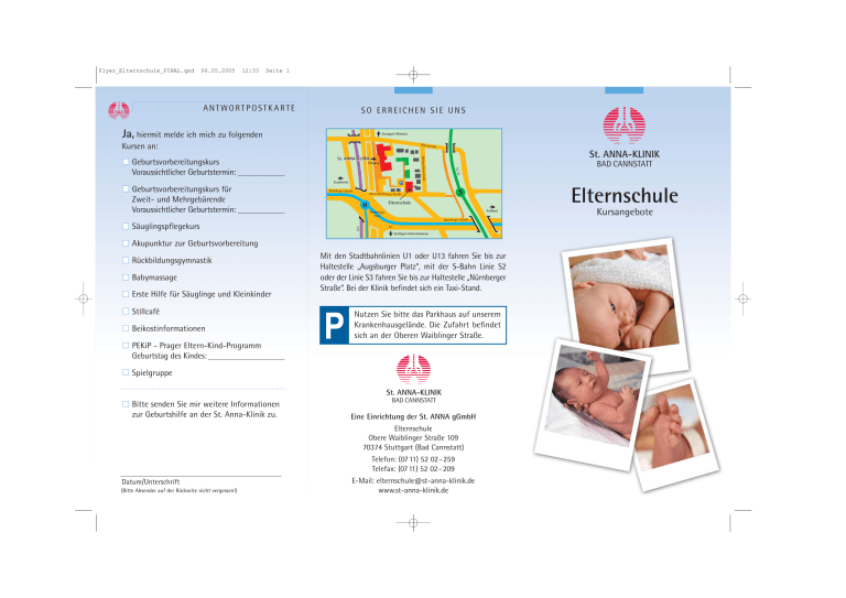 Flyer_Elternschule_FINAL.qxd 06.05.2005 12:33 Seite 1 ANTWORTPOSTKARTE SO ERREICHEN SIE UNS Ja, hiermit melde ich mich zu folgenden Stuttgart-Münster Kursen an: St. ANNA-KLINIK Eingang BAD CANNSTATT S2, S3 Stadtmitte Geburtsvorbereitungskurs für Zweit- und Mehrgebärende Voraussichtlicher Geburtstermin: St. ANNA-KLINIK Melanchthonstraße Geburtsvorbereitungskurs Voraussichtlicher Geburtstermin: Brenzstraß e P Waiblinger Straße Elternschule S Obere Waiblinger Straße Elternschule H Fellbach Augsburger Platz Nürnberger Straße U13 Säuglingspflegekurs U1 Stuttgart-Untertürkheim Akupunktur zur Geburtsvorbereitung Rückbildungsgymnastik Babymassage Erste Hilfe für Säuglinge und Kleinkinder Stillcafé Beikostinformationen PEKiP - Prager Eltern-Kind-Programm Geburtstag des Kindes: Mit den Stadtbahnlinien U1 oder U13 fahren Sie bis zur Haltestelle „Augsburger Platz“, mit der S-Bahn Linie S2 oder der Linie S3 fahren Sie bis zur Haltestelle „Nürnberger Straße“. Bei der Klinik befindet sich ein Taxi-Stand. P Nutzen Sie bitte das Parkhaus auf unserem Krankenhausgelände. Die Zufahrt befindet sich an der Oberen Waiblinger Straße. Spielgruppe St. ANNA-KLINIK Bitte senden Sie mir weitere Informationen zur Geburtshilfe an der St. Anna-Klinik zu. BAD CANNSTATT Eine Einrichtung der St. ANNA gGmbH Elternschule Obere Waiblinger Straße 109 70374 Stuttgart (Bad Cannstatt) Telefon: (07 11) 52 02 - 259 Telefax: (07 11) 52 02 - 209 Datum/Unterschrift (Bitte Absender auf der Rückseite nicht vergessen!) E-Mail: [email protected] www.st-anna-klinik.de Kursangebote Flyer_Elternschule_FINAL.qxd 06.05.2005 12:34 Seite 4 VORWORT Liebe Schwangere, um Sie auf die Geburt und auf das Leben mit Ihrem Kind vorzubereiten, bieten wir Ihnen in dieser Broschüre eine Vielzahl von Kursen unserer Elternschule. Alle aktuellen Termine und Preise entnehmen Sie dem beigefügten Einlegeblatt. Für Ihre Anmeldung nutzen Sie einfach die beigefügte Antwortpostkarte oder melden Sie sich telefonisch, per E-Mail oder Fax bei uns an. VOR DER GEBURT Informationsabend mit Kreißsaalführung Bei unseren Infoabenden erfahren Sie alles zu dem Thema Geburt und Wochenbett in der St. Anna-Klinik. Auch bieten wir Ihnen hier eine Führung durch den Kreißsaal und die Wochenstation. Falls die Führung wegen Belegung der Räumlichkeiten nicht stattfinden kann, können Sie gerne nach Absprache mit der diensthabenden Hebamme außerhalb dieses Termins den Kreißsaal besichtigen. Die Termine entnehmen Sie bitte dem Einlegeblatt. Themenabend Hier geben Belegärzte unseres Hauses Informationen zu speziellen Themen, wie z. B. Wassergeburt, Kaiserschnitt und Pränataldiagnostik. Die aktuellen Termine finden Sie auf dem Einlegeblatt. Geburtsvorbereitungskurs Im Geburtsvorbereitungskurs erhalten Sie Informationen über die Veränderungen während der Schwangerschaft, den Geburtsablauf und die Zeit danach. Sie sollen Ihnen helfen, natürliche Ängste vor dem großen Ereignis abzubauen. Übungen zur Entspannung, Körperwahrnehmung und Atmung sowie Gespräche und Austausch von Erfahrungen dienen der Vorbereitung auf Ihr individuelles Geburtserlebnis. Der Kurs dauert insgesamt 7 Doppelstunden, davon eine mit Partner. 2 3 Flyer_Elternschule_FINAL.qxd 06.05.2005 12:35 Seite 6 VOR DER GEBURT Jede Gruppe ist auf maximal 10 Frauen begrenzt. Aufgrund der hohen Nachfrage sollte die Anmeldung ab der 18. Schwangerschaftswoche erfolgen. Der Geburtsvorbereitungskurs wird auch in türkischer Sprache angeboten. Die Kosten für die Frau übernimmt die Krankenkasse. Bei Ihrer Anmeldung bieten wir Ihnen Kurstermine an, die zu Ihrem Geburtstermin passen. Dauer: 7 Doppelstunden Ort: Elternschule, Gymnastikraum Geburtsvorbereitungskurs für Zweit- und Mehrgebärende Für Frauen, die bereits ein oder mehrere Kinder geboren haben, bieten wir einen speziellen Geburtsvorbereitungskurs mit Bauchtanz, Yoga und viel Entspannung. Dauer: 7 Doppelstunden Ort: Elternschule, Gymnastikraum Säuglingspflegekurs Da das Leben mit einem Neugeborenen den familiären Alltag verändert, hilft Ihnen unser Säuglingspflegekurs mit folgenden Informationen: Beantwortung allgemeiner Fragen zur Babyerstausstattung, zu den Wickelmethoden, 4 VOR DER GEBURT zur Säuglingspflege, zur Kinderzimmereinrichtung und zum Stillen. Die aktuellen Termine und Kosten finden Sie auf dem Einlegeblatt. Dauer: Samstag, 9.00 bis 17.00 Uhr Ort: Elternschule, Gymnastikraum Nachsorge Verschiedene Hebammen der St. Anna-Klinik bieten Hausbesuche zur Betreuung von Mutter und Kind nach der Entlassung aus der Klinik an. Diese Nachsorge wird bis zum 10. Tag nach der Geburt von Ihrer Krankenkasse bezahlt. Die aktuelle Liste unserer Nachsorgehebammen erhalten Sie im Kreißsaal und in der Elternschule oder unter www.st-anna-klinik.de . Nehmen Sie möglichst frühzeitig Kontakt mit Ihrer Hebamme auf, damit sie Zeit für Sie einplanen kann. Weitere Fragen zu unseren Nachsorgehebammen beantworten wir Ihnen gerne unter der Telefonnummer (07 11) 52 02 259. Akupunktur zur Geburtsvorbereitung Eine Akupunkturbehandlung kurz vor der Entbindung dient der werdenden Mutter zur Erleichterung der Geburt. In der Elternschule der St. Anna-Klinik führen Hebammen des Hauses die Akupunktur durch. Die Behandlung beginnt in der 36. Schwangerschaftswoche an 4 aufeinander folgenden Terminen. Dauer: 4 Termine Ort: Elternschule 5 Flyer_Elternschule_FINAL.qxd 06.05.2005 12:36 Seite 8 NACH DER GEBURT Wochenbettgymnastik Bei der Wochenbettgymnastik, die Sie während Ihres Klinikaufenthalts besuchen können, erlernen Sie erste, sanfte Übungen zur Straffung der Körperteile, die durch die Geburt belastet wurden. Sie können so einer Inkontinenz (unwillkürlicher Harnabgang) vorbeugen. Ergänzend dazu wird der Besuch der Rückbildungsgymnastik empfohlen (siehe unten). Dauer: Montag bis Freitag, 13.30 bis 14.00 Uhr Ort: Wochenbettstation Rückbildungsgymnastik Sechs Wochen nach der Geburt sollten Sie mit der Rückbildungsgymnastik beginnen. Wir zeige