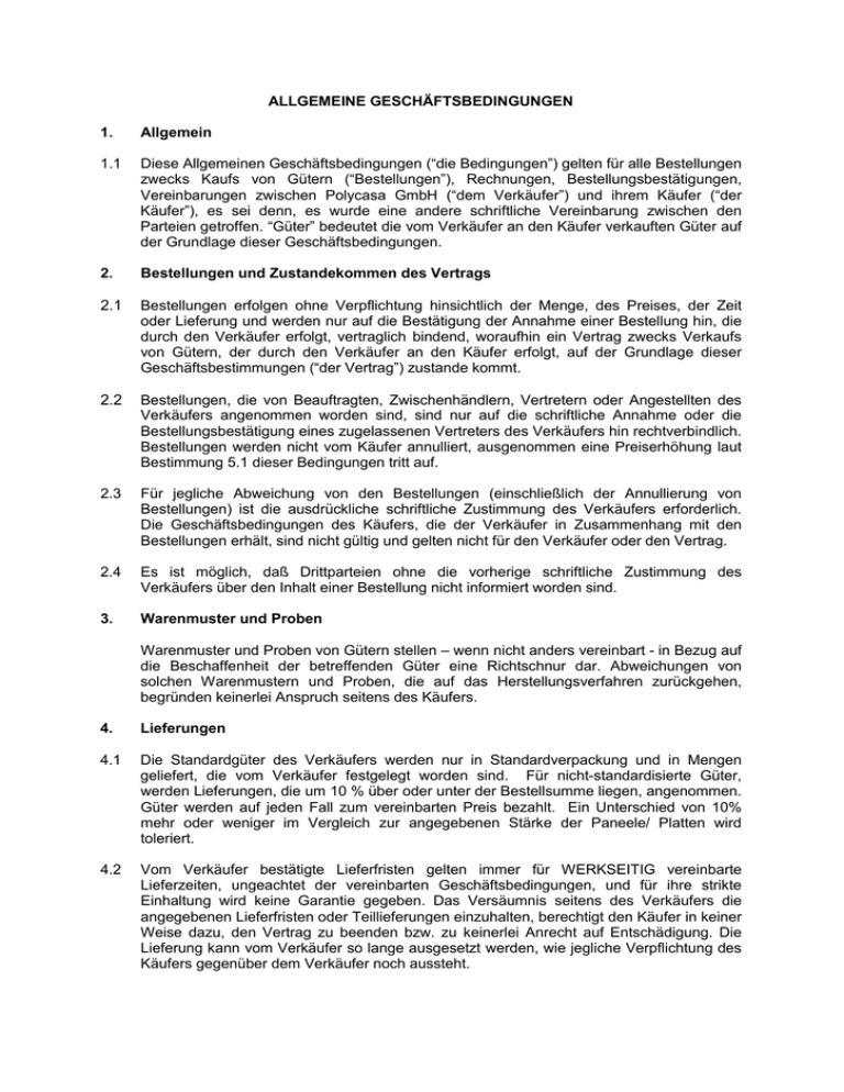 ALLGEMEINE GESCHÄFTSBEDINGUNGEN 1. Allgemein 1.1 Diese Allgemeinen Geschäftsbedingungen (“die Bedingungen”) gelten für alle Bestellungen zwecks Kaufs von Gütern (“Bestellungen”), Rechnungen, Bestellungsbestätigungen, Vereinbarungen zwischen Polycasa GmbH (“dem Verkäufer”) und ihrem Käufer (“der Käufer”), es sei denn, es wurde eine andere schriftliche Vereinbarung zwischen den Parteien getroffen. “Güter” bedeutet die vom Verkäufer an den Käufer verkauften Güter auf der Grundlage dieser Geschäftsbedingungen. 2. Bestellungen und Zustandekommen des Vertrags 2.1 Bestellungen erfolgen ohne Verpflichtung hinsichtlich der Menge, des Preises, der Zeit oder Lieferung und werden nur auf die Bestätigung der Annahme einer Bestellung hin, die durch den Verkäufer erfolgt, vertraglich bindend, woraufhin ein Vertrag zwecks Verkaufs von Gütern, der durch den Verkäufer an den Käufer erfolgt, auf der Grundlage dieser Geschäftsbestimmungen (“der Vertrag”) zustande kommt. 2.2 Bestellungen, die von Beauftragten, Zwischenhändlern, Vertretern oder Angestellten des Verkäufers angenommen worden sind, sind nur auf die schriftliche Annahme oder die Bestellungsbestätigung eines zugelassenen Vertreters des Verkäufers hin rechtverbindlich. Bestellungen werden nicht vom Käufer annulliert, ausgenommen eine Preiserhöhung laut Bestimmung 5.1 dieser Bedingungen tritt auf. 2.3 Für jegliche Abweichung von den Bestellungen (einschließlich der Annullierung von Bestellungen) ist die ausdrückliche schriftliche Zustimmung des Verkäufers erforderlich. Die Geschäftsbedingungen des Käufers, die der Verkäufer in Zusammenhang mit den Bestellungen erhält, sind nicht gültig und gelten nicht für den Verkäufer oder den Vertrag. 2.4 Es ist möglich, daß Drittparteien ohne die vorherige schriftliche Zustimmung des Verkäufers über den Inhalt einer Bestellung nicht informiert worden sind. 3. Warenmuster und Proben Warenmuster und Proben von Gütern stellen – wenn nicht anders vereinbart - in Bezug auf die Beschaffenheit der betreffenden Güter eine Richtschnur dar. Abweichungen von solchen Warenmustern und Proben, die auf das Herstellungsverfahren zurückgehen, begründen keinerlei Anspruch seitens des Käufers. 4. Lieferungen 4.1 Die Standardgüter des Verkäufers werden nur in Standardverpackung und in Mengen geliefert, die vom Verkäufer festgelegt worden sind. Für nicht-standardisierte Güter, werden Lieferungen, die um 10 % über oder unter der Bestellsumme liegen, angenommen. Güter werden auf jeden Fall zum vereinbarten Preis bezahlt. Ein Unterschied von 10% mehr oder weniger im Vergleich zur angegebenen Stärke der Paneele/ Platten wird toleriert. 4.2 Vom Verkäufer bestätigte Lieferfristen gelten immer für WERKSEITIG vereinbarte Lieferzeiten, ungeachtet der vereinbarten Geschäftsbedingungen, und für ihre strikte Einhaltung wird keine Garantie gegeben. Das Versäumnis seitens des Verkäufers die angegebenen Lieferfristen oder Teillieferungen einzuhalten, berechtigt den Käufer in keiner Weise dazu, den Vertrag zu beenden bzw. zu keinerlei Anrecht auf Entschädigung. Die Lieferung kann vom Verkäufer so lange ausgesetzt werden, wie jegliche Verpflichtung des Käufers gegenüber dem Verkäufer noch aussteht. 4.3 Die Lieferungen des Verkäufers erfolgen in Übereinstimmung mit den Bestimmungen der letzten Veröffentlichung der Incoterms der Internationalen Handelskammer. Für Lieferungen, bei denen es dem Verkäufer obliegt, die Fracht der Güter vertraglich zu vereinbaren, wählt der Verkäufer die Beförderungsart. Wenn während der Beförderung Schäden an den Gütern auftreten, gibt der Käufer bzw. sein Vertreter dem Verkäufer bei der Lieferung besagten Schaden schriftlich auf dem Frachtdokument oder auf dem Übergabebeleg an. Des Weiteren muss der Käufer, in Übereinstimmung mit Bestimmung 7 dieser Bedingungen, eine Entschädigung fordern. 4.4 Der Käufer ist dazu verpflichtet, die bestellten Güter zu den geplanten Lieferzeiten und orten in Besitz zu nehmen. Sollte der Käufer die Güter nicht zu dieser Zeit und an diesem Ort in Besitz nehmen, ist der Verkäufer dazu berechtigt, die Güter auf Kosten und Gefahr des Käufers zu lagern. Eine solche Schutzmaßnahme hebt die Zahlungspflicht des Käufers nicht auf. 5. Preis und Zahlungsbedingungen 5.1 Die Preise des Verkäufers verstehen sich AB FABRIK, es sei denn, die Parteien haben etwas anderes vereinbart. Wenn die Preise des Verkäufers zwischen dem Datum der Bestellungsannahme und dem Lieferdatum variieren, gelten die am Lieferdatum gültigen Preise. Der Verkäufer kann solche Preise jederzeit vor der Lieferung der Güter einseitig erhöhen, wenn die Rohstoffpreise, Transportpreise, Arbeitskosten, Steuern oder anderweitige Kosten in Zusammenhang mit der Produktion oder der Lieferung der Güter erheblich steigen. In diesem Fall benachrichtigt der Verkäufer den Käufer schriftlich darüber. Im Fall einer Preiserhöhung ist der Käufer dazu berechtigt, vom Vertrag zurückzutreten, er muss dem Verkäufer dies allerdings innerhalb von vierzehn (14) Tagen ab der Bekanntgabe der Preiserhöhung schriftlich bekanntgeben. 5.2 Die Rechnungen des Verkäufers sind voll, d. h. ohne jeglichen Abzug an den vereinbarten Daten und in Übereinstimmung mit den vereinbarten Zahlungsbedingungen zahlbar. Strittige Beträge werden nicht ohne die vorherige schriftliche Zustimmung des Verkäufers von zu zahlenden Beträgen abgezogen. Rechnungen müssen anhand von einem Einschreiben innerhalb von sieben (7) Kalendertagen, die auf den Rechnungseingang folgen, vom Käufer beanstandet werden. Ist diese Frist verstrichen, wird davon ausgegangen, dass die betreffende Rechnung als vom Käufer angenommen zu betrachten ist und vom Verkäufer werden keine weiteren Beanstandungen akzeptiert. Eine beanstandete Rechnung hebt die Zahlungspflicht des Käufers nicht auf. 5.3 Der Verkäufer ist dazu berechtigt, auf jeglichen am Fälligkeitsdatum unbez