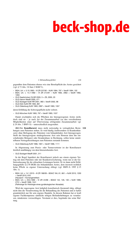 beck-shop.de Druckerei C. H . Beck Geiß/Greiner: Arzthaftpflichtrecht (Aktuelles Recht für die Praxis) ..................................... Erstversand, 20.01.2014 I. Behandlungsfehler 139 gegenüber dem Patienten ebenso wie eine Berufspflicht des Arztes gesichert (vgl. § 73 Abs. 1 b Satz 2 SGB V), – BGH, Urt. v. 5.10.1993 – VI ZR 237/92 – NJW 1994, 797 = VersR 1994, 102 – BGH, Urt. v. 14.7.1992 – VI ZR 214/91 – NJW 1992, 2962 = VersR 1992, 1263 – OLG Saarbrücken OLGR 2005, 5 = ZfL 2005, 20 – OLG Hamm MedR 2005, 471 – OLG Stuttgart NJW-RR 2001, 960 = VersR 2002, 98 – OLG Köln NJW-RR 1994, 861 – OLG Oldenburg NJW 1993, 2997 = VersR 1993, 1357 deren Erfüllung die Schweigepflicht nicht verletzt. – OLG München NJW 1993, 797 = VersR 1993, 1537 Damit erschöpfen sich die Pflichten des hinzugezogenen Arztes nicht, doch sind sie – je nach Art der Zusammenarbeit (zu den verschiedenen Möglichkeiten einer auf Überweisung erfolgenden Zusammenarbeit vgl. § 24 Abs. 3 BMV-Ä) – unterschiedlich ausgestaltet. (b1) Der Konsiliararzt muss nicht notwendig in vertraglichen Bezie- 124 hungen zum Patienten stehen. Er wird häufig (insbesondere in Krankenhäusern) ohne Befragung des Patienten vom behandelnden Arzt hinzugezogen. Stellt der hinzugezogene niedergelassene Arzt sein Honorar dem ihn einschaltenden Belegarzt oder Krankenhaus in Rechnung, sollen keine unmittelbaren Vertragsbeziehungen zum Patienten zustande kommen. – OLG Oldenburg NJW 1996, 1601 = VersR 1996, 1111 In Abgrenzung zum Praxis- oder Turnusvertreter ist der Konsiliararzt letztlich unabhängig von dem hinzuziehenden Arzt. – OLG Stuttgart MedR 2001, 311 In der Regel liquidiert der Konsiliararzt jedoch aus einem eigenen Vertrag mit dem Patienten oder der Krankenversicherung, wenn nur er die Gebietszulassung für die erbrachten Leistungen besitzt. Er ist dann nicht Erfüllungsgehilfe (§ 278 BGB) des behandelnden Arztes, dem insoweit rechtlich keine Pflicht zu eigener Untersuchung obliegt (vgl. BMV-Ä 1995 § 15 Abs. 1). – BGH, Urt. v. 14.1.2010 – III ZR 188/09 – BGHZ 184, 61, 66 f. = NJW 2010, 1200 = VersR 2010, 816 (Hausarzt – Humangenetiker) – BGH, Urt. v. 29.6.1999 – VI ZR 24/98 – BGHZ 142, 126, 130 = NJW 1999, 2731 = VersR 1999, 1241 (Pathologe für Histologie eines gynäkologischen Abradats) Wird der zugezogene Arzt lediglich konsiliarisch (beratend) tätig, obliegt nicht ihm die Verantwortung für die Behandlung des Patienten und er haftet grundsätzlich nur für sein eigenes Handeln. In diesem Rahmen hat er kraft eigener Fachkompetenz sämtliche nötigen Befunderhebungen zu veranlassen, mindestens vorzuschlagen. Versäumt er dies, begründet das seine Haftung. Medien mit Zukunft beck-shop.de Druckerei C. H . Beck Geiß/Greiner: Arzthaftpflichtrecht (Aktuelles Recht für die Praxis) ..................................... Erstversand, 20.01.2014 140 B. Haftung aus Behandlungsfehler – OLG Jena VersR 2008, 401 = GesR 2008, 49 – NZB-BGH – (Gynäkologe – keine histologische Befundung bei schnell wachsendem Tumor) – OLG Köln NJW-RR 2003, 1031 (Neurologe für unterlassenes CCT nach Gehirntumor) Der Konsiliararzt darf darauf vertrauen, von dem überweisenden Arzt vollständig unterrichtet zu werden. Zur eigenen Erhebung fremdanamnestischer Befunde ist er deshalb nicht ohne weiteres verpflichtet. – OLG Köln VersR 2011, 1452 (Lungenembolie – Radiologe – Vertrauen auf pflichtgemäßes internist. Handeln) – OLG Celle VersR 1997, 365 – NA-BGH – (Selbstmordversuch – Konsiliararzt Psychiater) 125 Die Behandlungsverantwortung mit der Pflicht zu vollständiger therapeutischer Aufklärung verbleibt bei dem die Behandlung führenden (überweisenden) Arzt. Eine Kontrolle des überweisenden Arztes, insbesondere eine Überprüfung der medizinischen Indikationsstellung, wird vom hinzugezogenen Arzt regelmäßig nicht geschuldet. – BGH, Urt. v. 14.1.2010 – III ZR 188/09 – BGHZ 184, 61, 72 = NJW 2010, 1200 = VersR 2010, 816 Anderes gilt, wenn der konsiliarisch tätige Arzt erkennt oder erkennen muss, dass der überweisende Arzt drohende Gefahren verkannt und sie in seine Überweisung deshalb nicht einbezogen hat. Dann muss auch ein lediglich konsiliarisch hinzugezogener Arzt auf die medizinische Notwendigkeit weiterer diagnostischer Maßnahmen hinweisen. – BGH, Urt. v. 5.10.1993 – VI ZR 237/92 – NJW 1994, 797 = VersR 1994, 102 – OLG Hamm MedR 2005, 471 – OLG Hamm VersR 2002, 98 – NA-BGH – (je Gynäkologe – Konsiliararzt Radiologe – Mammographie – Empfehlung weiterer Kontrollen) – OLG Stuttgart OLGR 2002, 116 – NA-BGH – (Sinusvenenthrombose – Konsiliararzt Neurologe – Kernspinempfehlung – weiteres Vorgehen nicht sichergestellt – Angiographie und Wiedervorstellung unterblieben) – OLG Stuttgart NJW-RR 2001, 960 = VersR 2002, 98 (Nativ-CT statt Kontrastmittelaufnahme – Radiologe darf sich ohne gegenteilige Anhaltspunkte auf die Anforderungen durch Hausarzt beschränken) 126 Auch bei Dringlichkeit wird er den Patienten unmittelbar beraten müssen (therapeutische Aufklärung), wenn das seine Pflicht, den Patienten vor den aus der Behandlung folgenden Gefahren zu schützen, erfordert. Er ist jedoch - auch bei unklarem, nicht bei hinreichend wahrscheinlich malignem Befund - nicht zur Kontrolle einer Wiedervorstellung des Patienten verpflichtet, wenn die Behandlung abgeschlossen und eine ausreichende Belehrung erfolgt ist – OLG Koblenz GesR 2010, 546 (für abgeschlossene Behandlung bei unklarem Mamma-Befund nach schriftlichem und mündlichem Hinweis) Medien mit Zukunft beck-shop.de Druckerei C. H . Beck Geiß/Greiner: Arzthaftpflichtrecht (Aktuelles Recht für die Praxis) ..................................... Erstversand, 20.01.2014 I. Behandlungsfehler 141 Der hinzugezogene Arzt ist regelmäßig an den Auftrag gebunden, wenn 127 er konsiliarisch tätig wird. Die Bindung des Konsiliararztes an den Überweisungsauftrag bedeutet indessen nicht, das