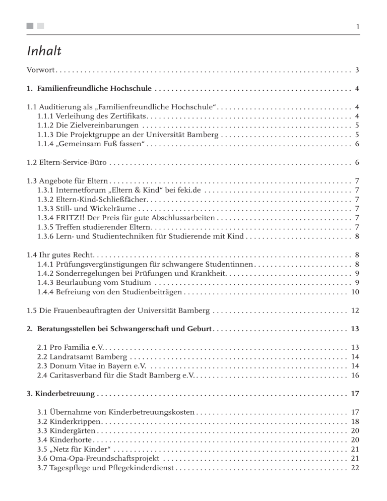 1 Inhalt Vorwort . . . . . . . . . . . . . . . . . . . . . . . . . . . . . . . . . . . . . . . . . . . . . . . . . . . . . . . . . . . . . . . . . . . . . . . . 3 1. Familienfreundliche Hochschule . . . . . . . . . . . . . . . . . . . . . . . . . . . . . . . . . . . . . . . . . . . . . . . . 4 1.1 Auditierung als „Familienfreundliche Hochschule“ . . . . . . . . . . . . . . . . . . . . . . . . . . . . . . . . . 1.1.1 Verleihung des Zertifikats . . . . . . . . . . . . . . . . . . . . . . . . . . . . . . . . . . . . . . . . . . . . . . . . . . 1.1.2 Die Zielvereinbarungen . . . . . . . . . . . . . . . . . . . . . . . . . . . . . . . . . . . . . . . . . . . . . . . . . . . 1.1.3 Die Projektgruppe an der Universität Bamberg . . . . . . . . . . . . . . . . . . . . . . . . . . . . . . . . 1.1.4 „Gemeinsam Fuß fassen“ . . . . . . . . . . . . . . . . . . . . . . . . . . . . . . . . . . . . . . . . . . . . . . . . . . 4 4 5 5 6 1.2 Eltern-Service-Büro . . . . . . . . . . . . . . . . . . . . . . . . . . . . . . . . . . . . . . . . . . . . . . . . . . . . . . . . . . . 6 1.3 Angebote für Eltern . . . . . . . . . . . . . . . . . . . . . . . . . . . . . . . . . . . . . . . . . . . . . . . . . . . . . . . . . . . 1.3.1 Internetforum „Eltern & Kind“ bei feki.de . . . . . . . . . . . . . . . . . . . . . . . . . . . . . . . . . . . . 1.3.2 Eltern-Kind-Schließfächer . . . . . . . . . . . . . . . . . . . . . . . . . . . . . . . . . . . . . . . . . . . . . . . . . . 1.3.3 Still- und Wickelräume . . . . . . . . . . . . . . . . . . . . . . . . . . . . . . . . . . . . . . . . . . . . . . . . . . . . 1.3.4 FRITZI! Der Preis für gute Abschlussarbeiten . . . . . . . . . . . . . . . . . . . . . . . . . . . . . . . . . 1.3.5 Treffen studierender Eltern . . . . . . . . . . . . . . . . . . . . . . . . . . . . . . . . . . . . . . . . . . . . . . . . . 1.3.6 Lern- und Studientechniken für Studierende mit Kind . . . . . . . . . . . . . . . . . . . . . . . . . . 7 7 7 7 7 7 8 1.4 Ihr gutes Recht . . . . . . . . . . . . . . . . . . . . . . . . . . . . . . . . . . . . . . . . . . . . . . . . . . . . . . . . . . . . . . . 8 1.4.1 Prüfungsvergünstigungen für schwangere Studentinnen . . . . . . . . . . . . . . . . . . . . . . . . 8 1.4.2 Sonderregelungen bei Prüfungen und Krankheit. . . . . . . . . . . . . . . . . . . . . . . . . . . . . . . 9 1.4.3 Beurlaubung vom Studium . . . . . . . . . . . . . . . . . . . . . . . . . . . . . . . . . . . . . . . . . . . . . . . . 9 1.4.4 Befreiung von den Studienbeiträgen . . . . . . . . . . . . . . . . . . . . . . . . . . . . . . . . . . . . . . . . 10 1.5 Die Frauenbeauftragten der Universität Bamberg . . . . . . . . . . . . . . . . . . . . . . . . . . . . . . . . . 12 2. Beratungsstellen bei Schwangerschaft und Geburt . . . . . . . . . . . . . . . . . . . . . . . . . . . . . . . . . 13 2.1 Pro Familia e.V. . . . . . . . . . . . . . . . . . . . . . . . . . . . . . . . . . . . . . . . . . . . . . . . . . . . . . . . . . . . 2.2 Landratsamt Bamberg . . . . . . . . . . . . . . . . . . . . . . . . . . . . . . . . . . . . . . . . . . . . . . . . . . . . . 2.3 Donum Vitae in Bayern e.V. . . . . . . . . . . . . . . . . . . . . . . . . . . . . . . . . . . . . . . . . . . . . . . . . 2.4 Caritasverband für die Stadt Bamberg e.V. . . . . . . . . . . . . . . . . . . . . . . . . . . . . . . . . . . . . . 13 14 14 16 3. Kinderbetreuung . . . . . . . . . . . . . . . . . . . . . . . . . . . . . . . . . . . . . . . . . . . . . . . . . . . . . . . . . . . . . 17 3.1 Übernahme von Kinderbetreuungskosten . . . . . . . . . . . . . . . . . . . . . . . . . . . . . . . . . . . . . 3.2 Kinderkrippen . . . . . . . . . . . . . . . . . . . . . . . . . . . . . . . . . . . . . . . . . . . . . . . . . . . . . . . . . . . . 3.3 Kindergärten . . . . . . . . . . . . . . . . . . . . . . . . . . . . . . . . . . . . . . . . . . . . . . . . . . . . . . . . . . . . . 3.4 Kinderhorte . . . . . . . . . . . . . . . . . . . . . . . . . . . . . . . . . . . . . . . . . . . . . . . . . . . . . . . . . . . . . . 3.5 „Netz für Kinder“ . . . . . . . . . . . . . . . . . . . . . . . . . . . . . . . . . . . . . . . . . . . . . . . . . . . . . . . . . 3.6 Oma-Opa-Freundschaftsprojekt . . . . . . . . . . . . . . . . . . . . . . . . . . . . . . . . . . . . . . . . . . . . . 3.7 Tagespflege und Pflegekinderdienst . . . . . . . . . . . . . . . . . . . . . . . . . . . . . . . . . . . . . . . . . . 17 18 20 20 21 21 22 2 3.8 Krabbelgruppe im Balthasar . . . . . . . . . . . . . . . . . . . . . . . . . . . . . . . . . . . . . . . . . . . . . . . . 22 3.9 Babysitterbörsen . . . . . . . . . . . . . . . . . . . . . . . . . . . . . . . . . . . . . . . . . . . . . . . . . . . . . . . . . . 22 4. Freizeitangebote und sonstige Angebote . . . . . . . . . . . . . . . . . . . . . . . . . . . . . . . . . . . . . . . . . . 23 4.1 Chapeau Claque e.V. . . . . . . . . . . . . . . . . . . . . . . . . . . . . . . . . . . . . . . . . . . . . . . . . . . . . . . . 4.2 Ferienangebot „Bamberger Ferienabenteuer“ . . . . . . . . . . . . . . . . . . . . . . . . . . . . . . . . . . 4.3 Deutscher Kinderschutzbund Kreisverband Bamberg e.V. . . . . . . . . . . . . . . . . . . . . . . . . 4.4 Mütterzentrum „Känguruh“ e.V. . . . . . . . . . . . . . . . . . . . . . . . . . . . . . . . . . . . . . . . . . . . . . 23 24 24 25 5. Finanzielle Leistungen und Unterstützungen . . . . . . . . . . . . . . . . . . . . . . . . . . . . . . . . . . . . . 27 5.1 Bundesausbildungsförderungsgesetz (BAföG) . . . . . . . . . . . . . . . . . . . . . . . . . . . . . . . . . 5.2 Leistungen der Studentenwerke . . . . . . . . . . . . . . . . . . . . . . . . . . . . . . . . . . . . . . . . . . . . . 5.3 Leistungen der Krankenkasse . . . . . . . . . . . . . . . . . . . . . . . . . . . . . . . . . . . . . . . . . . . . . . . 5.4 Elterngeld . . . . . . . . . . . . . . . . . . . . . . . . . . . . . . . . . . . . . . . . . . . . . . . . . . . . . . . . . . 