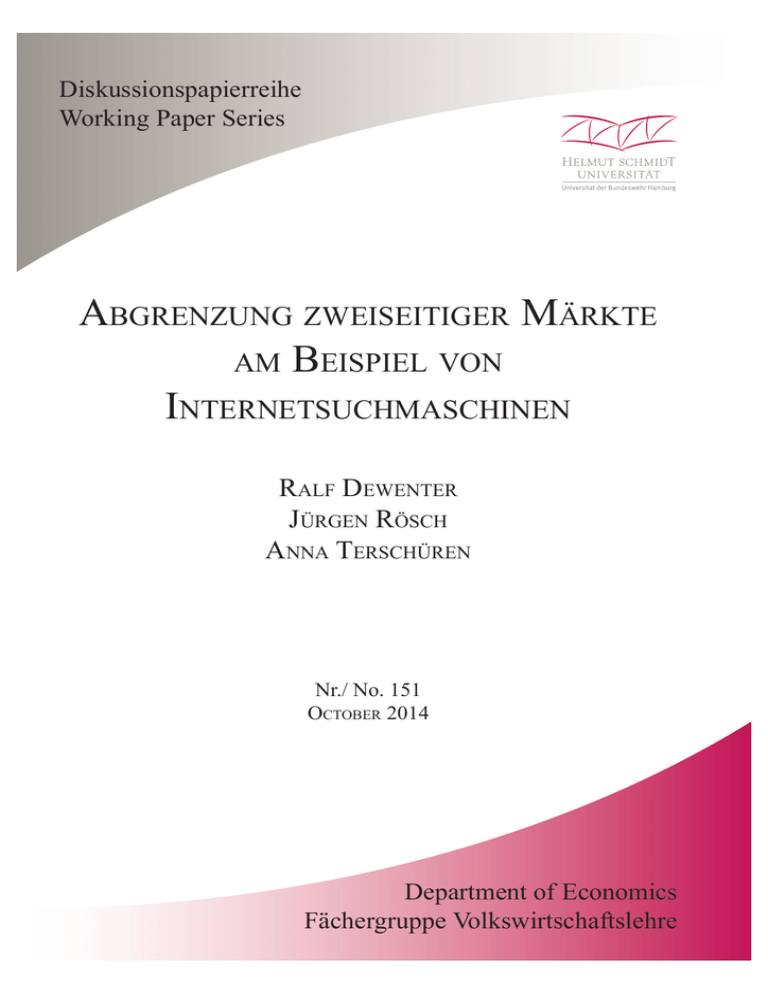 Diskussionspapierreihe Working Paper Series Abgrenzung zweiseitiger Märkte AM beispiel von internetsuchMAschinen rAlf Dewenter Jürgen rösch AnnA terschüren Nr./ No. 151 october 2014 Department of Economics Fächergruppe Volkswirtschaftslehre Autoren / Authors Ralf Dewenter Helmut Schmidt Universität Hamburg Department of Economics Holstenhofweg 85, 22043 Hamburg Germany [email protected] Jürgen Rösch Helmut Schmidt Universität Hamburg Department of Economics Holstenhofweg 85, 22043 Hamburg Germany [email protected] Anna Terschüren Goodgame Studios Hamburg Germany Redaktion / Editors Helmut Schmidt Universität Hamburg / Helmut Schmidt University Hamburg Fächergruppe Volkswirtschaftslehre / Department of Economics Eine elektronische Version des Diskussionspapiers ist auf folgender Internetseite zu finden/ An electronic version of the paper may be downloaded from the homepage: http://fgvwl.hsu-hh.de/wp-vwl Koordinator / Coordinator Klaus B. Beckmann [email protected] Helmut Schmidt Universität Hamburg / Helmut Schmidt University Hamburg Fächergruppe Volkswirtschaftslehre / Department of Economics Diskussionspapier Nr. 151 Working Paper No. 151 Abgrenzung zweiseitiger Märkte am Beispiel von Internetsuchmaschinen RALF DEWENTER JÜRGEN RÖSCH ANNA TERSCHÜREN Zusammenfassung/ Abstract Google wird häufig als marktmächtig bezeichnet. Grund dafür ist ein mutmaßlicher Marktanteil von über 90% in manchen Ländern. Eine gründliche Marktabgrenzung im wettbewerbsrechtlichen Sinne liegt dieser Aussage aber nicht zugrunde. Was umfasst den „Suchmarkt“? Wird z.B. zwischen Produkt-, Personen- und Allgemeinersuche unterschieden? Und womit verdient eine Suchmaschine überhaupt Geld? Müsste nicht vielmehr eine Abgrenzung auch anhand des Werbemarktes stattfinden? In diesem Papier gehen wir diesen Fragen nach. Eine pauschale Bestimmung des Marktanteils ist nicht so einfach möglich, wie in der öffentlichen Debatte oft glaubhaft gemacht wird. Die Marktabgrenzung ist vielmehr abhängig von der zugrundeliegenden wettbewerblichen Fragestellung. Die Größe des Marktes, also das, was unter dem Bruchstrich steht, kann je nach Kontext stark variieren. Eine genaue Bestimmung ist im Einzelfall aufwendig, aufgrund der Bedeutung von Suchmaschinen aber unerlässlich. Erst, wenn der Markt genau definiert ist, kann über Marktmacht und erst dann über mögliche Gegenmaßnahmen diskutiert werden. JEL-Klassifikation / JEL-Classification: D40; K00; L10; L40 Schlagworte /Keywords: Suchmaschinen; Marktabgrenzung; zweiseitige Märkte; Google „Market Definition would not be so important, if it were not so important“ Evans (2010) I. Einleitung Die Marktabgrenzung wäre nicht so wichtig, wäre sie nicht so wichtig. Dieser Satz von David Evans aus dem Jahr 2010 ist genauso richtig wie trivial. 2 Am Anfang fast jeder ökonomischen Wettbewerbsanalyse steht die Marktabgrenzung. Nur so können Wettbewerbsbehörden in aller Regel Aussagen über den Missbrauch von Marktmacht oder die Auswirkung von Fusion treffen. Die Abgrenzung des relevanten Marktes steht aber nicht nur an erster Stelle der meisten Wettbewerbsanalysen, sondern ist in oftmals auch richtungsweisend. Ist die Marktabgrenzung fehlerhaft, kann dies gravierende Auswirkungen haben auf den weiteren Verlauf der Untersuchung, auf die Bewertung und damit auch auf das Urteil der Wettbewerbsbehörden haben. Ist eine Marktdefinition in einseitigen Märkten bereits eine Herausforderung, so ist das Problem in zweiseitigen Märkten umso komplexer. Die Problematik einer adäquaten Definition zweiseitiger Märkte zeigte sich eindrucksvoll in den europäischen und US-amerikanischen Verfahren gegen den Suchmaschinenbetreiber Google. 3,4 Google wird meist als marktbeherrschendes Unternehmen identifiziert, welches in einigen europäischen Ländern Marktanteile von über 90% aufweist. 5 Diese Aussage der Marktbeherrschung und der Marktanteile setzt jedoch eine zuverlässige Bestimmung der betroffenen Märkte voraus. Unklar ist z.B. wie eine geografische Abgrenzung vorgenommen werden sollte. Das relevante Marktgebiet könnte national vorgenommen werden, theoretisch aber auch ganz Europa oder nur einzelne Regionen umfassen oder auch nach Sprachräumen abgrenzt werden. Fraglich ist auch, ob eine geografische Abgrenzung überhaupt notwendig und sinnvoll ist. Ebenso wenig trivial ist auch die sachliche Marktabgrenzung: Ein Marktanteil von z.B. 90% auf einem sogenannten Suchmarkt setzt voraus, diesen vorab korrekt zu definieren. Unklar ist, 2 Evans, Lightening up market definition. Research Handbook on the Economics of Antitrust Law, Einer Elhauge, ed., New York 2010, Edward Elgar. 3 Vgl. z.B. Haucap, Wie lange hält Googles Monopol?, DICE Ordnungspolitische Perspektiven, Nr. 32, Düsseldorf, 2012. 4 Eine weitere Anwendung stellt das mobile Betriebssystem Android dar. Auch hier sind zwei Marktseiten vorhanden: Die Nutzer des Systems sowie die Programmierer der Applikationen (vgl. dazu Körber, Let's talk about Android observations on competition in the field of mobile operating systems, Universität Göttingen, Mimeo). 5 Vgl. z.B. Maier, „Angst vor Google“, 2014 in: Frankfurter Allgemeine Zeitung, http://www.faz.net/aktuell/feuilleton/debatten/weltmacht-google-ist-gefahr-fuer-die-gesellschaft-12877120.html 2 welche Plattformen dabei erfasst werden sollen. 6 Werden z.B. auch Anbieter wie Amazon und eBay in die Analyse einbezogen, wenn auf eine Produktsuche abgezielt wird? Werden Plattformen wie Facebook, XING und LinkedIn bei der Personensuche aufgenommen? Eine adäquate Abgrenzung ist viel komplexer als der erste Blick vermuten lässt. Auch ein Suchmarkt muss natürlich aus Sicht der Verbraucher abgegrenzt werden. Diese fragen aber nicht nur einen allgemeinen Suchdienst nach, sondern stellen vielmehr Suchanfragen nach bestimmten Begriffen. Diese Begriffe sind in den meisten Fällen nicht gegeneinander substituierbar. Darüber hinaus erwirtschaften Suchmaschinen - wie v