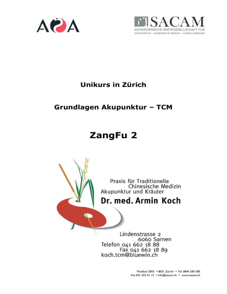 Unikurs in Zürich Grundlagen Akupunktur – TCM ZangFu 2 Postfach 2003 • 8021 Zürich • Tel. 0844 200 200 Fax 031 332 41 12 • [email protected] • www.sacam.ch ZangFu 2 Milz / Leber Akupunktur-TCM (ASA) Grundlagenmodul Universität Zürich Dr. med. Armin Koch www.koch-tcm.ch © Dr. Armin Koch 1 Inhaltsverzeichnis 1 Einleitung: San Jiao – Dreifacher Erwärmer (TE) ............................................................. 3 1.1 Oberer Erwärmer ........................................................................................................ 3 1.2 Mittlerer Erwärmer – Mitte ........................................................................................ 3 1.3 Unterer Erwärmer ....................................................................................................... 3 2 Mitte – Wandlungsphase Erde ........................................................................................... 3 2.1 Funktionskreis Milz (SP) ........................................................................................... 3 2.1.1 Funktionen der Milz ........................................................................................... 3 2.1.2 Weitere Aspekte der Milz................................................................................... 3 2.1.3 Milzdysharmonie – Ursachen ............................................................................. 3 2.1.4 Milzdysharmonie – Symptome .......................................................................... 4 2.2 Funktionskreis Magen (ST) ........................................................................................ 4 2.2.1 Funktionen des Magens ...................................................................................... 4 2.2.2 Dysharmonie des Magens - Ursachen ................................................................ 4 2.2.3 Dysharmonie des Magens - Symptome .............................................................. 4 2.3 Beziehungen zwischen den Funktionskreisen ............................................................ 4 2.3.1 Milz – Magen ..................................................................................................... 4 2.3.2 Milz – Herz......................................................................................................... 5 2.3.3 Milz – Lunge ...................................................................................................... 5 2.3.4 Milz – Niere ....................................................................................................... 5 2.3.5 Mitte – Leber ...................................................................................................... 5 3 Funktionskreise der Wandlungsphase Holz ....................................................................... 5 3.1 Funktionskreis Leber (LV) ......................................................................................... 5 3.1.1 Funktionen der Leber ......................................................................................... 5 3.1.2 Leber: Körpergewebe ......................................................................................... 6 3.1.3 Leber: Öffner → Augen ..................................................................................... 6 3.1.4 Leber: Emotion ................................................................................................... 6 3.1.5 Leberfk – Menstruation ...................................................................................... 6 3.1.6 Yin-/Yang-Differenzierung ................................................................................ 7 3.1.7 Leber-Qi-Stagnation ........................................................................................... 7 3.1.8 Leber-Yin-Mangel .............................................................................................. 7 3.1.9 Leber-Wind ........................................................................................................ 7 3.2 Funktionskreis Gallenblase ........................................................................................ 8 3.3 Beziehungen zwischen den Funktionskreisen ............................................................ 8 3.3.1 Leber – Herz ....................................................................................................... 8 3.3.2 Leber – Milz ....................................................................................................... 8 3.3.3 Leber – Lunge .................................................................................................... 8 3.3.4 Leber – Niere ...................................................................................................... 8 3.3.5 Leber – Gallenblase ............................................................................................ 8 © Dr. Armin Koch 2 1 Einleitung: San Jiao – Dreifacher Erwärmer (TE) • • • • • San Jiao wird den Fu-Organen zugeordnet keine spezifische Organstruktur sondern eine Funktion Kontrolle der Wasserwege Koordinationsfunktion im Metabolismus sowie bei der Bewegung der Körperflüssigkeiten und des Qi. In unserem westlichen Verständnis entspricht TE in vielen Aspekten dem interstitiellen Raum. 1.1 Oberer Erwärmer oberhalb des Zwerchfells, enthält Fkk Herz und Lunge 1.2 Mittlerer Erwärmer – Mitte zwischen Zwerchfell und Bauchnabel, enthält Fkk Magen und Milz, wobei ein (funktioneller) Teil des Darmes auch noch dazugehört! 1.3 Unterer Erwärmer unterhalb des Nabels, enthält Dünn- und Dickdarm (Ausscheidungsfunktion!), Niere und Harnblase. Manchmal wird auch die Leber dazugerechnet (manchmal zum mittleren Erwärmer gezählt!). 2 Mitte – Wandlungsphase Erde 2.1 Funktionskreis Milz (SP) 2.1.1 Funktionen der Milz • • • • • Transformation und Transport von Nahrung und Flüssigkeit Quelle nachgeburtlicher Essenz Hält die Organe an ihrem Platz Hält das Blut in 