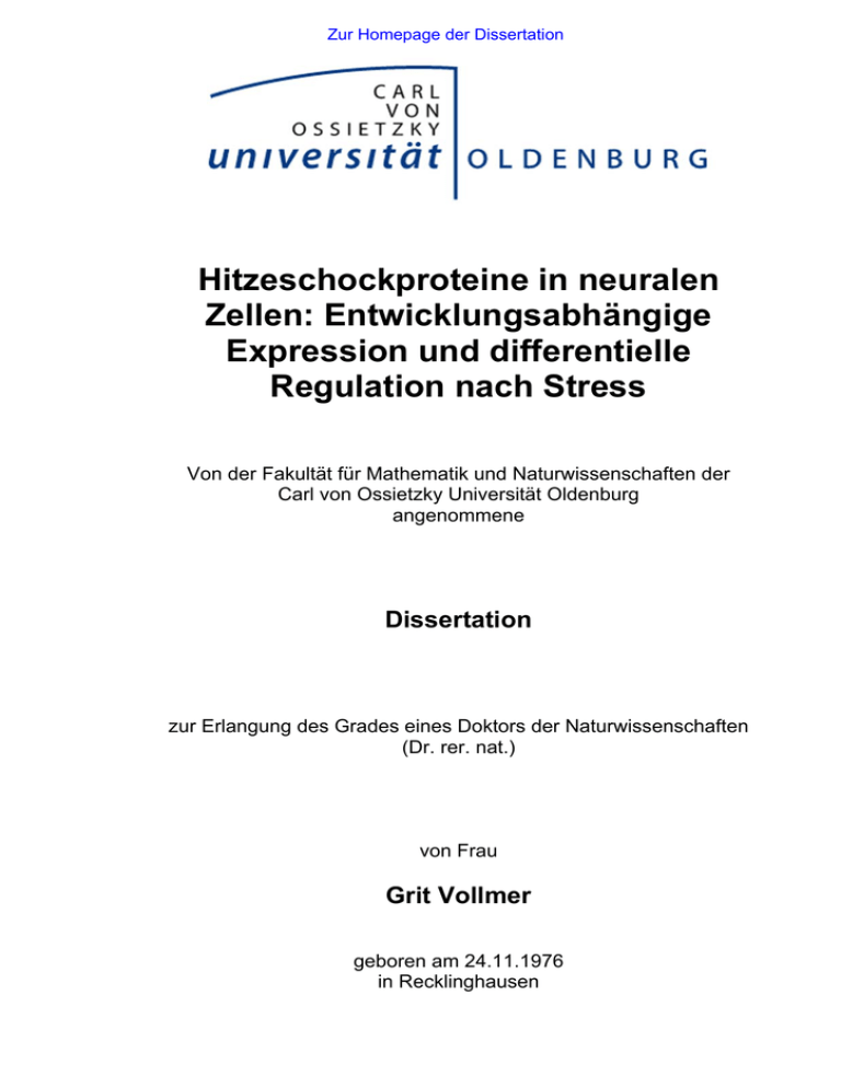Zur Homepage der Dissertation Hitzeschockproteine in neuralen Zellen: Entwicklungsabhängige Expression und differentielle Regulation nach Stress Von der Fakultät für Mathematik und Naturwissenschaften der Carl von Ossietzky Universität Oldenburg angenommene Dissertation zur Erlangung des Grades eines Doktors der Naturwissenschaften (Dr. rer. nat.) von Frau Grit Vollmer geboren am 24.11.1976 in Recklinghausen Gutachterin: Frau Prof. Dr. Christiane Richter-Landsberg Zweitgutachter: Prof. Dr. Michael Koch Tag der Disputation: 19.09.2005 Es ist besser, ein kleines Licht zu entzünden, als über große Dunkelheit zu fluchen. Konfuzius Danksagung Ich bedanke mich sehr herzlich bei Frau Prof. Dr. Christiane Richter-Landsberg für die Überlassung des Promotionsthemas und die Bereitstellung des Arbeitsplatzes. Ich danke ihr für die Unterstützung während dieser Zeit, für die Anregungen, ihre stetige Gesprächsbereitschaft und die Unterstützung bei der Präsentation von Ergebnissen auf Fachtagungen. Außerdem danke ich allen Mitgliedern und ehemaligen Mitgliedern der Arbeitsgruppe Molekulare Neurobiologie/Neurochemie für ihre Hilfe und Unterstützung bei kleineren oder größeren Problemen und für das freundliche Arbeitsklima. Mein besonderer Dank gilt der Tönjes-Vagt-Stiftung, Bremen, die durch die finanzielle Unterstützung im Rahmen des Kooperationsprojekts „Synaptische Pathologie und biochemische Veränderungen im Rattenhirn nach Störungen der Hirnentwicklung“ die Durchführung dieser Arbeit ermöglicht hat. Prof. Dr. Michael Koch, Dr. Kerstin Schwabe und Stephan Röskam (Institut für Hirnforschung, Abt. Neuropharmakologie, Universität Bremen) danke ich für die kooperative Zusammenarbeit. Vielen Dank Christine Bellmann, Stephan Ewert und Robert Meyer für das Korrekturlesen. Und ein ganz spezieller Dank meinen Eltern und meiner Oma für ihre immerwährende Unterstützung. Abkürzungsverzeichnis AD ADP AK AP Apaf-1 ApoER2 Arc AS AS-ODN ATP BME bp CAM CBD CDK5 cDNA CGN CJD COMT CP CR-Zellen CSF Cyt c DAB1 DAPI DISC-1 DIV DMEM DMSO DRG DTT ECM EGF ER FGF FITC GABA GAP-43 GAPDH GFAP GSK3 GTP HMW HO HS HSE HSF HSP IF IZ kDa LTP MACF MAP Alzheimer’s disease/Alzheimer-Krankheit Adenosin-5’-diphosphat Antikörper Aprotinin Apoptose-Protease aktivierender Faktor-1 Apolipoprotein E Rezeptor-2 Activity-regulated-cytoskeleton-associated protein Aminosäure Antisense-Oligonucleotid Adenosin-5’-triphosphat Basal Medium Eagle Basenpaare Cell adhesion molecule/Zelladhäsionsmolekül Corticobasale Demenz Cyclin dependent kinase/Cyclin-abhängige Kinase 5 Copy desoxyribonucleic acid/komplementäre DNA cerebellar granule neurons/Körnerzellen Creutzfeldt-Jakob disease/Creutzfeldt-Jakob-Krankheit Catechol-O-Methyltransferase Corticalplatte Cajal-Retzius-Zellen Cerebrospinalflüssigkeit Cytochrom c Disabled1 Diamidinphenylindoldihydrochlorid Disrupted in Schizophrenia Days in vitro/Tage in Kultur Dulbecco’s Modified Eagles Medium Dimethylsulfoxid dorsal root ganglion Dithiothreitol Extracellular matrix/extrazelluläre Matrix Epidermal growth factor Endoplasmatisches Reticulum Fibroblast growth factor Fluoresceinisothiocyanat Gammaaminobuttersäure Growth associated protein-43 Glycerinaldehyd-3-phosphatdehydrogenase Glial fibrillary acidic protein Glykogen Synthase Kinase 3 Guanosin-5’-Triphosphat High molecular weight Hämoxygenase Hitzestress Hitzeschockelement Hitzeschockfaktor Hitzeschockprotein Intermediärfilamente Intermediärzone Kilodalton Long term potentiation/Langzeitpotenzierung Microtubule actin cross-linking factor Mikrotubulus-assoziiertes Protein MARCKS MMP mRNA MSA MT MTOC MW MZ NF NCAM NRG1 NSF NUDEL OS PA PCR PD PFC PLL PMSF PSP PSYN RGS4 ROS RT SCG-10 SDS-PAGE sHSP SP SPP SYN2 TGF UTR VLDLR VZ ZNS Myristiliertes Alanin-reiches C-Kinase Substrat Matrix-Metalloproteinase Messenger ribonucleic acid/Boten-Ribonucleinsäure Multisystematrophie Mikrotubuli Microtubule organizing center/Mikrotubuli-organisierendes Zentrum Molecular weight/Molekulargewicht Marginalzone Neurofilament Neurales Zelladhäsionsmolekül Neuregulin-1 N-Ethylmaleimid sensitiver Faktor NudE (nuclear distribution element) – like protein Oxidativer Stress Phenanthrolin Polymerase chain reaction/Polymerase-Kettenreaktion Pick’s disease/Pick-Krankheit Präfrontaler Cortex Poly-L-Lysin Phenylmethylsulfonylfluorid Progressive supranuclear palsy/Progressive supranucleäre Blickparese Präsynaptische sekretorische Maschinerie Regulator of G-protein signalling-4 Reactive oxygen species/reaktive Sauerstoffverbindungen Reverse Transkriptase Superior cervical ganglia-10 Natriumdodecylsulfat-Polyacrylamidgelelektrophorese Small heat shock protein/kleines Hitzeschockprotein Subplate zone Superplate Synapsin II Transforming growth factor Untranslated region/nicht translatierte Region Very low density-lipoprotein receptor Ventrikulärzone Zentrales Nervensystem 1. Einleitung ...................................................................1 1.1 1.2 Neurone und Glia........................................................................2 Stressfaktoren im zentralen Nervensystem.............................8 1.2.1 1.2.2 1.3 2. Stress und Störungen der Hirnentwicklung .................................17 Schizophrenie..............................................................................17 Fragestellung ............................................................................26 Material und Methoden............................................29 2.1 2.2 2.3 Zellkultur ...................................................................................29 Morphologische Untersuchung ..............................................30 SDS-PAGE und Immunoblot....................................................31 2.3.1 2.3.2 2.3.3 2.3.4 2.3.5 2.3.6 2.4 2.5 Mikrotubuli-Binding-Assay......................................................35 Semi-quantitative RT-PCR ..................................................