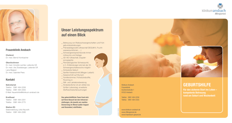 Unser Leistungsspektrum auf einen Blick __ Betreuung von Risikoschwangerschaften und Früh­ geburtsbestrebungen Frauenklinik Ansbach Chefarzt Dr. med. Bernd Hornbacher __ Pränataldiagnostik (Ultraschall DEGUM II, Frucht­ wasserpunktionen, …) __ Schwangerensprechstunde immer mittwochs und freitags __ 3D-/4D-Ultraschall, Dopplersonographie Oberärztinnen Dr. med. Annette Lechler, Leitende OÄ Dr. med. Ute Zitzelsberger, Leitende OÄ Lana Majeed Dr. med. Gabriele Pees Kontakt Sekretariat Telefon 0981 484-2256 Telefax 0981 484-2355 E-Mail: [email protected] Kreißsaal Telefon 0981 484-2351 Telefax 0981 484-2775 d. h. Entbindungen sind ab der 33. Schwangerschaftswoche möglich __ Ambulante Geburt __ Sanfter Kaiserschnitt (Misgav-Ladach) __ Kaiserschnitt auf Wunsch __ Familienzimmer, Frühstücksbuffet, Rooming-in __ Still- und Laktationsberatung __ Kinderärztliche U2 am dritten bis fünften Lebenstag, erweiterte Stoffwechsel­unter­suchungen Klinikum Ansbach Frauenklinik Escherichstraße 1 91522 Ansbach Das geburtshilfliche Team freut sich auf Ihren Besuch bei den Infoveranstaltungen, die jeweils am zweiten Donnerstag im Monat (außer August und Dezember) stattfinden. Telefon 0981 484-2256 Telefax 0981 484-2355 Stand: 6/2017 Station E3 Stationsleitung Jutta Nauroth Telefon 0981 484-2380 __ Perinatologischer Schwerpunkt, www.klinikum-ansbach.de www.ANregiomed.de www.fraenkisch-gesund.de GEBURTSHILFE Für den sicheren Start ins Leben – kompetente Betreuung rund um Geburt und Wochenbett HEBAMMENPRAXIS BAUCHGEFÜHL Telefon 0981 48798477 E-Mail: [email protected] www.hebammen-ansbach.de LIEBE WERDENDE ELTERN, die Frauenklinik Ansbach bietet Ihnen eine moderne, familienorientierte Geburtshilfe während der Geburt und im Wochenbett. In enger Zusammenarbeit mit den Beleg­ hebammen der Hebammengemeinschaft „Bauchgefühl“ sowie der Außenstelle der Cnopf’schen Kinderklinik auf der Station „Wald“ erzielen wir größtmögliche Sicherheit für Mutter und Kind. Frauenarzt, Hebamme, Anästhesist und Kinderarzt (Neonatologe) sind 24 Stunden täglich anwesend – auch am Wochenende. Schwangerenvorsorge Geburt Wochenbett Die Betreuung von Risikoschwangerschaften (z. B. bei Schwangerschaftdiabetes oder Bluthochdruck) kann eng­maschig ambulant oder im Bedarfsfall auch statio­när er­folgen. Während der Geburt werden Sie von Arzt und Hebamme kompetent begleitet. Die Sicherheit von Mutter und Kind steht dabei immer im Mittelpunkt. Auf individuelle Bedürfnisse und Wünsche gehen wir gerne ein. Alle Gebärpositionen sind möglich, verschiedene Positions­hilfen (Hocker, Gebärinsel, Geburts­badewanne) stehen für Sie bereit. Beim uneingeschränkten Rooming-in können Mutter und Kind rund um die Uhr zusammensein. So kann die Mutter leichter ihren individuellen Stillrhythmus entwickeln. Eine erfahrene Stillberaterin begleitet Sie am Beginn Ihres neuen Lebensabschnitts mit einfühl­samer Anleitung und praktischer Hilfe beim Stillen. Wenn Sie nicht stillen wollen oder können, werden Sie natürlich auch hierin unterstützt. Das macht das Klinikum Ansbach zu einem perinatolo­ gischen Schwerpunktkrankenhaus: Entbindungen sind ab der 33. Schwangerschaftswoche möglich, auch Früh­ geburtsbestrebungen und Risikoschwangerschaften können betreut werden. In unserer Schwangerensprechstunde können wir Sie im Rahmen der Vorstellung vor der Geburt durch aus­ führ­liche Untersuchung und Gespräche auf eine sichere Geburt vorbereiten und Ihre individuellen Wünsche für die Geburt Ihres Kindes besprechen. Ebenso können wir Ihnen verschiedene Geburts- und Überwachungsmöglichkeiten sowie Angebote zu Schmerzlinderung (z. B. PDA) vorstellen. Vertrauen Sie deshalb auf unsere kompetente Betreuung rund um die Geburt und bereiten Sie Ihrem Kind einen sicheren Start ins Leben. Wir freuen uns auf Sie! In der Außenstelle der Praxis für Pränatal­medizin und Gene­ tik Nürnberg ist jeden Dienstag der DEGUM-II-Experte Dr. Michael Schälike im Klinikum Ansbach vor Ort und führt die Fehlbildungsdiagnostik durch. Ihr Dr. med. Bernd Hornbacher Chefarzt der Frauenklinik Unsere Hebammen bieten Akupunktur, Homöopathie und Aromatherapie an. Mediziner aus der Klinik für Anästhesie stehen für eine opti­ male Schmerztherapie (Peridural­anästhesie = PDA, Walking PDA, „Kurz-Spinalanästhesie“) unter der Geburt zur Verfü­ gung. Sollte ein Kaiserschnitt erforderlich sein, führen wir den sanften Kaiserschnitt nach Misgav-Ladach durch. Auf Wunsch ist auch eine ambulante Geburt möglich. Für die Betreuung im Wochenbett sorgt rund um die Uhr ein erfahrenes Team aus Ärzten, Kinderschwestern und Hebammen. Im Familienzimmer auf der Entbindungs­ station können Vater und Geschwisterkinder auch über Nacht bei der Wöchnerin bleiben.