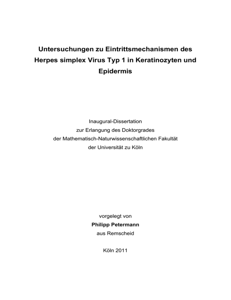 Untersuchungen zu Eintrittsmechanismen des Herpes simplex Virus Typ 1 in Keratinozyten und Epidermis Inaugural-Dissertation zur Erlangung des Doktorgrades der Mathematisch-Naturwissenschaftlichen Fakultät der Universität zu Köln vorgelegt von Philipp Petermann aus Remscheid Köln 2011 Die vorliegende Arbeit wurde am Zentrum für Biochemie (Medizinische Fakultät) der Universität zu Köln angefertigt. Berichterstatter: Professor Dr. Dagmar Mörsdorf Professor Dr. Günter Plickert Tag der mündlichen Prüfung: 20. Januar 2011 -2- ALLES WISSEN UND ALLES VERMEHREN UNSERES WISSENS ENDET NICHT MIT EINEM SCHLUSSPUNKT, SONDERN MIT EINEM FRAGEZEICHEN Hermann Hesse (1877-1962) MEINER FAMILIE -3- Zusammenfassung Keratinozyten der Mukosa, Haut und Kornea stellen die primäre Eintrittspforte für Herpes simplex Virus Typ 1 (HSV-1) in den Wirtsorganismus dar. Das zentrale Interesse dieser Arbeit bestand darin, zu verstehen, wie HSV-1 die Barrierefunktion der Epithelien überkommt und welche molekularen Mechanismen dem Viruseintritt zugrunde liegen, um die Infektion in Keratinozyten erfolgreich zu etablieren. Zunächst wurde die Initiation der HSV-1 Infektion in Keratinozyten untersucht. Ausgehend von der Hypothese, dass die Dynamik der Zellbeweglichkeit und Adhäsion den Viruseintritt beeinflussen können, wurde die Rolle der Rac1-/Cdc42-Signaltransduktion analysiert. Die Rho GTPasen Rac1 und Cdc42 sind zentrale Regulatoren der Aktin-Dynamik. Es zeigte sich, dass die frühe HSV-1 Infektion in der Keratinozyten-Zelllinie HaCaT zu einer temporären Veränderung der Aktivitätszustände von endogenem Rac1 und Cdc42 führte. Wenn konstitutiv aktives Rac1 oder Cdc42 vor der Infektion transient überexprimiert wurde, reduzierte sich die Anzahl infizierter Zellen, wohingegen dominant negatives Rac1 keinen Effekt hatte. Die Abhängigkeit der HSV-1 Infektion von endogenem Rac1 und Cdc42 sollte daher durch RNA Interferenz-Analysen überprüft werden. Nach Reduktion von endogenem Rac1 und/oder Cdc42 wurde sowohl in HaCaT-Zellen als auch in humanen primären Keratinozyten kein Effekt auf die Initiation der viralen Genexpression beobachtet. Zur weiteren Analyse wurde murine Epidermis, deren Keratinozyten kein endogenes Rac1 exprimierten, ex vivo infiziert. Ähnlich wie in den Kontroll-Tieren wurden auch in der Abwesenheit von Rac1 die basalen Keratinozyten in der Epidermis infiziert. Daher kann der Schluss gezogen werden, dass die Initiation der HSV-1 Infektion von Keratinozyten nicht von der Rac1-/Cdc42-Signaltransduktion abhängig ist und konstitutiv aktives Rac1 und Cdc42 das Potential haben mit der frühen HSV-1 Infektion zu interferieren. Zur weiteren Charakterisierung des Eintrittsmechanismus von HSV-1 in Keratinozyten wurde zuerst die Internalisierung der Viruspartikel elektronenmikroskopisch untersucht. Dabei wurden sowohl Kapside im Zytoplasma als auch umhüllte Viruspartikel in Vesikeln beobachtet. Interessanterweise waren in den humanen primären Keratinozyten im Gegensatz zu den HaCaT-Zellen mehr umhüllte Viruspartikel in Vesikeln als Kapside im Zytoplasma zu finden. Diese Ergebnisse weisen auf eine Internalisierung durch Fusion der Virushülle mit der Plasmamembran und auf eine endozytotische Aufnahme hin. Wenn die GTPase-Aktivität von Dynamin2 durch den Inhibitor Dynasore gehemmt wurde, konnten beide Internalisierungswege nicht mehr beobachtet werden. EM-Aufnahmen zeigten stattdessen Viruspartikel an invaginierten Stellen der Plasmamembran. Die Behandlung mit Dynasore führte nicht nur in Keratinozyten zu einer Inhibition der Infektion, sondern hemmte auch die ex vivo Infektion muriner Epidermis. Diese Daten legen erstmals eine Beteiligung von Dynamin an der Internalisierung von HSV-1 in Keratinozyten nahe. Um der Bedeutung einer endozytotischen Virusaufnahme nachzugehen, wurden Inhibitor- und Kolokalisierungsstudien durchgeführt. Die Hemmung der Endosomen-Ansäuerung durch Ammoniumchlorid ergab eine konzentrationsabhängige Reduktion von infizierten Zellen. Weiterhin wurde die Kolokalisierung von Viruspartikeln mit frühen Endosomen, nicht aber mit Lysosomen, beobachtet. Diese ersten Ergebnisse deuten die Beteiligung eines endozytotischen Aufnahmeweges an. -4- Um die Barrierefunktion des Epithels zu verstehen, wurden ex vivo Infektionsstudien in Haut- und Epidermisstücken durchgeführt. Das Ziel war es zunächst den initialen Eintrittsweg in das Gewebe zu charakterisieren. Wenn murine Haut in Virussuspension inkubierte, wurden keine infizierten Zellen beobachtet. Erst nach Trennung der Epidermis von der Dermis mit Hilfe von DispaseII wurden infizierte basale Keratinozyten gefunden. Wenn die Epidermis durch EDTA-Behandlung abgetrennt wurde, war allerdings keine Infektion nachweisbar. Das ex vivo Infektionsmodell wurde auch für humane orale Schleimhaut etabliert. Ähnlich zu dem murinen Gewebe wurden basale Keratinozyten in isolierter Epidermis infiziert, nicht aber komplette Schleimhautstücke. Wenn die Schleimhautstücke vor Infektion mechanisch verwundet wurden, konnten infizierte Zellen entlang der Verwundungslinie beobachtet werden. Die Anzahl der infizierten Zellen erhöhte sich, wenn die verwundeten Schleimhautstücke vor Infektion in Keratinozyten-Medium inkubiert wurden. Die Ergebnisse zeigen, dass basale Keratinozyten infiziert werden können, sobald diese durch DispaseII-Behandlung für das Virus zugänglich waren. Erste Verwundungsstudien deuten an, dass der Eintritt von HSV-1 in die humane Schleimhaut von der Zugänglichkeit zu nicht-differenzierten bzw. sich in der Differenzierungbefindlichen Keratinozyten abhängt. -5- Abstract Mucosal, epidermal and corneal keratinocytes represent the primary entry portal for herpes simplex virus type 1 (HSV-1) during infection of its human host. The longterm goal is to understand how HSV-1 overcomes the barrier function of the epithelia and on which molecular mechanisms virus entry depends to establish successful infection in keratinocytes. F