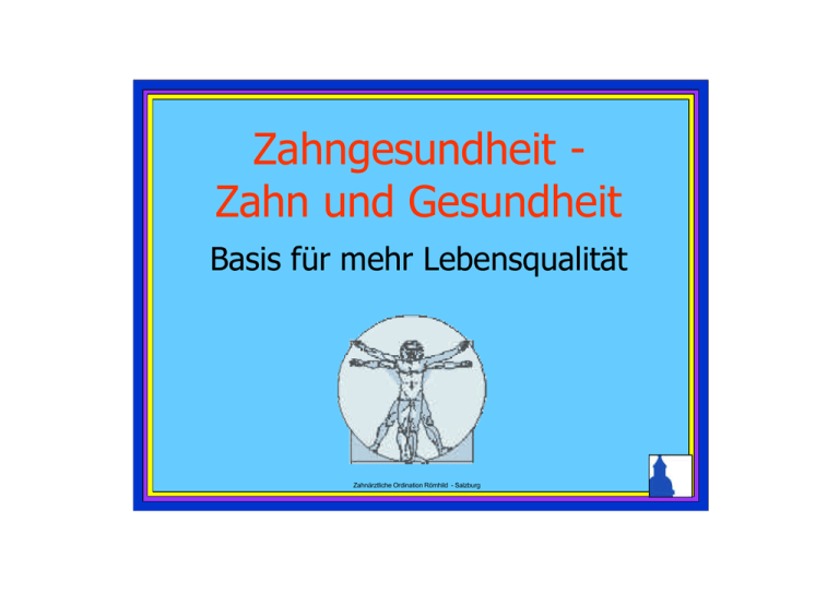 Zahngesundheit Zahn und Gesundheit Basis für mehr Lebensqualität Zahnärztliche Ordination Römhild - Salzburg Berchtesgaden Salzburg Ludwig u. Dorothea Römhild Zahnärztliche Ordination Römhild - Salzburg Zahngesundheit – was ist das? 1. Freiheit von Zahnbelag! 2. Ein intakter Schmelzmantel! 3. Ein blass-rosa Zahnfleisch! 4. Angenehme Kaufähigkeit des Gebisses 5. Ästhetisches Erscheinungsbild der Zähne = Harmonie zwischen Zahn und Weichgewebe Zahnärztliche Ordination Römhild - Salzburg Zahngesundheit – was ist das ? 6. Harmonie zwischen Zahn und Körper Zahnärztliche Ordination Römhild - Salzburg Gesund beginnt im Mund ! Zahnärztliche Ordination Römhild - Salzburg Welche Störungen der Zahngesundheit können im Mund entstehen? Zahnärztliche Ordination Römhild - Salzburg Karies !!! Bakterienplaque Löcher + Infekte Zahnärztliche Ordination Römhild - Salzburg Folgen der Karies: Zahnärztliche Ordination Römhild - Salzburg Nervenentzündung 1. Infektion des Zahnnervs 2. Durch: Karies, undichte Füllungen, Trauma durch Beschleifen der Zähne 3. Geringe Beschwerden bis schwerster, ziehender Schmerz Zahnärztliche Ordination Römhild - Salzburg Infektion des Kieferknochens • Untergang des Nerven durch Bakterien • Bakterien dringen in den Wurzelkanal ein • Danach in den Kieferknochen • Abwehrfront des Körpers • Überwindung der Abwehrfront • Eindringen in den Körper Zahnärztliche Ordination Römhild - Salzburg Wurzelfüllungen – auch zahngesund? Der wurzelgefüllte Zahn Der infiziertem Zahn Der gereinigte Zahn Zahnärztliche Ordination Römhild - Salzburg Wurzelfüllungen Gelingt die Entfernung der Bakterien kann der Knochendefekt ausheilen – auch noch zahngesund? vorher nachher Aber: Ist die Zahngesundheit wirklich erreicht? Kann der Köper die restlichen Bakterien tolerieren? Zahnärztliche Ordination Römhild - Salzburg Herde >>> im Kausystem durch Karies: Tote Zähne Infektionen im Kieferknochen (Zysten, Granulome) Wurzelfüllungen? Chronische Kieferhöhlenentzündung Zahnärztliche Ordination Römhild - Salzburg Folgen von Zahnherden für die Gesundheit: Bakteriämie = Eindringen von Bakterien/Toxinen in d. Blutbahn Infektion von Blut und Organen Störung der Funktionskreise und der zugehörigen Organe Störung der Regulationsfähigkeit Zahnärztliche Ordination Römhild - Salzburg Zahn – Organbeziehungen: Zahnärztliche Ordination Römhild - Salzburg Parodontitis – die schleichende Zahnbettinfektion Bakterien erweichen den Zahnfleischring Dringen in die Tasche ein Zerstören den Knochen 1 2 3 4 Zahnärztliche Ordination Römhild - Salzburg 5 Ursachen der Parodontitis: Bakterien Ernährung Veranlagung Rauchen Diabetes Zahnärztliche Ordination Römhild - Salzburg Immunlage Parodontitis und ihre Erkennungszeichen: Wenig Schmerzen Blutungen Mundgeruch Knochenverlust ! Lockerung Schmerzen am Ende – der Zahn ist verloren! Zahnärztliche Ordination Römhild - Salzburg Parodontitis Fördert Verklumpung der Thrombozyten: + 2,8 + 2,0 Schlaganfall Herzinfarkt +8 Embolie Untergewichtige Säuglinge Zahnärztliche Ordination Römhild - Salzburg Materialunverträglichkeiten: JEDES MATERIAL IM MUND IST EIN „IMPLANTAT“ ! Amalgam Aufbrennlegierung Brückenmetall Prothesenmetalle Zahnärztliche Ordination Römhild - Salzburg Materialunverträglichkeiten Wechselwirkung zwischen verschiedenen Metallen Stromfluss = Abgabe von Metallpartikeln Bildung von Metalloxiden = chemisch-physikalische Reaktion Zahnärztliche Ordination Römhild - Salzburg und ihre Wirkung Materialunverträglichkeiten 1 Material 4 5 Identifikation Körperflüssigkeit 2 Ablehnung 6 Immunsystem 7 8 3 Zustimmung Fazit: Unverträglichkeit hängt immer mit dem individuellen Träger zusammen! Zahnärztliche Ordination Römhild - Salzburg Materialunverträglichkeiten Beispiel: Amalgam ! (Sondermüll) Silber Toxisches Material Kupfer Strom Quecksilber ca. 50 % Oxide ! Die Tatsache, dass direkte Zusammenhänge mit Erkrankungen nicht nachweisbar sind ist keine Entlastung! Zahnärztliche Ordination Römhild - Salzburg Materialunverträglichkeiten Amalgamfolgen: Konzentration Immunsystem (Enzymblocker) Organe Hormonsystem Schleimhäute Nervensystem Allergien Solange die Menschen sich nicht erbrechen wird weitergemacht! Zahnärztliche Ordination Römhild - Salzburg Regeln der Amalgamentfernung: Unspezifische Entgiftung: Leber, Lymphe, Niere Darmsanierung nach d. letzten Am Füllung Kofferdam Schutz!! Eventuell Zwischenfüllungen Entfernung der Amalgamfüllungen Ausleittherapie: Homöopathisch Bioresonanz Zahnärztliche Ordination Römhild - Salzburg Chlorella Algen, Koriander ÖL, Chelatbildner: DMPS Was können wir SELBST zum Erhalt der Zahngesundheit tun ?? Zahnärztliche Ordination Römhild - Salzburg Rauchen einstellen !!! Rauchen zerstört (außer der Gesundheit) auch das Zahnbett und baut den Kieferknochen ab! Zahnärztliche Ordination Römhild - Salzburg Die richtige Ernährung: Zahnärztliche Ordination Römhild - Salzburg Zahnprophylaxe: Zahnärztliche Ordination Römhild - Salzburg Je weniger Metall – um so besser! Amalgam Goldlegierungen ? Bravo !!! Stahl? Titan? Brückenmetall? Zahnärztliche Ordination Römhild - Salzburg Alternativen zu Metallen im Mund am Beispiel AMALGAM: Keramik ..... dicht geklebt! aahhh ... oohhh! Amalgam ... möglichst nicht ! Zahnärztliche Ordination Römhild - Salzburg Die beste Füllung ist KEINE Füllung oder anders gesagt: KEINE Krone ist eine gute Krone Zahnärztliche Ordination Römhild - Salzburg Defensive, gute Zahnmedizin: • Behandlung ohne Zeitlimit! • Qualität ist vorrangig vor der Honorarmenge! • Der Blick über den Zahn hinaus! (ganze Mensch)! • Amalgamentfernung NUR mit Kofferdam! • Zahnsubstanz erhalten statt ersetzen! Zahnärztliche Ordination Römhild - Salzburg Worauf Sie als Patient wert legen sollten Man hat Zeit für Sie! Freundliche Mitarbeiter Kostenvoranschläge Wenige wartende Patienten Arbeiten halten jahrelang im Mund! Wa