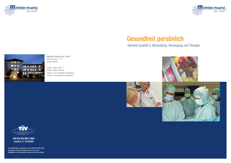 Gesundheit persönlich Höchste Qualität in Behandlung, Versorgung und Therapie Mathilden Hospital gem. GmbH Renntormauer 1 – 3 32052 Herford Telefon: 05221.593-0 Telefax: 05221.593-126 Internet: www.mathilden-hospital.de E-Mail: [email protected] DIN EN ISO 9001:2000 Zertifikat: 01 100 000880 Das Mathilden Hospital ist nach DIN EN ISO 9001 zertifiziert: Damit verpflichten wir uns, hohe Maßstäbe an die Qualität unserer Arbeit zu stellen. Inhalt Impressum Die vorliegende Broschüre unterliegt dem Urheberrecht. Nachdruck, auch auszugsweise, nur mit Genehmigung des Herausgebers. Herausgeber Mathilden Hospital gem. GmbH Renntormauer 1-3 32052 Herford Redaktion Jens-Ulrich Röthe Realisation Röthe Konzept & Fotografie GmbH 2 Impressum 3 Inhaltsverzeichnis 4 Willkommen im Mathilden Hospital 6 Seelsorge, Oase, die „Grünen Damen“ 8 Qualitätsmanagement, Hygiene 10 Die Kliniken im Mathilden Hospital 12 Medizinische Klinik I 14 Medizinische Klinik II 16 Klinik für Anästhesiologie 20 Klinik für Allgemein-, Viszeral- und Unfallchirurgie 22 Klinik für Radiologie 24 Frauenklinik 28 Geburtshilfe im BABYnest 30 HNO-Belegärzte, Physikalische Therapie 32 Pflegedienst, Sozialdienst 34 Verwaltung, Klinikleitung Mathilden Hospital Herford. Jetzt sind wir für Sie da. Wie entscheidend Gesundheit ist merken wir jetzt, wenn wir darüber nachdenken. Bei uns finden Sie sich schnell zurecht. Wie Zuhause. Das Mathilden Hospital Herford ist ein Krankenhaus der Grund- und Regelversorgung. Sie werden sehen, bei uns ist alles überschaubar. Aber perfekt bis ins letzte Detail. Gerade weil es so überschaubar ist. Wir sind sehr stolz darauf, dass unsere „Mathilde“ und unser Engagement von sehr vielen Menschen angenommen werden. Sie sind im Mathilden Hospital Herford. Vielleicht weil Sie sich bewusst für uns entschieden haben, vielleicht weil es der Zufall so wollte, oder der Notfall es so gefügt hat. Wie auch immer – es ist für Sie eine neue, eine andere und nicht alltägliche Situation. Das wissen wir und geben deshalb für Sie unser Bestes. Das Mathilden Hospital. Mitten in Herford. Strukturiert gewachsen. Die Geschichte des Mathilden Hospitals beginnt im Jahr 1887 als Thuiner Franziskanerinnen in Herford eine ambulante Krankenpflegestation einrichteten. Schon bald wurden die ersten Patienten stationär aufgenommen. Allmählich entstand so ein Krankenhaus im eigentlichen Sinne, das am 25. Juni 1891 die offizielle Genehmigung der königlichen Regierung in Minden bekam. Seinen heutigen Namen - Mathilden Hospital - erhielt das „Katholische Krankenhaus Herford“ zur Einweihung des Neubaus am 26.11.1957. Die „Heilige Mathilde“ (895 - 968) als Namensgeberin war ein echtes Vorbild christlicher Nächstenliebe und Hilfe. Für die Anforderungen der Zukunft gerüstet zu sein heißt, Wissen und Kompetenz in hohem Maße konzentriert zur Verfügung zu haben. Einer der Gründe, dass wir uns mit dem Franziskus Hospital in Bielefeld und dem St. Vinzenz Hospital in Rheda-Wiedenbrück zur „Katholischen Hospitalvereinigung Ostwestfalen gem. GmbH“ zusammen geschlossen haben. 4 Lassen Sie sich fallen. Ein wenig so, wie Zuhause. Geben Sie einen Teil Ihrer Verantwortung für sich ab. An uns. Wenn Sie wollen. Wir Mitarbeiter sind hier im Mathilden Hospital, weil wir hier sein wollen. Weil wir etwas für Sie tun wollen. Wir alle haben unseren Beruf gewählt, weil wir Ihnen helfen möchten. Dafür engagieren wir uns. Dafür bilden wir uns weiter. Dafür arbeiten wir Tag und Nacht. An sieben Tagen in der Woche. Und zwar gerne. 5 Die „Grünen Damen“ Als ehrenamtliche Mitarbeiterinnen und Mitarbeiter der christlichen Nächstenliebe handeln die „Grünen Damen“. Sie haben es sich zur Aufgabe gemacht den Patientinnen und Patienten mit Rat und Tat zur Seite zu stehen. Sie verstehen sich dabei als Begleiterinnen, die Ihnen Unterstützung geben und gerne für Sie tätig sind. Hierbei kann es sich um ein wohltuendes Gespräch am Krankenbett handeln oder um einen gemeinsamen Spaziergang. Die „Grünen Damen“ sind gerne für Sie da. Offen für Menschen aller Religionen, Konfessionen und Weltanschauungen. Seelsorge, Oase und die „Grünen Damen“ - Ang ebot und Hilfestellung Die Krankenhaus-Seelsorge des Mathilden Hospitals versteht sich als eine begleitende Seelsorge während Ihres Krankenhausaufenthaltes. Aus dem christlichen Glauben heraus wissen sich die Seelsorgenden zu allen Menschen gesandt und gestalten im Sinne dieses Glaubens den Krankenhausdienst mit. Dementsprechend sind die Angebote der Seelsorge offen für Menschen aller Schwester Christina Schnittker und Pastor Detlef Stüwe 6 Religionen, Konfessionen und Weltanschauungen. Unsere Kapelle Eine zentrale Rolle nimmt unsere Kapelle ein. Hier wird Gottesdienst gefeiert, hierhin gehen Menschen zum stillen Gebet. Sollten Sie aus gesundheitlichen Gründen nicht an unserer Hl. Messe und am Gottesdienst teilnehmen können, erfolgt die kostenlose Übertragung über den Radio- kanal 3 sowie über den Fernsehkanal 33. Die Mathilden-Oase Als Ort der Ruhe und Sammlung versteht sich auch die Mathilden-Oase. Hier haben Sie die Möglichkeit ein gutes Buch zu lesen und sich mit Angehörigen und Freunden zu einem Gespräch zu treffen. Oder von unserer umfangreichen Spielesammlung Gebrauch zu machen. Die „Heilige Mathilde“ Die Mathilden-Oase 7 Qualitätsmanagement im Mathilden Hospital überzeugend und zertifiziert. Qualitätsmanagement - TÜV zertifiziert Qualitätsmanagement im Mathilden Hospital- überzeugend durch kontinuierliche Verbesserung. Behandlungserfolg und Patientenzufriedenheit stehen bei uns an erster Stelle. Für unsere Mitarbeiterinnen und Mitarbeiter bedeutet das eine stete Herausforderung. Doch der stellen wir uns gerne. Wir überprüfen die Arbeitsabläufe und verbessern sie ständig. Wir wollen durch kontinuierliche Qualität überzeugen und eine optimale Patientenversorgung sichern. Eine Behandlung nach dem aktuellen Stand der Wissenschaft