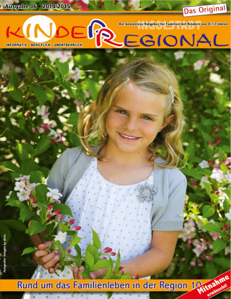 Ausgabe 06 • 2014/2015 Anzeige Inhalt INHALT t Die Arbei t davon, läuft nich Kind du deinem während igst, ze enbogen einen Reg ogen b en eg R aber der mit ht, bis du wartet nic ig bist rt fe t ei der Arb es (chinesisch t) Sprichwor Vorwort Liebe Leserinnen und Leser, sollte Förderung im Vordergrund stehen? Oder sollten Werte wie Liebe, Vertrauen, Zuneigung, Sicherheit und Geborgenheit den Freiraum schenken, den ein Kind braucht. Förderund bildet, Freiraum fotogen by doris Schwangerschaft ab Seite 04 Was soll in den Klinkkoffer Webseiten für Famlien Mutterglück Teil 4 Stillen fotogen by doris ab Seite 12 Schule Wenn Weizen Bauchweh macht Kurz und bündig Schokolade ist ungesund. Hilfreiche Adressen Der richtige Arbeitsplatz Schule ist nicht alles Gesundheit Einkaufen ab Seite 16 Hilfreiche Adresse Notrufnummern Früherkennungsuntersuchungen Das besondere Kind Ausgrenzung Toleranz Till ist nun ein Stern Hilfreiches von A-Z Ein Kind sollte beides in seiner Kindheit erfahren, so wird es mit Sicherheit ein Vernünftiger und glücklicher Erwachsener, der wissen wird, was ihm wichtig im Leben ist und was er erreichen möchte. ab Seite 22 ab Seite 32 ab Seite 36 Second Hand Naturfasern für Babyhaut Tatort Supermarktkasse Freizeit Sicher im Internt Ist Lesen noch cool Reisen mit Baby ab Seite 38 Ich habe selber drei Kinder und weiß, dass man immer wieder in Versuchung gerät, dass man sich anzetteln lässt vom Förderwahn, der immer mehr zunimmt. Das der Druck von der Gesellschaft immer größer wird. Doch genau hier sollte man abwägen und vielleicht die Notbremse ziehen. Überlegen was man für sein Kind möchte. Was das Kind sich wünscht, sollte jedoch immer im Vordergrund stehen. Gemeinsam nach Alternativen suchen und dann zusammen entscheiden. Und ganz entspannt das gemeinsame Älterwerden der Kinder genießen und gemeinsam sich Raum für die Zeit nehmen. Zeit haben sich auch meine Experten und Anzeigenpartner genommen, ohne sie könnte ich Ihnen den Familienratgeber „Kinder Regional“ nicht kostenlos zur Verfügung stellen. Hierfür möchte ich mich bei allen Mitwirkenden bedanken. Herzlichst, Ihre Zontar Iris Foto Sawall fotogen by doris KINDER REGIONAL 6/2014 3 Schwangerschaft SCHWANGER Hilfreiche Adressen Allgemein Bayrisches Rotes Kreuz Kreisverband Ingolstadt Auf der Schanz 30, 85049 Ingolstadt Telefon 0841 - 933312 Fax 0841 - 933329 Erste Hilfe am Kind, Erste Hilfe Maßnahmen in allen Bereichen des täglichen Lebens, Termine auf Anfrage, Schreibabyberatung: Erziehungs- und Familienberatung Gabelsbergerstr. 46 , 85057 Ingolstadt Telefon 0841 - 99 35 440 Babymassage / Schwimmen Geburtshaus Ingolstadt Telefon 0841 - 9937900 [email protected] www.geburtshaus-ingolstadt.de Brigitte Leber siehe Hebamme / Schwangerschaft Beratung Katholische Beratungsstelle für Schwangerschaftsfragen Schrannenstraße 1a, 85049 Ingolstadt Telefon 0841 - 93 755 60 Fax 0841 - 93 755 30 [email protected] www.skf-ingolstadt.de Umfassende Hilfe und Beratung in allen Fragen, die im Zusammenhang mit Schwangerschaft, Sexualität, Geburt und Elternschaft auftreten. Beratung und Begleitung von Eltern nach Geburt des Kindes bis zum 3. Lebensjahr Beratung im Zusammenhang mit vorgeburtlichen Untersuchungen (Pränataldiagnostik) und bei zu erwartender Behinderung des Kindes. Beratung nach Fehlgeburt, nach Schwangerschaftsabbruch. Unterstützung in existentiellen Notlagen und Krisensituationen. Hilfe in fotogen by doris rechtlichen Fragen (z.B. Mutterschutz, Elternzeit, Elterngeld, Betreuungsgeld) Landesstiftung). Hilfe bei der Wohnungssuche Beratung bei unerfülltem Kinderwunsch (Die Beratungsstelle ist Mitglied im Beratungsnetzwerk Kinderwunsch Deutschland (BkiD) www.bkid.de) Besondere Angebote • Beratung für Alleinerziehende • Vermittlung von Familienhebammen für Schwangere und Eltern während des gesamten ersten Lebensjahres ihres Kindes • Stillberatung, Tragetuchberatung und Ernährungsberatung • sexualpädagogische Angebote für Mädchen, Jungen und Schulklassen (z.B. Zyklusshow, Agenten auf dem Weg) • Onlineberatung im besonders geschützten Portal unter www.skf-ingolstadt.de • Aktion Babykorb: Baby- und Kinderbekleidung für Familien in Notsituationen Staatlich anerkannte Beratungsstelle für Schwangerschaftsfragen Frauen beraten e.V. Wagnerwirtsgasse 2, 85049 Ingolstadt Telefon 0841 - 370 83 03 www.frauenberaten-in.de Beratung in allen Fragen rund um Schwangerschaft, Sexualität, Geburt und Elternschaft. Gesetzliche Beratung nach § 219 StGB (Schwanger- Jutta Christiansen-Zimmermann Dr.-Kurt-Schumacher Ring 2a 85139 Wettstetten Telefon 0841 - 390711, Fax 0841 - 390731 [email protected] Physikalische Therapien aller Arten im Nass und Trockenbereich, Akupunkt-Massage nach Penzel zur Schwangerschaftsbegleitung und Geburtsvorbereitung für Mutter und Kind, Ernährungsberatung nach den fünf Elementen, Baby- und Kinderschwimmkurse Aqua-Training zur Rückbildung und allgemeinen Fitness, Trainingstherapie zur Gesunderhaltung und viele Kurse, Schmerztherapie und Chinesio Taping Hebammen / Schwangerschaft Med. FEGE Zentrum Beratung u. Hilfe in allen Fragen, die im Zusammenhang mit einer Schwangerschaft auftreten Beratung im Zusammenhang mit vorgeburtlichen Untersuchungen Beratung in Krisensituationen vor und nach Geburt eines Kindes Beratung von Eltern bis zum 3. Lebensjahr ihres Kindes Vermittung von finanziellen und von lebenspraktischen Hilfen Hilfe bei Antragsstellungen, im Umgang mit Behörden, bei der Suche nach Betreuungs- und Fördermöglichkeiten • Familienhebammenhilfe in der Schwangerschaft und im ersten Lebensjahr des Kindes 4 KINDER REGIONAL 6/2014 Sozialdienst katholischer Frauen e.V. -SchwangerschaftsberatungSchrannenstr. 1 a 85049 Ingolstadt Telefon 0841 - 9375560 [email protected] www.skf-ingolstadt.de Gabriele Schlesinger, Hebamme Harderstraße 12, 85049 Ingolstadt Telefon 0841 - 9937273 Geburtshaus Ingolstadt Telefon 0841 - 9937900 siehe Hebamme / Schwangerschaft Hebamme Hei