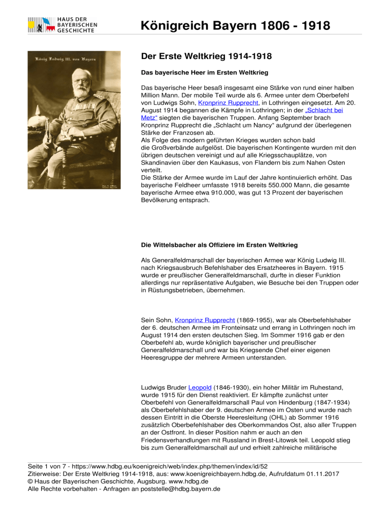 Königreich Bayern 1806 - 1918 Der Erste Weltkrieg 1914-1918 Das bayerische Heer im Ersten Weltkrieg Das bayerische Heer besaß insgesamt eine Stärke von rund einer halben Million Mann. Der mobile Teil wurde als 6. Armee unter dem Oberbefehl von Ludwigs Sohn, Kronprinz Rupprecht, in Lothringen eingesetzt. Am 20. August 1914 begannen die Kämpfe in Lothringen; in der „Schlacht bei Metz“ siegten die bayerischen Truppen. Anfang September brach Kronprinz Rupprecht die „Schlacht um Nancy“ aufgrund der überlegenen Stärke der Franzosen ab. Als Folge des modern geführten Krieges wurden schon bald die Großverbände aufgelöst. Die bayerischen Kontingente wurden mit den übrigen deutschen vereinigt und auf alle Kriegsschauplätze, von Skandinavien über den Kaukasus, von Flandern bis zum Nahen Osten verteilt. Die Stärke der Armee wurde im Lauf der Jahre kontinuierlich erhöht. Das bayerische Feldheer umfasste 1918 bereits 550.000 Mann, die gesamte bayerische Armee etwa 910.000, was gut 13 Prozent der bayerischen Bevölkerung entsprach. Die Wittelsbacher als Offiziere im Ersten Weltkrieg Als Generalfeldmarschall der bayerischen Armee war König Ludwig III. nach Kriegsausbruch Befehlshaber des Ersatzheeres in Bayern. 1915 wurde er preußischer Generalfeldmarschall, durfte in dieser Funktion allerdings nur repräsentative Aufgaben, wie Besuche bei den Truppen oder in Rüstungsbetrieben, übernehmen. Sein Sohn, Kronprinz Rupprecht (1869-1955), war als Oberbefehlshaber der 6. deutschen Armee im Fronteinsatz und errang in Lothringen noch im August 1914 den ersten deutschen Sieg. Im Sommer 1916 gab er den Oberbefehl ab, wurde königlich bayerischer und preußischer Generalfeldmarschall und war bis Kriegsende Chef einer eigenen Heeresgruppe der mehrere Armeen unterstanden. Ludwigs Bruder Leopold (1846-1930), ein hoher Militär im Ruhestand, wurde 1915 für den Dienst reaktiviert. Er kämpfte zunächst unter Oberbefehl von Generalfeldmarschall Paul von Hindenburg (1847-1934) als Oberbefehlshaber der 9. deutschen Armee im Osten und wurde nach dessen Eintritt in die Oberste Heeresleitung (OHL) ab Sommer 1916 zusätzlich Oberbefehlshaber des Oberkommandos Ost, also aller Truppen an der Ostfront. In dieser Position nahm er auch an den Friedensverhandlungen mit Russland in Brest-Litowsk teil. Leopold stieg bis zum Generalfeldmarschall auf und erhielt zahlreiche militärische Seite 1 von 7 - https://www.hdbg.eu/koenigreich/web/index.php/themen/index/id/52 Zitierweise: Der Erste Weltkrieg 1914-1918, aus: www.koenigreichbayern.hdbg.de, Aufrufdatum 01.11.2017 © Haus der Bayerischen Geschichte, Augsburg. www.hdbg.de Alle Rechte vorbehalten - Anfragen an [email protected] Königreich Bayern 1806 - 1918 Auszeichnungen. Der Kriegsverlauf an der Ostfront und der Separatfrieden Frieden von Brest-Litowsk 1917/18 Der Frontverlauf im Osten, wo deutsche Truppen mit österreichisch-ungarischen kämpften, zog sich von der Ostsee über die Karpaten bis zum Schwarzen Meer und nach Asien. Der Hauptkriegsgegner Russland schied Ende 1917 infolge des Ausbruchs der Oktoberrevolution im eigenen Land aus dem Krieg aus. Dem Waffenstillstand zwischen Deutschland und Russland im Dezember folgten, unter Mitwirkung des Oberbefehlshabers Ost, Ludwigs Bruder Leopold (1846-1930), Friedensverhandlungen beider Staaten. Die Verzögerungstaktik der russischen Seite unter ihrem Verhandlungsführer Leo Trotzki (1879-1940) führte im Februar kurzzeitig zur Aufkündigung des Waffenstillstands von deutscher Seite und zu neuerlichen Kampfhandlungen. Erst unter ihrem Eindruck wurde am 3. März 1918 der Sonderfrieden Deutschlands mit Russland im Friedensvertrag von Brest-Litowsk besiegelt und somit der Kampf an der Ostfront beendet. Teile der deutschen Truppen verblieben zur Verwaltung der besetzen Gebiete allerdings weiterhin im Osten. Der deutschen Strategie an der Westfront verlieh dieser Sonderfrieden von Brest-Litowsk, durch die nun frei werdenden Truppen, nochmals Auftrieb. Der Kriegsverlauf an der Westfront An der Westfront gestaltete sich der Kriegsverlauf anders als zunächst von vielen erwartet. Anstatt eines schnellen deutschen Sieges entwickelte sich ein Stellungs- und Grabenkrieg: Ohne größere Gebietsgewinne, wurde um kleine Ortschaften, um einzelne Hügel und Täler verbissen gekämpft. Der Einsatz von modernem technischem Kriegsmaterial und -gerät brachte immense Verluste mit sich. Als Symbol für die Sinnlosigkeit dieser Kriegsführung stehen die Schlachten um Verdun und an der Somme: In der Schlacht um Verdun, der ersten großen Materialschlacht des Ersten Weltkriegs, die von Februar bis Juli 1916 andauerte, waren etwa 700.000 Franzosen und Deutsche gefallen oder verwundet. In der im Juni 1916 beginnenden Schlacht an der Somme waren es über eine Million Briten, Franzosen und Deutsche, die ihr Leben ließen oder Verwundungen erlitten. Der Frontverlauf war nach Ende der Kämpfe im November 1916 nahezu unverändert. Seite 2 von 7 - https://www.hdbg.eu/koenigreich/web/index.php/themen/index/id/52 Zitierweise: Der Erste Weltkrieg 1914-1918, aus: www.koenigreichbayern.hdbg.de, Aufrufdatum 01.11.2017 © Haus der Bayerischen Geschichte, Augsburg. www.hdbg.de Alle Rechte vorbehalten - Anfragen an [email protected] Königreich Bayern 1806 - 1918 Aufgrund des wiederaufgenommenen uneingeschränkten U-Boot-Kriegs der Deutschen, also der Beschießung feindlicher Schiffe ohne die vorher übliche Warnung, traten die USA Anfang April 1917 in den Krieg ein. Damit verringerten sich die Erfolgsaussichten für die deutsche Armee im Westen immer weiter. Auch die deutsche Frühjahroffensive von 1918, die den entscheidenden Sieg bringen sollte, blieb letztlich erfolglos. Die Technisierung und die Totalität des Ersten Weltkriegs In mehrerlei Hinsicht stellte der Erste Weltkrieg eine Zäsur dar und brachte neue Dimensionen der Kriegsführung hervor. Militärhistorisch war es die erste kriegerische Auseinandersetzung, die eine umfassende Industr
