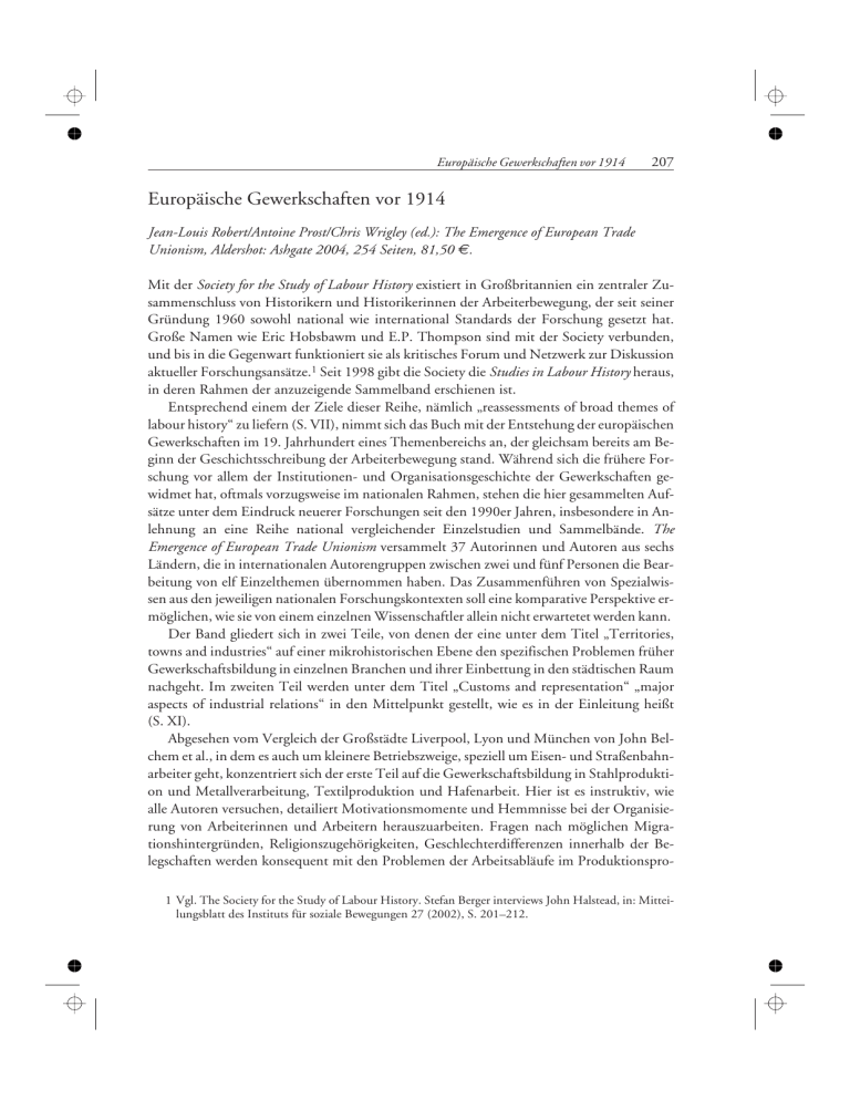 Europäische Gewerkschaften vor 1914 207 Europäische Gewerkschaften vor 1914 Jean-Louis Robert/Antoine Prost/Chris Wrigley (ed.): The Emergence of European Trade Unionism, Aldershot: Ashgate 2004, 254 Seiten, 81,50 €. Mit der Society for the Study of Labour History existiert in Großbritannien ein zentraler Zusammenschluss von Historikern und Historikerinnen der Arbeiterbewegung, der seit seiner Gründung 1960 sowohl national wie international Standards der Forschung gesetzt hat. Große Namen wie Eric Hobsbawm und E.P. Thompson sind mit der Society verbunden, und bis in die Gegenwart funktioniert sie als kritisches Forum und Netzwerk zur Diskussion aktueller Forschungsansätze.1 Seit 1998 gibt die Society die Studies in Labour History heraus, in deren Rahmen der anzuzeigende Sammelband erschienen ist. Entsprechend einem der Ziele dieser Reihe, nämlich „reassessments of broad themes of labour history“ zu liefern (S. VII), nimmt sich das Buch mit der Entstehung der europäischen Gewerkschaften im 19. Jahrhundert eines Themenbereichs an, der gleichsam bereits am Beginn der Geschichtsschreibung der Arbeiterbewegung stand. Während sich die frühere Forschung vor allem der Institutionen- und Organisationsgeschichte der Gewerkschaften gewidmet hat, oftmals vorzugsweise im nationalen Rahmen, stehen die hier gesammelten Aufsätze unter dem Eindruck neuerer Forschungen seit den 1990er Jahren, insbesondere in Anlehnung an eine Reihe national vergleichender Einzelstudien und Sammelbände. The Emergence of European Trade Unionism versammelt 37 Autorinnen und Autoren aus sechs Ländern, die in internationalen Autorengruppen zwischen zwei und fünf Personen die Bearbeitung von elf Einzelthemen übernommen haben. Das Zusammenführen von Spezialwissen aus den jeweiligen nationalen Forschungskontexten soll eine komparative Perspektive ermöglichen, wie sie von einem einzelnen Wissenschaftler allein nicht erwartetet werden kann. Der Band gliedert sich in zwei Teile, von denen der eine unter dem Titel „Territories, towns and industries“ auf einer mikrohistorischen Ebene den spezifischen Problemen früher Gewerkschaftsbildung in einzelnen Branchen und ihrer Einbettung in den städtischen Raum nachgeht. Im zweiten Teil werden unter dem Titel „Customs and representation“ „major aspects of industrial relations“ in den Mittelpunkt gestellt, wie es in der Einleitung heißt (S. XI). Abgesehen vom Vergleich der Großstädte Liverpool, Lyon und München von John Belchem et al., in dem es auch um kleinere Betriebszweige, speziell um Eisen- und Straßenbahnarbeiter geht, konzentriert sich der erste Teil auf die Gewerkschaftsbildung in Stahlproduktion und Metallverarbeitung, Textilproduktion und Hafenarbeit. Hier ist es instruktiv, wie alle Autoren versuchen, detailiert Motivationsmomente und Hemmnisse bei der Organisierung von Arbeiterinnen und Arbeitern herauszuarbeiten. Fragen nach möglichen Migrationshintergründen, Religionszugehörigkeiten, Geschlechterdifferenzen innerhalb der Belegschaften werden konsequent mit den Problemen der Arbeitsabläufe im Produktionspro1 Vgl. The Society for the Study of Labour History. Stefan Berger interviews John Halstead, in: Mitteilungsblatt des Instituts für soziale Bewegungen 27 (2002), S. 201–212. 208 Kritik zess und der Rolle des Betriebs im städtischen Raum verknüpft. Durch solche differenzierenden Betrachtungen kommen spezifische Unterschiede zutage, die über die Feststellung national vereinheitlichender Modelle der Gewerkschaftsorganisation hinausgehen. Die beiden ersten Beiträge von Thomas Welskopp und Odette Hardy-Hémery über die britische, deutsche, französische und US-amerikanische Eisen- und Stahlindustrie sowie von Eric Nijhof et al. über Hafenarbeiter in London, Le Havre, Rotterdam und Hamburg stellen insbesondere die Unterschiede zwischen ungelernten Arbeitskräften und Facharbeitern im Arbeitsprozess heraus. Dass sich die qualifizierten Arbeiter eher dazu bereit fanden, sich im Konfliktfall gegen die Unternehmerseite zu organisieren, ist keine neue Erkenntnis, jedoch ist es aufschlussreich zu sehen, wie sich in Abgrenzung dazu auch eigene Vertretungen ungelernter britischer Stahlarbeiter bildeten, um ihre eigenen Interessen zu artikulieren. Nationale Spezifika werden in diesem Zusammenhang durch eher branchenökonomische Faktoren relativiert, etwa in Bezug auf die Geschwindigkeit der betrieblichen Entwicklungen. In längerfristigen Zeitabschnitten blieb zumindest für „standesbewusste“ Facharbeiter mehr Möglichkeiten, sich zu organisieren und damit Fundamente für weitergehende Strukturen zu schaffen. Dem entsprach zunächst die Differenzierung in elitäre Fachleute und Ungelernte – im alten Londoner Hafen etwa Be- und Entlader an Bord einerseits, Transport- und Lagerarbeiter andererseits. In kurzfristigeren Entwicklungen aber, beispielsweise bei der rapiden Expansion des Rotterdamer Hafens, stand die große Zahl der Tagelöhner, die nicht ständig im Hafen beschäftigt waren, einem einheitlichen Bewusstsein von der Notwendigkeit zur Organisierung entgegen. Hinzu kam hier noch die konservative orthodox-protestantische Herkunft eines Großteils der Hafenarbeiter, die vom Land an den neuen Hafen migrierten. Ähnliche Konstellationen finden sich auch in den Studien zur Textilindustrie in Lancashire, Bremen, Mazamet und Elbeuf von Jean-Claude Daumas et al. sowie von Karl Ditt et al. über Gent, Bielefeld und Monza, in der es neben Textilarbeit auch um Maschinenbau geht. In beiden Beiträgen spielt die Kategorie des Raums eine zentrale Rolle, indem der Beziehung zwischen Stadt und Region, gerade auch im Hinblick auf die Arbeitskräftebeschaffung, nachgegangen wird. Für die Textilindustrie wird insbesondere der Anteil an weiblichen Arbeitskräften thematisiert. Hier vermag die genaue Differenzierung nach Regionen und sozialen Hintergründen der Arbeiterschaft überkommene Bilder und Vorstellungen zu relativieren. So bestätigt sic