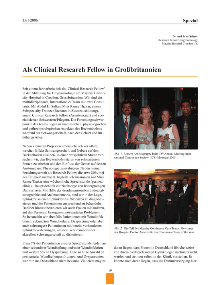 Spezial 15/1/2006 Dr med Inka Scheer Research Fellow Urogynaecology Mayday Hospital Croydon UK Als Clinical Research Fellow in Großbritannien Seit einem Jahr arbeite ich als ‚Clinical Research Fellow’ in der Abteilung für Urogynäkologie am Mayday University Hospital in Croydon, Grossbritannien. Wir sind ein multidisziplinäres, internationales Team mit zwei Consultants: Mr. Abdul H. Sultan, Miss Ranee Thakar, einem Subspecialty Trainee (Facharzt in Zusatzausbildung), einem Clinical Research Fellow (Assistenzarzt) und spezialisierten Schwestern/Pflegern. Die Forschungsschwerpunkte des Teams liegen in anatomischen, physiologischen und pathophysiologischen Aspekten des Beckenbodens während der Schwangerschaft, nach der Geburt und im höheren Alter. Neben kleineren Projekten untersuche ich vor allem, welchen Effekt Schwangerschaft und Geburt auf den Beckenboden ausüben. In einer prospektiven Studie versuchen wir, den Beckenbodenstatus von schwangeren Frauen zu erheben und den Einfluss der Geburt auf dessen Anatomie und Physiologie zu evaluieren. Neben meiner Forschungsarbeit als Research Fellow, die etwa 80% meiner Tätigkeit ausmacht, begleite ich zusammen mit Miss Ranee Thakar eine wöchentliche Sprechstunde (perineal clinic) – hauptsächlich zur Nachsorge von höhergradigen Dammrissen. Mit Hilfe der dreidimensionalen Endoanalsonographie und Analmanometrie, sind wir in der Lage, Sphinkterläsionen/Sphinkterinsuffizienzen zu diagnostizieren und die Patientinnen ensprechend zu behandeln. Darüber hinaus therapieren wir auch Frauen mit anderen, auf das Perineum bezogenen, postpartalen Problemen. So behandeln wir ebenfalls Patientinnen mit Wundinfektionen, sekundärer Wundheilung, Dyspareunie oder aber auch schwangere Patientinnen mit bereits vorhandenen Sphinkterverletzungen, um den Geburtsmodus der aktuellen Schwangerschaft zu diskutieren. Abb. 1. Unsere Arbeitsgruppe beim 35th Annual Meeting International Continence Society (ICS) Montreal 2005 Abb. 2. Ein Teil des Mayday Continence Care Teams, Gewinner des Hospital Doctor Awards für das Continence Team of the Year. Etwa 5% der Patientinnen unserer Sprechstunde leiden an einer sekundärer Wundheilung und/oder Wundinfektion und weitere 5% an Dyspareunie. Eine so hohe Anzahl an postpartaler Wundheilungsstörungen, und Dyspareunien war mir aus Deutschland nicht bekannt. Vielleicht mag es daran liegen, dass Frauen in Deutschland üblicherweise von ihrem niedergelassenen Gynäkologen nachuntersucht werden und sich nur selten in der Klinik vorstellen. Es könnte auch daran liegen, dass die Dammversorgung hier 19 Spezial 15/1/2006 Abb. 3. Zustand nach DR III mit Stuhlinkontinenz. Befund:Defekt des internen (IAS) und externen (EAS) Analsphinkters. IAS-Defekt von 9–4 Uhr und EAS-Defekt von 12–2 Uhr im Endoanalsono. Abb. 4. Defekt des internen (IAS) und externen (EAS) Sphinkters in 3D-Endoanalsono. hauptsächlich von der behandelnen Hebamme vorgenommen wird und ein Arzt nur bei Komplikationen oder einer Sphinkterverletzung hinzugerufen wird. Vielen englischen Hebammen mangelt es häufig an Erfahrung in der adäquaten Dammversorgung, so dass unser Team jährlich einen speziellen Kurs zur Versorgung von Episiotomien und Dammrissen für Hebammen anbietet und wir Hebammen im Kreissaal monatlich schulen. Die Hebammen haben recht viele andere Patientinnen in unseren insgesamt 12 Kreisssälen zu versorgen. Ist man für den Kreissaal zuständig, bleibt bei 4500 Geburten pro Jahr kaum Zeit zum Durchatmen. Bei den Bedingungen in unserem Kreissaal und dem Arbeitspensum, das hier jeder nach bestem Wissen und Gewissen zu erfüllen hat, kommen mir die Beschwerden von Patientinnen in Deutschland manchmal etwas unangemessen vor. Anscheinend ist es in Grossbritanien schwierig, gut ausgebildete und erfahrene Hebammen zu bekommen. Geburtshilfe läuft hier im Allgemeinen etwas anders ab, so gibt es in unserem Krankenhaus weder Duftkerzen, Bälle, Gebärhocker, Matten, Sprossenwände, noch Musik zur Entspannung. Bei Neonlicht und im Kreissbett – selten in der Badewanne – wird die Kreissende meistens in Rückenlage entbunden, ein enges Verhältnis zur Hebamme, wie wir es aus Deutschland kennen, ist nicht üblich. So waren viele mit dem Infoabend ihrer Klinik nicht einverstanden, weil es keine Diashow mit Beamerprojektion gab, sondern ‚nur’ ein nettes informelles Gespräch mit Chef-/Oberarzt und Hebammen. Manchmal gefällt ihnen einfach das Ambiente in einer Klinik nicht, oder Gründe wie „es war zu wenig Fleischsalat auf dem Frühstücksbuffet“, geben Anlass zur Kritik. Frauen hier können nicht wählen, denn es gibt nur eine Klinik in Croydon, und das NHS (National Health 20 Spezial 15/1/2006 planen können. So wären der Patientin und dem Arzt unangenehme Situationen erspart geblieben. Solche Probleme habe ich im deutschen Gesundheitssystem nicht gekannt. Obwohl ich auch in Deutschland immer versucht habe, so viel wie möglich über andere Menschen und Sitten in Erfahrung zu bringen, ist es kein Vergleich zu den Erfahrungen, die ich im NHS machen kann. Abgesehen von den unvergleichlichen wissenschaftlichen Möglichkeiten und der Unterstützung, die ich hier insbesondere von unserem Team erlebe, ist die Arbeit in Großbritannien eine fachliche und menschliche Bereicherung, die ich jedem jungen Arzt nach einigen Jahren Arbeit im deutschen empfehlen kann. Danach weiß man, was man in Deutschland hat. • Abb. 5. Normalbefund eines intakten internen (IAS=internal anal sphincter, schwarzer Ring) und extern (EAS=external anal sphincter, weisser Ring) Analsphinkters, dargestellt mit Hilfe der Endoanalsonographie (360º rotierende 3D-Ultraschallsonde). System) setzt in erster Linie auf medizinisches Knowhow und technisches Equipment, anstatt auf Ansprüche individueller Patientinnen. Damit wird man als deutscher Assistenzarzt sehr schnell auf den Boden der Tatsachen geholt. Viele Patientinnen in Grossbritannien sehen keinen einzigen Gynäkologen währ