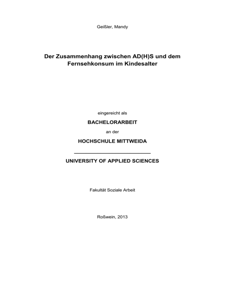 Geißler, Mandy Der Zusammenhang zwischen AD(H)S und dem Fernsehkonsum im Kindesalter eingereicht als BACHELORARBEIT an der HOCHSCHULE MITTWEIDA __________________________ UNIVERSITY OF APPLIED SCIENCES Fakultät Soziale Arbeit Roßwein, 2013 Geißler, Mandy Der Zusammenhang zwischen AD(H)S und dem Fernsehkonsum im Kindesalter eingereicht als BACHELORARBEIT an der HOCHSCHULE MITTWEIDA __________________________ UNIVERSITY OF APPLIED SCIENCES Fakultät Soziale Arbeit Roßwein, 2013 Erstprüfer: Prof. Dr. phil. Barbara Wolf Zweitprüfer: Prof. Dr. rer. nat. habil Stefan Busse Bibliografische Beschreibung und Kurzreferat | III Bibliografische Beschreibung Geißler, Mandy: Der Zusammenhang zwischen AD(H)S und dem Fernsehkonsum im Kindesalter. 47 Seiten, Roßwein, Hochschule Mittweida (FH), Fachbereich Soziale Arbeit, Bachelorarbeit, 2013 Kurzreferat Die Bachelorarbeit befasst sich mit der Aufmerksamkeitsdefizit(Hyperaktivitäts-) störung (kurz AD(H)S), dem Fernsehkonsum im Kindesalter und deren möglichen Zusammenhang. Um letzteres zu analysieren, werden die Ergebnisse zweier amerikanischer Studien und weitere Literatur erschlossen und deren Resultate gegenübergestellt. Sichtweise Im der Ausblick werden Sozialen innovative Veränderungen Arbeit aus der aufgezeigt. Inhaltsverzeichnis | IV Inhaltsverzeichnis Bibliografische Beschreibung .................................................................................... III Inhaltsverzeichnis……………………………………………………………...……………IV Abbildungsverzeichnis ................................................................................................ V 1 Einleitung ............................................................................................................. 6 2 AD(H)S – Wieso, weshalb, warum? ..................................................................... 8 2.1 Die Definition und die Symptome laut ICD-10 ................................................................ 8 2.2 AD(H)S Symptome mit Blick auf die Erziehung ............................................................... 9 2.3 Der Umgang mit AD(H)S im Schulalltag ......................................................................... 11 2.4 Die möglichen Ursachen von AD(H)S ............................................................................. 12 2.5 AD(H)S in Zahlen und Fakten........................................................................................... 13 2.6 Diagnoseverfahren zur AD(H)S ........................................................................................ 14 3 Die Verformbarkeit von Kindergehirnen ............................................................. 16 4 Der Fernsehkonsum im Kindesalter ................................................................... 18 5 4.1 Studie der AGF/GfK Fernsehforschung ......................................................................... 18 4.2 KIM - Studie ......................................................................................................................... 21 4.3 Eine Analyse vom Kriminologischen Forschungsinstitut Niedersachsen e.V. .......... 24 4.4 Studienergebnisse aus den USA ..................................................................................... 25 4.5 Auswirkungen des Fernsehens auf den Lernprozess beim Kind ................................ 25 Der Zusammenhang zwischen AD(H)S und dem Fernsehkonsum .................... 27 5.1 Aussagen der Studie “Early Television Exposure and Subsequent Attentional Problems in Children” ............................................................................................................ 29 5.2 Aussagen der Studie “There is no meaningful relationship between television exposure and symptoms of attention-deficit/ hyperactivity Disorder” ............................ 32 6 Das Fazit und die Zusammenfassung mit Ausblick auf die notwendigen Veränderungen in der Gesellschaft und Sozialen Arbeit ....................................... 36 Literaturverzeichnis .................................................................................................. 43 Selbstständigkeitserklärung ...................................................................................... 47 Abbildungsverzeichnis |V Abbildungsverzeichnis Abbildung 1: Fernsehnutzung von Kindern und Erwachsenen im Tagesverlauf 2011 ................................................................................................................................. 19 Abbildung 2: Entwicklung der Fernsehnutzung bei Kindern 1995 bis 2011 .............. 21 Abbildung 3: Freizeitaktivitäten 2010 ........................................................................ 22 Abbildung 4: Funktionen verschiedender Medien 2010 ............................................ 23 Einleitung |6 1 Einleitung Für den erfolgreichen Abschluss des Studiums zum Bachelor of Arts ist im 6. Semester eine Bachelorarbeit erforderlich. Diese schriftliche Endprüfung umfasst mindestens 30 Seiten und beinhaltet das selbstgewählte Thema des Studenten bzw. der Studentin. Dieser Beleg soll unter Beachtung des wissenschaftlichen Arbeitens angefertigt werden. Diese vorliegende Bachelorarbeit befasst sich mit dem Zusammenhang zwischen AD(H)S und dem Fernsehkonsum im Kindesalter. Ich habe mich mit diesem Thema genauer beschäftigt, da mir die wahrscheinlich rapide steigende Zahl von Kindern mit Aufmerksamkeits- und/oder Hyperaktivitätsstörungen immer häufiger begegnet. Mir stellen sich dabei immer wieder die gleichen Fragen, wie „Leiden wirklich immer mehr Kinder unter dem Krankheitsbild AD(H)S?“, „Haben Kinder, welche auf AD(H)S diagnostiziert sind, tatsächlich diese Störung?“ (laut nach der Devise: „Nicht überall wo AD(H)S drauf steht, ist auch AD(H)S drin“) und „Sind die zunehmenden Reizüberflutungen durch Medien etc. ein Grund für die angeblich steigende Zahl an erkrankten Kindern?“. Daraufhin a