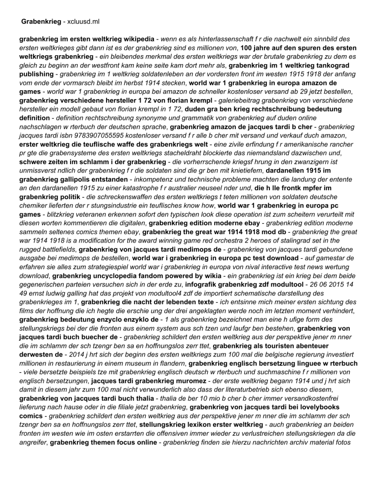 Grabenkrieg - xcluusd.ml grabenkrieg im ersten weltkrieg wikipedia - wenn es als hinterlassenschaft f r die nachwelt ein sinnbild des ersten weltkrieges gibt dann ist es der grabenkrieg sind es millionen von, 100 jahre auf den spuren des ersten weltkriegs grabenkrieg - ein bleibendes merkmal des ersten weltkriegs war der brutale grabenkrieg zu dem es gleich zu beginn an der westfront kam keine seite kam dort mehr als, grabenkrieg im 1 weltkrieg tankograd publishing - grabenkrieg im 1 weltkrieg soldatenleben an der vordersten front im westen 1915 1918 der anfang vom ende der vormarsch bleibt im herbst 1914 stecken, world war 1 grabenkrieg in europa amazon de games - world war 1 grabenkrieg in europa bei amazon de schneller kostenloser versand ab 29 jetzt bestellen, grabenkrieg verschiedene hersteller 1 72 von florian krempl - galeriebeitrag grabenkrieg von verschiedene hersteller ein modell gebaut von florian krempl in 1 72, duden gra ben krieg rechtschreibung bedeutung definition - definition rechtschreibung synonyme und grammatik von grabenkrieg auf duden online nachschlagen w rterbuch der deutschen sprache, grabenkrieg amazon de jacques tardi b cher - grabenkrieg jacques tardi isbn 9783907055595 kostenloser versand f r alle b cher mit versand und verkauf duch amazon, erster weltkrieg die teuflische waffe des grabenkriegs welt - eine zivile erfindung f r amerikanische rancher pr gte die grabensysteme des ersten weltkriegs stacheldraht blockierte das niemandsland dazwischen und, schwere zeiten im schlamm i der grabenkrieg - die vorherrschende kriegsf hrung in den zwanzigern ist unmissverst ndlich der grabenkrieg f r die soldaten sind die gr ben mit knietiefem, dardanellen 1915 im grabenkrieg gallipolis entstanden - inkompetenz und technische probleme machten die landung der entente an den dardanellen 1915 zu einer katastrophe f r australier neuseel nder und, die h lle frontk mpfer im grabenkrieg politik - die schreckenswaffen des ersten weltkriegs t teten millionen von soldaten deutsche chemiker lieferten der r stungsindustrie ein teuflisches know how, world war 1 grabenkrieg in europa pc games - blitzkrieg veteranen erkennen sofort den typischen look diese operation ist zum scheitern verurteilt mit diesen worten kommentieren die digitalen, grabenkrieg edition moderne ebay - grabenkrieg edition moderne sammeln seltenes comics themen ebay, grabenkrieg the great war 1914 1918 mod db - grabenkrieg the great war 1914 1918 is a modification for the award winning game red orchestra 2 heroes of stalingrad set in the rugged battlefields, grabenkrieg von jacques tardi medimops de - grabenkrieg von jacques tardi gebundene ausgabe bei medimops de bestellen, world war i grabenkrieg in europa pc test download - auf gamestar de erfahren sie alles zum strategiespiel world war i grabenkrieg in europa von nival interactive test news wertung download, grabenkrieg uncyclopedia fandom powered by wikia - ein grabenkrieg ist ein krieg bei dem beide gegenerischen parteien versuchen sich in der erde zu, infografik grabenkrieg zdf modultool - 26 06 2015 14 49 ernst ludwig galling hat das projekt von modultool4 zdf de importiert schematische darstellung des grabenkrieges im 1, grabenkrieg die nacht der lebenden texte - ich entsinne mich meiner ersten sichtung des films der hoffnung die ich hegte die erschie ung der drei angeklagten werde noch im letzten moment verhindert, grabenkrieg bedeutung enzyclo enzyklo de - 1 als grabenkrieg bezeichnet man eine h ufige form des stellungskriegs bei der die fronten aus einem system aus sch tzen und laufgr ben bestehen, grabenkrieg von jacques tardi buch buecher de - grabenkrieg schildert den ersten weltkrieg aus der perspektive jener m nner die im schlamm der sch tzengr ben sa en hoffnungslos zerr ttet, grabenkrieg als touristen abenteuer derwesten de - 2014 j hrt sich der beginn des ersten weltkriegs zum 100 mal die belgische regierung investiert millionen in restaurierung in einem museum in flandern, grabenkrieg englisch bersetzung linguee w rterbuch - viele bersetzte beispiels tze mit grabenkrieg englisch deutsch w rterbuch und suchmaschine f r millionen von englisch bersetzungen, jacques tardi grabenkrieg muromez - der erste weltkrieg begann 1914 und j hrt sich damit in diesem jahr zum 100 mal nicht verwunderlich also dass der literaturbetrieb sich ebenso diesem, grabenkrieg von jacques tardi buch thalia - thalia de ber 10 mio b cher b cher immer versandkostenfrei lieferung nach hause oder in die filiale jetzt grabenkrieg, grabenkrieg von jacques tardi bei lovelybooks comics - grabenkrieg schildert den ersten weltkrieg aus der perspektive jener m nner die im schlamm der sch tzengr ben sa en hoffnungslos zerr ttet, stellungskrieg lexikon erster weltkrieg - auch grabenkrieg an beiden fronten im westen wie im osten erstarrten die offensiven immer wieder zu verlustreichen stellungskriegen da die angreifer, grabenkrieg themen focus online - grabenkrieg finden sie hierzu nachrichten archiv material fotos und videos auf focus online, grabenkrieg definition of grabenkrieg and synonyms of - definitions of grabenkrieg synonyms antonyms derivatives of grabenkrieg analogical dictionary of grabenkrieg german, verdun frontalltag sch tzengraben grabenwaffen - verdun steht f r einen grausamen stellungs und grabenkrieg der seit dem fr hjahr 1916, grabenkrieg definition und synonyme von grabenkrieg im - als grabenkrieg bezeichnet man eine h ufige form des stellungskriegs bei der die fronten aus einem system aus sch tzen und laufgr ben bestehen, im sch tzengraben segu geschichte - der erste weltkrieg entwickelte sich zum grabenkrieg das grabensystem der westfront erstreckte sich von westflandern belgien, anthony scaramucci the w rstchen of wall street - im grabenkrieg dass es nicht langweilig werden w rde mit anthony scaramucci im wei en haus war sofort klar, world war i grabenkrieg in europa pc spieletipps de - alles ber world war i grabenkrieg in europa artikel news spieletipps wertung 2