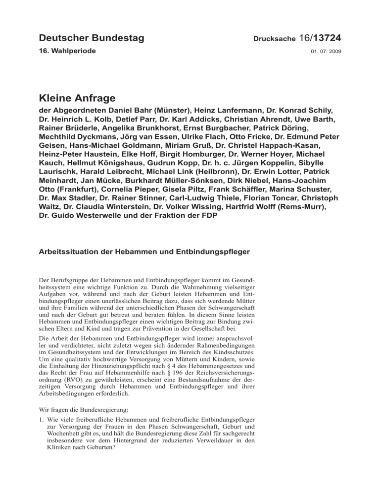 Deutscher Bundestag Drucksache 16. Wahlperiode 16/13724 01. 07. 2009 Kleine Anfrage der Abgeordneten Daniel Bahr (Münster), Heinz Lanfermann, Dr. Konrad Schily, Dr. Heinrich L. Kolb, Detlef Parr, Dr. Karl Addicks, Christian Ahrendt, Uwe Barth, Rainer Brüderle, Angelika Brunkhorst, Ernst Burgbacher, Patrick Döring, Mechthild Dyckmans, Jörg van Essen, Ulrike Flach, Otto Fricke, Dr. Edmund Peter Geisen, Hans-Michael Goldmann, Miriam Gruß, Dr. Christel Happach-Kasan, Heinz-Peter Haustein, Elke Hoff, Birgit Homburger, Dr. Werner Hoyer, Michael Kauch, Hellmut Königshaus, Gudrun Kopp, Dr. h. c. Jürgen Koppelin, Sibylle Laurischk, Harald Leibrecht, Michael Link (Heilbronn), Dr. Erwin Lotter, Patrick Meinhardt, Jan Mücke, Burkhardt Müller-Sönksen, Dirk Niebel, Hans-Joachim Otto (Frankfurt), Cornelia Pieper, Gisela Piltz, Frank Schäffler, Marina Schuster, Dr. Max Stadler, Dr. Rainer Stinner, Carl-Ludwig Thiele, Florian Toncar, Christoph Waitz, Dr. Claudia Winterstein, Dr. Volker Wissing, Hartfrid Wolff (Rems-Murr), Dr. Guido Westerwelle und der Fraktion der FDP Arbeitssituation der Hebammen und Entbindungspfleger Der Berufsgruppe der Hebammen und Entbindungspfleger kommt im Gesundheitssystem eine wichtige Funktion zu. Durch die Wahrnehmung vielseitiger Aufgaben vor, während und nach der Geburt leisten Hebammen und Entbindungspfleger einen unerlässlichen Beitrag dazu, dass sich werdende Mütter und ihre Familien während der unterschiedlichen Phasen der Schwangerschaft und nach der Geburt gut betreut und beraten fühlen. In diesem Sinne leisten Hebammen und Entbindungspfleger einen wichtigen Beitrag zur Bindung zwischen Eltern und Kind und tragen zur Prävention in der Gesellschaft bei. Die Arbeit der Hebammen und Entbindungspfleger wird immer anspruchsvoller und verdichteter, nicht zuletzt wegen sich ändernder Rahmenbedingungen im Gesundheitssystem und der Entwicklungen im Bereich des Kindsschutzes. Um eine qualitativ hochwertige Versorgung von Müttern und Kindern, sowie die Einhaltung der Hinzuziehungspflicht nach § 4 des Hebammengesetzes und das Recht der Frau auf Hebammenhilfe nach § 196 der Reichsversicherungsordnung (RVO) zu gewährleisten, erscheint eine Bestandsaufnahme der derzeitigen Versorgung durch Hebammen und Entbindungspfleger und ihrer Arbeitsbedingungen erforderlich. Wir fragen die Bundesregierung: 1. Wie viele freiberufliche Hebammen und freiberufliche Entbindungspfleger zur Versorgung der Frauen in den Phasen Schwangerschaft, Geburt und Wochenbett gibt es, und hält die Bundesregierung diese Zahl für sachgerecht insbesondere vor dem Hintergrund der reduzierten Verweildauer in den Kliniken nach Geburten? Drucksache 16/13724 –2– Deutscher Bundestag – 16. Wahlperiode 2. Wie viele Frauen nehmen in welchem Umfang Hebammenhilfe in Anspruch, und wie ist die Inanspruchnahme nach der Geburt? 3. Gibt es Unterschiede in der Verfügbarkeit zwischen ländlichen Gebieten und Ballungsräumen? 4. Gibt es Unterschiede im Hinblick auf verschiedene Bevölkerungsgruppen (z. B. Migrantinnen) oder auf soziale Brennpunkte? 5. Gibt es regionale Unterschiede in der Altersstruktur der Hebammen und Entbindungspfleger? 6. Sieht die Bundesregierung die Notwendigkeit, auf die Kommunen einzuwirken, um für eine ausreichende Anzahl von freiberuflichen Hebammen und Entbindungspflegern zu sorgen, und wenn ja, wie will sie dieses erreichen? 7. Wie beurteilt die Bundesregierung die Verdienstsituation freiberuflicher Hebammen und Entbindungspfleger und ihre Auswirkung auf die Arbeitsgestaltung? 8. Sieht die Bundesregierung einen Einfluss des Anstiegs der Berufshaftpflichtversicherung freiberuflich tätiger Hebammen und Entbindungspfleger mit Geburtshilfe auf das Angebot für Beleggeburten und außerklinische Geburten? 9. Ist die Bundesregierung der Auffassung, dass die freie Wahl des Geburtsortes für alle Frauen sichergestellt werden muss? 10. Verfügt die Bundesregierung über verlässliche Zahlen über das tatsächliche Angebot an Hebammenhilfen, bei denen berücksichtigt ist, dass ca. 70 Prozent der angestellten Hebammen bzw. angestellten Entbindungspfleger gleichzeitig eine freiberufliche Tätigkeit ausüben und ca. 75 Prozent der freiberuflichen Hebammen bzw. freiberuflichen Entbindungspfleger ihre Tätigkeit in Teilzeit ausüben, und wenn nein, welche Möglichkeiten zu einer besseren Ermittlung sieht sie? 11. Wie hoch ist der Durchschnittsverdienst einer freiberuflichen Hebamme bzw. eines freiberuflichen Entbindungspflegers im Jahr? 12. Wie hoch ist der Anteil der Hebammen und Entbindungspfleger, die weniger als 400 Euro monatlich verdienen? 13. Wie hoch ist der Anteil der Hebammen und Entbindungspfleger, die zusätzlich staatliche Transferleistungen in Anspruch nehmen? 14. Wie beurteilt die Bundesregierung die Vergütung der Hebammen und Entbindungspfleger im Hinblick auf die Attraktivität dieses Berufes? 15. Wie begründet die Bundesregierung, dass nach § 2 des Sechsten Buches Sozialgesetzbuch (SGB VI) Hebammen und Entbindungspfleger auch dann rentenversicherungspflichtig bleiben, wenn sie Ausnahmebedingungen, die für andere selbstständige Berufsgruppen gelten, erfüllen, wie z. B. die Beschäftigung von Arbeitnehmern? 16. Ist die Bundesregierung bereit, diese Benachteiligung gegenüber anderen freien Berufen zu beseitigen? 17. Plant die Bundesregierung Änderungen im Hinblick auf die Ausbildung der Hebammen und Entbindungspfleger mit dem Ziel, sie besser auf die Freiberuflichkeit vorzubereiten? 18. Wie will die Bundesregierung sicherstellen, dass bei der Einführung von Mindestmengen für die Versorgung von Frühgeborenen in Perinatalzentren eine Transportbegleitung durch Hebammen und Entbindungspfleger stattfinden kann und Eltern in der Nähe ihrer Kinder sein können? Deutscher Bundestag – 16. Wahlperiode –3– 19. Sieht die Bundesregierung die Gefahr, dass durch die Einführung von solchen Mindestmengen ein Anreiz gegeben ist, die Anzahl Frühgeborener zu „erhöhen“? 