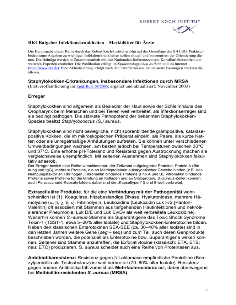 RKI-Ratgeber Infektionskrankheiten – Merkblätter für Ärzte Die Herausgabe dieser Reihe durch das Robert Koch-Institut erfolgt auf der Grundlage des § 4 IfSG. Praktisch bedeutsame Angaben zu wichtigen Infektionskrankheiten sollen aktuell und konzentriert der Orientierung dienen. Die Beiträge werden in Zusammenarbeit mit den Nationalen Referenzzentren, Konsiliarlaboratorien und weiteren Experten erarbeitet. Die Publikation erfolgt im Epidemiologischen Bulletin und im Internet (http://www.rki.de). Eine Aktualisierung erfolgt nach den Erfordernissen, aktualisierte Fassungen ersetzen die älteren. Staphylokokken-Erkrankungen, insbesondere Infektionen durch MRSA (Erstveröffentlichung im Epid. Bull. 08/2000; ergänzt und aktualisiert: November 2003) Erreger Staphylokokken sind allgemein als Besiedler der Haut sowie der Schleimhäute des Oropharynx beim Menschen und bei Tieren weit verbreitet, als Infektionserreger sind sie bedingt pathogen. Die stärkste Pathopotenz der bekannten StaphylokokkenSpezies besitzt Staphylococcus (S.) aureus. Staphylokokken sind nicht bewegliche, nicht sporenbildende grampositive, katalasepositive Kokken, die im mikroskopischen Präparat einzeln, als Paare, als kurze Ketten oder als unregelmäßige Anhäufungen auftreten. Sie können unter verschiedenen Umweltbedingungen wachsen, am besten jedoch bei Temperaturen zwischen 30°C und 37°C. Eine erhöhte pH-Toleranz und Resistenz gegen Austrocknung machen sie vergleichsweise unempfindlich. Mit seltenen Ausnahmen sind Staphylokokken fakultativ anaerob. Der Erreger besitzt eine Reihe verschiedener, der Zellwand aufgelagerter Proteine: Protein A (Bindung von IgG), mehrere Proteine, die an Matrixproteinen eukaryontischer Gewebe binden (z.B. Verklumpungsfaktor an Fibrinogen, Fibronektin bindende Proteine (Fnb A und B), Vitronektin bindende Proteine sowie Proteine für die Bindung an Kollagen und an Sialoprotein. S.-aureus-Zellen können auch Polysaccharid-Kapseln bilden, dabei sind die „Kapseltypen“ 5 und 8 weit verbreitet. Extrazelluläre Produkte, für die eine Verbindung mit der Pathogenität wahrscheinlich ist (1): Koagulase, hitzebeständige DNase, Hyaluronidase, mehrere Hämolysine (a, b, c, d, e), Fibrinolysin, Leukozidine (Leukozidin Luk F/S [PantonValentin] oft assoziiert mit Stämmen aus tiefgehenden Hautinfektionen und nekrotisierender Pneumonie; Luk D/E und Luk Ev/Dv als weit verbreitete Leukozidine). Weiterhin können S.-aureus-Stämme als Superantigene das Toxic Shock Syndrome Toxin-1 (TSST-1; etwa 5–20% aller Isolate) und Staphylokokken-Enterotoxine bilden. Neben den klassischen Enterotoxinen SEA-SEE (ca. 30–40% aller Isolate) sind in den letzten Jahren weitere Gene (seg – seq) und zum Teil auch deren Genprodukte beschrieben worden, die potenziell als Enterotoxine bzw. Superantigene wirken können. Seltener sind Stämme anzutreffen, die Exfoliativtoxine (klassisch: ETA, ETB; neu: ETC) produzieren. S. aureus scheidet auch eine Reihe von Proteinasen aus. Anbibiotikaresistenz: Resistenz gegen b-Laktamase-empfindliche Penicilline (Benzylpenicillin als Testsubstanz) ist weit verbreitet (70–80% aller Isolate). Resistenz gegen andere Antibiotika tritt zumeist als Mehrfachresistenz auf, dabei überwiegend bei Methicillin-resistenten S. aureus (MRSA). 1 Testsubstanz ist Oxacillin, die Methicillinresistenz beruht auf Bildung des zusätzlichen Penicillinbindeproteins PBP2a mit nur geringer Affinität für b-Laktamantibiotika, deshalb besteht Kreuzresistenz gegen alle Vertreter der Substanzgruppe. Das Resistenzverhalten der MRSA-Stämme (aber auch Oxacillin-resistenter Stämme anderer Staphylokokken-Spezies, z.B. von S. epidermidis) wird durch die MethicillinResistenzdeterminante (mec), bestehend u.a. aus dem mecA-Gen und regulatorischen Elementen (mecI, mecR1), bedingt. Diese zusätzliche chromosomale DNA (bis zu ca. 30–50 kb) fehlt in Methicillin-sensiblen Stämmen. Sie wird heute als ein mobiles genetisches Element angesehen, die sog. „Staphylococcus cassette chromosome mec (SCCmec)“, von der derzeit vier Haupttypen bekannt sind. Der Anteil von MRSA an S. aureus aus Infektionen in Krankenhäusern stieg von 1998 bis 2001 von ~15 auf ~20% (2). Etwa 25,4% aller S. aureus und dabei 72% aller MRSA aus Mitteleuropa sind resistent gegen Erythromycin, 56% resistent gegen Clindamycin. Aufgrund des Resistenzmechanismus sind Erythromycin-resistente S. aureus immer auch als potenziell resistent gegen Clindamycin und gegen Telithromycin einzuschätzen (dann sind diese Präparate keine therapeutischen Alternativen). Gentamicinresistenz tritt bei 11,2% aller S. aureus insgesamt und 24% aller MRSA auf; es besteht potenziell Kreuzresistenz gegen Amikazin und Netilmicin. Bei MRSA aus Deutschland liegen die Häufigkeiten der Resistenzen gegen Rifampicin bei 1,9%, gegen Fusidinsäure-Natrium bei 2,4%, gegen Trimethoprim/Sulfonamid bei 3,6% und Quinupristin/Dalfopristin bei 0,05%, gegen Mupirocin bei 1,7. Resistenz gegen Linezolid wurde bei 19.048 in den vergangenen 5 Jahren untersuchten MRSA nicht gefunden, aber für einzelne Isolate aus den USA und Großbritannien berichtet. Glykopeptid intermediär-empfindliche S. aureus (GISA) sind nach wie vor selten; Vancomycinresistenz wurde bisher nur in zwei Fällen aus den USA bekannt (vanA-Gen von Enterokokken). Bestimmte MRSA-Stämme, die durch molekulare Typisierung gut definiert werden können, haben eine besondere Fähigkeit, sich epidemisch auszubreiten. Diese Eigenschaft der Ausbreitungsfähigkeit, die als „epidemische Virulenz“ bezeichnet wird, charakterisiert eine komplexes Verhalten von S.-aureus-Stämmen, die von Faktoren der Stämme selbst (Widerstandsfähigkeit, Ausstattung mit Pathogenitätsfaktoren; sog. „intrinsische Virulenz“) und Faktoren ihrer Umwelt (hygienische und antibakterielle Maßnahmen) bestimmt werden. Das Maß der Ausbreitungsfähigkeit entscheidet mit darüber, ob Einzelerkrankungen oder Epidemien auftreten. Die rasche asymptomatisc