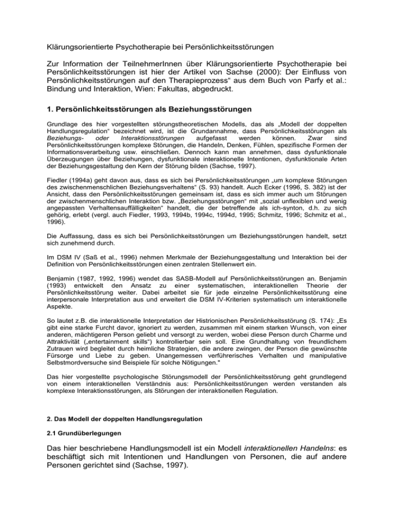 Klärungsorientierte Psychotherapie bei Persönlichkeitsstörungen Zur Information der TeilnehmerInnen über Klärungsorientierte Psychotherapie bei Persönlichkeitsstörungen ist hier der Artikel von Sachse (2000): Der Einfluss von Persönlichkeitsstörungen auf den Therapieprozess“ aus dem Buch von Parfy et al.: Bindung und Interaktion, Wien: Fakultas, abgedruckt. 1. Persönlichkeitsstörungen als Beziehungsstörungen Grundlage des hier vorgestellten störungstheoretischen Modells, das als „Modell der doppelten Handlungsregulation“ bezeichnet wird, ist die Grundannahme, dass Persönlichkeitsstörungen als Beziehungsoder Interaktionsstörungen aufgefasst werden können. Zwar sind Persönlichkeitsstörungen komplexe Störungen, die Handeln, Denken, Fühlen, spezifische Formen der Informationsverarbeitung usw. einschließen. Dennoch kann man annehmen, dass dysfunktionale Überzeugungen über Beziehungen, dysfunktionale interaktionelle Intentionen, dysfunktionale Arten der Beziehungsgestaltung den Kern der Störung bilden (Sachse, 1997). Fiedler (1994a) geht davon aus, dass es sich bei Persönlichkeitsstörungen „um komplexe Störungen des zwischenmenschlichen Beziehungsverhaltens“ (S. 93) handelt. Auch Ecker (1996, S. 382) ist der Ansicht, dass den Persönlichkeitsstörungen gemeinsam ist, dass es sich immer auch um Störungen der zwischenmenschlichen Interaktion bzw. „Beziehungsstörungen“ mit „sozial unflexiblen und wenig angepassten Verhaltensauffälligkeiten“ handelt, die der betreffende als ich-synton, d.h. zu sich gehörig, erlebt (vergl. auch Fiedler, 1993, 1994b, 1994c, 1994d, 1995; Schmitz, 1996; Schmitz et al., 1996). Die Auffassung, dass es sich bei Persönlichkeitsstörungen um Beziehungsstörungen handelt, setzt sich zunehmend durch. Im DSM IV (Saß et al., 1996) nehmen Merkmale der Beziehungsgestaltung und Interaktion bei der Definition von Persönlichkeitsstörungen einen zentralen Stellenwert ein. Benjamin (1987, 1992, 1996) wendet das SASB-Modell auf Persönlichkeitsstörungen an. Benjamin (1993) entwickelt den Ansatz zu einer systematischen, interaktionellen Theorie der Persönlichkeitsstörung weiter. Dabei arbeitet sie für jede einzelne Persönlichkeitsstörung eine interpersonale Interpretation aus und erweitert die DSM IV-Kriterien systematisch um interaktionelle Aspekte. So lautet z.B. die interaktionelle Interpretation der Histrionischen Persönlichkeitsstörung (S. 174): „Es gibt eine starke Furcht davor, ignoriert zu werden, zusammen mit einem starken Wunsch, von einer anderen, mächtigeren Person geliebt und versorgt zu werden, wobei diese Person durch Charme und Attraktivität („entertainment skills“) kontrollierbar sein soll. Eine Grundhaltung von freundlichem Zutrauen wird begleitet durch heimliche Strategien, die andere zwingen, der Person die gewünschte Fürsorge und Liebe zu geben. Unangemessen verführerisches Verhalten und manipulative Selbstmordversuche sind Beispiele für solche Nötigungen." Das hier vorgestellte psychologische Störungsmodell der Persönlichkeitsstörung geht grundlegend von einem interaktionellen Verständnis aus: Persönlichkeitsstörungen werden verstanden als komplexe Interaktionsstörungen, als Störungen der interaktionellen Regulation. 2. Das Modell der doppelten Handlungsregulation 2.1 Grundüberlegungen Das hier beschriebene Handlungsmodell ist ein Modell interaktionellen Handelns: es beschäftigt sich mit Intentionen und Handlungen von Personen, die auf andere Personen gerichtet sind (Sachse, 1997). Es beschäftigt sich mit Motiven, die durch interaktionelles Handeln befriedigt werden können, für deren Befriedigung demnach Beziehungen zu anderen Personen erforderlich sind. Es beschäftigt sich im interaktionellen Intentionen (also mit Intentionen, Handlungsabsichten, die auf andere Personen gerichtet sind) und mit interaktionellen Handlungen (also Handlungen, die auf andere Personen abzielen); Handlungen, mit denen die Person etwas für eine andere Person tut oder mit denen sie erreichen will, dass eine andere Person etwas für sie tut. Das Modell beschreibt dabei zwei unterschiedliche Ebenen von Interaktionen: eine Ebene, die als „Motivebene“ und eine, die als „Spielebene“ bezeichnet werden soll. Diese beiden Ebenen enthalten unterschiedliche interaktionelle Ziele, interaktionelle Strategien und interaktionelle Handlungen. Die „Motivebene“ beschreibt die „normale“ oder „authentische“ Handlungsregulation: Hier weist die Person interaktionelle Ziele auf, die sie in für einen Partner transparente Handlungen umsetzt, welche dann zur Realisierung der Ziele mehr oder weniger effektiv sind. Dabei sind der Person übergeordnete Motive (z.B. wichtig sein) meist selbst nicht repräsentiert; interaktionelle Ziele („Was will ich von einer Person?“, z.B. "Ich will ernst genommen werden.") sind der Person jedoch meist repräsentiert oder gut zugänglich. Umgesetzt werden diese Zeile dann in Handlungen, aus denen ein Interaktionspartner dann die Ziele wieder erschließen kann (z.B. "Bitte hör mir mal zu."). Die „Spielebene“ dagegen enthält interaktionelle Ziele, die mit Hilfe von Handlungen verfolgt werden, die intransparent sind: Der Interaktionspartner kann nur schwer erkennen, worum es der Person geht; er wird zu Handlungen veranlasst, die seinen interaktionellen Motiven nicht entsprechen, kann sich jedoch dagegen nicht in angemessener Form abgrenzen. Will die Person z.B. Aufmerksamkeit, sagt sie: "Mir geht es so schlecht." (und nicht in transparenter Weise: "Ich möchte, dass Du darauf achtest, wie es mir geht."): Der Partner wird zum Handeln gezwungen (wenn er nicht als "herzlos" gelten will), kann aber nur schwer rekonstruieren, worum es dem Partner "eigentlich" geht. Das Modell enthält außerdem eine „Ebene der Annahmen“: Diese soll verdeutlichen, dass interaktionelles Handeln einer Person von Grundannahmen gesteuert wird, die die Person über sich selbst oder ihre Wi