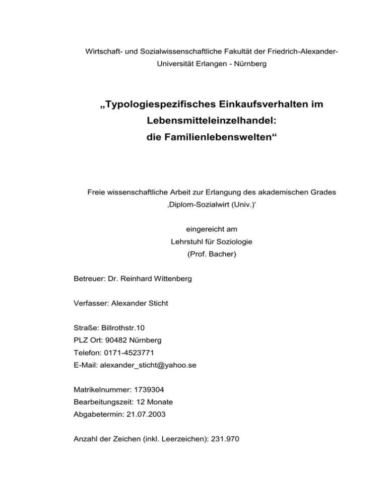 Wirtschaft- und Sozialwissenschaftliche Fakultät der Friedrich-AlexanderUniversität Erlangen - Nürnberg „Typologiespezifisches Einkaufsverhalten im Lebensmitteleinzelhandel: die Familienlebenswelten“ Freie wissenschaftliche Arbeit zur Erlangung des akademischen Grades ‚Diplom-Sozialwirt (Univ.)‘ eingereicht am Lehrstuhl für Soziologie (Prof. Bacher) Betreuer: Dr. Reinhard Wittenberg Verfasser: Alexander Sticht Straße: Billrothstr.10 PLZ Ort: 90482 Nürnberg Telefon: 0171-4523771 E-Mail: [email protected] Matrikelnummer: 1739304 Bearbeitungszeit: 12 Monate Abgabetermin: 21.07.2003 Anzahl der Zeichen (inkl. Leerzeichen): 231.970 0 Abstract In dieser Abhandlung werden anhand des Datensatzes des GfK- Haushaltspanels 6 Nutzen (Preis, Standortnähe, Sortimentsauswahl, Premiumsortimentsauswahl, Konkurrenzeinfluss 5min und Konkurrenzeinfluss 10min) von 13 Einzelhandelsketten operationalisiert. Die Wirkung dieser Nutzen wird anhand einer sich anschließenden Regressionsanalyse dieser Nutzen auf das wertmäßige Einkaufsverhalten von 11 Ausprägungen einer Marktsegmentierungstypologie überprüft. Auch wird anhand der 6 Nutzen aus Sichtweise dieser Typologieausprägungen ein Ranking in bezug auf die Einkaufsstätten erstellt. Dem schließt sich noch eine multinomiale logistische Regression an, anhand derer festgestellt wird, welche Einzelhandelsketten signifikant von welchen Typologieausprägungen besucht werden. Als Ergebnis lässt sich konstatieren, dass die 6 Nutzen nur einen verhältnismäßig kleinen Erklärungsbeitrag für die wertmäßigen Einkäufe der Typologieausprägungen liefern. Aus der multinomialen logistischen Regression resultiert, dass die Einzelhandelsketten von der Mehrzahl der Typologieausprägungen signifikant aufgesucht werden, mit Ausnahme der in den neuen Bundesländern gelegenen Filialen von Extra, Marktkauf und Norma. Aus dem Ranking geht die Discounterkette Plus als Sieger auf dem ersten Platz hervor, dicht gefolgt von Aldi auf dem zweiten und Penny auf dem dritten Platz. Die restlichen Einkaufsstätten sind sehr verschieden platziert, wobei die SB-Warenhäuser tendenziell im unteren Drittel und die Discounter überwiegend im oberen Dritten anzutreffen sind. 2 I. Inhaltsverzeichnis 0 Abstract 2 I. Inhaltsverzeichnis 3 II. Abbildungs- und Tabellenverzeichnis 5 III. Abkürzungsverzeichnis 7 1. Einleitung 8 2. Problemstellung 9 3. Bisherige Lösungsversuche 11 4. Theorie 13 4.1. Stände 14 4.2. Klassen 14 4.3. Soziale Schichten 15 4.4. Lebenslagen und soziale Lagen 18 4.5. Familienlebenszyklus 19 4.6. Milieu und Lebensstile 22 4.7. Die DINKs als Ausprägung einer Life-Style-Typologie 24 4.8. Der Nutzen im Rational Choice Modell 25 4.9. Marktsegmentierung im Handel 28 4.9.1. Zum Begriff der Marktsegmentierung 28 4.9.2. Überblick über die Kriterien der Marktsegmentierung 29 4.10. Der Lebensweltbegriff 33 5. Die Typologie: die Familienlebenswelten 34 6. Methodik 39 6.1. Explikation der Basisdaten: das Haushaltspanel der GfK Panel Services in Nürnberg 40 6.1.1. Zeitliche Abgrenzung 40 6.1.2. Auswahl der Warengruppen 41 6.2. Die Operationalisierung der Nutzen und die Nutzenstandardisierungsformel 43 6.3. Die Prüfung auf Verletzung der Modellannahmen der Regressionsfunktion 49 6.4. Schrittweise lineare Regression 50 3 6.5. Multinomiale logistische Regression 7. Ergebnisse 51 52 7.1. Ranking der Nutzen 52 7.2. Deskriptive Statistik 56 7.3. Lineare Regression und multinomiale logistische Regression 57 7.3.1. Schrittweise lineare Regression auf die untransformierten wertmäßigen Einkäufe der Familienlebenswelten 58 7.3.2. Schrittweise Lineare Regression auf die transformierten wertmäßigen Einkäufe der Familienlebenswelten 59 7.3.3. Multinomiale logistische Regression der Familienlebenswelten auf die Betriebstypen 60 8. Resumé / Zusammenfassung 62 9. Literaturverzeichnis 70 10. Anhang 77 10.1. Die Einkaufsstätten in der Analyse 77 10.2. Top 30 Lebensmitteleinzelhandel BRD 2002 80 10.3. Charakterisierung des Lebensmitteleinzelhandels 81 10.3.1. Aldi 81 10.3.2. AVA (Marktkauf) 82 10.3.3. Metro AG (Real, Extra) 83 10.3.4. Norma / Roth 84 10.3.5. Rewe AG (Minimal, HL, Penny) 85 10.3.6. Schwarz-Gruppe (Kaufland, Lidl) 86 10.3.7. Spar-Gruppe 87 10.3.8. Tengelmann (Plus) 89 10.3.9. Wal-Mart 90 10.4. SPSS-Ausgaben 95 10.4.1. Deskriptive Statistik 95 10.4.2. Univariate Analyseverfahren 97 10.4.3. Multivariate Analyseverfahren 98 10.4.2.1. Schrittweise lineare Regression 98 10.4.2.2. Multinomiale logistische Regression 119 4 II. Abbildungs - und Tabellenverzeichnis Abbildung 1 Der „Bio-Käufer“ im Familien-Lebenszyklus 12 Tabelle 1 sechs Lebensphasen nach Lansing und Morgan 19 Tabelle 2 Haushaltsgruppen nach G&I 21 Tabelle 3 Life-Style-Typologie 25 Tabelle 4 Überblick über ausgewählte Kriterien der Marktsegmentierung 30 Tabelle 5 Unterscheidungsmerkmale von sozialen Schichten 32 Abbildung 2 Selbstbilder der Familien-Lebenswelten 35 Abbildung 3 Standard-Abfolgen von Familienlebenswelten 37 Tabelle 6 Kurzcharakterisierung der Familienlebenswelten 38 Tabelle 7 Warengruppenanteile und Warenanteile 41 Abbildung 4 Anteile der Warengruppen in der Gesamtheit des Haushaltspanel im August des Jahres 2002 Abbildung 5 42 Anteile der ausgewählten Warengruppen des Haushaltspanel im August des Jahres 2002 Abbildung 6 42 Eine Systematik der Betriebstypen im Lebensmitteleinzelhandel 46 Tabelle 8 Die Phasen des Kaufentscheidungsprozesses 47 Tabelle 9 Nutzenwerte der einzelnen Einkaufsstätten auf Basis der untransformierten Gewichtung Tabelle 10 Nutzenwerte der einzelnen Einkaufsstätten auf Basis der transformierten Gewichtung Abbildung 7 55 Prozentuale Verteilung der Familienlebenswelten in der Stichprobe im Jahre 2002 Abbildung 8 54 56 Schrittweise lineare Regressionen der Nutzen auf die untransformierten wertmäßigen Einkäufe der Familienlebenswelten Abbildung 9 58 Schrittweise lineare Regressionen der Nutzen auf die transformierten wertmäßigen Einkäufe der Familienlebe