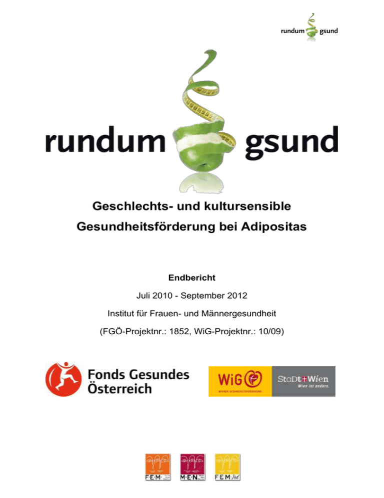 Geschlechts- und kultursensible Gesundheitsförderung bei Adipositas Endbericht Juli 2010 - September 2012 Institut für Frauen- und Männergesundheit (FGÖ-Projektnr.: 1852, WiG-Projektnr.: 10/09) Impressum EigentümerIn/ VerlegerIn/ HerausgeberIn Verein: Institut für Frauen- und Männergesundheit Bastiengasse 36-38 1180 Wien Tel: 01 47615 5771 e-mail: [email protected] Redaktion Mag. Paul Brugger, Mag.a Gabriele Gundacker, Mag.a Eva Trettler, Mag.a Hilde Wolf, Mag.a Christa Straßmayr (Kapitel 5.1.- Exkurs Externe Evaluation) Fotos FEM, FEM Süd & MEN – Archiv Erstellungsdatum Jänner 2013 2 INHALTSVERZEICHNIS 1. KURZZUSAMMENFASSUNG ........................................................................................................ 4 2. GEPLANTE MAßNAHMEN IM PROJEKT („SOLL“-DARSTELLUNG) ........................................ 9 3. 2.1. ZIELE UND MAßNAHMEN IM DETAIL ............................................................................................ 10 2.2. VISION DES PROJEKTS ............................................................................................................. 14 2.3. ZIELGRUPPEN DES PROJEKTS................................................................................................... 14 UMGESETZTE MAßNAHMEN IM PROJEKT („IST“).................................................................. 16 3.1. PROJEKTSPEZIFISCHE KONTAKTE – ART UND AUSMAß .................................................................... 16 3.2 AKTIVITÄTEN VERHALTENSEBENE ............................................................................................. 18 3.2.1 3.2.1.1 Gruppenprogramm für Frauen ....................................................................................... 24 3.2.1.2 Gruppenprogramm für Männer ...................................................................................... 28 3.2.2.3 Gruppenprogramm für Familien .................................................................................... 32 3.3 4. VERNETZUNGSPLATTFORM „Wiener Forum Übergewicht und Adipositas“ ................. 50 3.3.2 VERANSTALTUNGEN UND KOOPERATIONEN ............................................................. 55 3.3.3 HOMEPAGE ...................................................................................................................... 69 3.3.4 METHODENSAMMLUNG „rundum gsund“ ....................................................................... 73 PROJEKTSTRUKTUR UND –ZUSAMMENARBEIT .................................................................... 75 Projektteam - Frauen ......................................................................................................... 75 4.1.2 Projektteam - Männer ........................................................................................................ 78 4.1.3 Projektteam – Familie ........................................................................................................ 80 4.2 STEUERUNGSGRUPPE .............................................................................................................. 85 4.3 BERICHTE AUS DEN ARBEITSGRUPPEN ...................................................................................... 86 4.3.1 Methodenhandbuch ........................................................................................................... 87 4.3.2 Öffentlichkeitsarbeit ........................................................................................................... 88 4.3.3 Homepage ......................................................................................................................... 91 4.3.4 Raumsuche........................................................................................................................ 94 4.3.5 Medienarbeit ...................................................................................................................... 95 PROJEKTSITZUNGEN UND BESPRECHUNGEN.............................................................................. 98 ZIELERREICHUNG (SOLL – IST – VERGLEICH) ..................................................................... 100 5.1. 7. PROJEKTSTRUKTUR ................................................................................................................. 75 4.1.1 4.4 6. AKTIVITÄTEN VERHÄLTNISEBENE .................................................................................... 50 3.3.1 4.1. 5. Das Gruppenprogramm für Frauen, Männer und Familien ............................................... 18 EXKURS EXTERNE EVALUATION – EXECUTIVE SUMMARY .......................................................... 105 LERNERFAHRUNGEN ............................................................................................................... 114 6.1. ERFOLGSFAKTOREN UND HÜRDEN .......................................................................................... 121 6.2. EMPFEHLUNGEN .................................................................................................................... 125 NACHHALTIGKEIT UND VERBREITUNG DER ERGEBNISSE ............................................... 129 1. Kurzzusammenfassung „Rundum gsund“ ist ein Projekt zur geschlechts- und kultursensiblen Gesundheitsförderung bei Adipositas, das verhaltens- und verhältnisorientierte Ansätze und Maßnahmen umfasste. Das Projekt, das vom Institut für Frauen- und Männergesundheit mit den Standorten FEM, FEM Süd und MEN umgesetzt wird, wurde finanziert vom Fonds Gesundes Österreich, der Wiener Gesundheitsförderung sowie durch Selbstbehalte der TeilnehmerInnen. Eine externe Evaluierung erfolgte durch das Forschungsbüro queraum. kultur- und sozialforschung, die Projektlaufzeit ist von 1.7. 2010 bis 30.9. 2012. Für von Adipositas betroffene Frauen, Männer und Kinder – mit und ohne Migrationshintergrund - wurden zielgruppenspezifische Gruppenprogramme entwickelt und umgesetzt. Parallel dazu verfolgte das Projekt eine Re