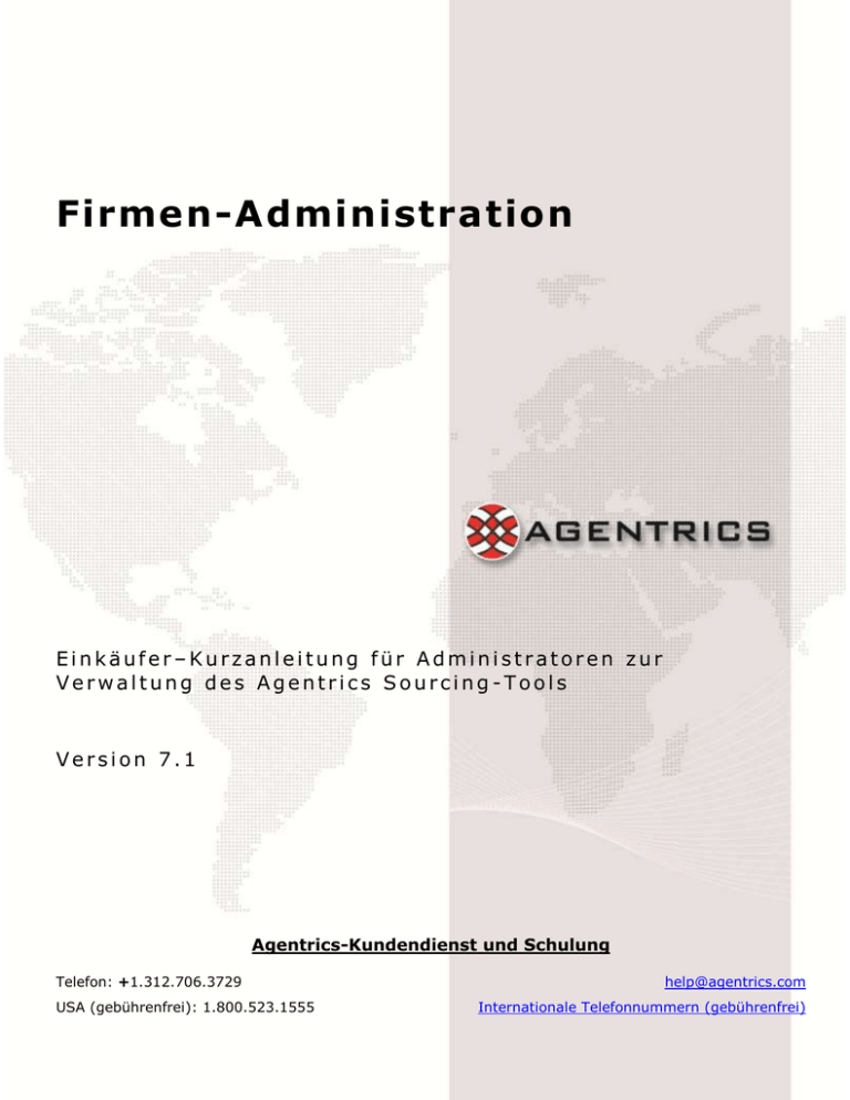 Firmen-Administration Einkäufer–Kurzanleitung für Administratoren zur Verwaltung des Agentrics Sourcing-Tools Version 7.1 Agentrics-Kundendienst und Schulung Telefon: +1.312.706.3729 [email protected] USA (gebührenfrei): 1.800.523.1555 Internationale Telefonnummern (gebührenfrei) Copyright © 2008 Agentrics, LLC. Alle Rechte vorbehalten. Teile Copyright 2002 - 2008 Emptoris Software, Inc. INHALT FIRMEN-ADMINISTRATION..........................................................................................................................2 FIRMENPROFILE BEARBEITEN ................................................................................................................................. 2 E-MAIL-BENACHRICHTIGUNGEN VERWALTEN .............................................................................................................. 2 Für MyGenSource ...................................................................................................................................... 2 Für Sourcing ............................................................................................................................................. 3 VOREINSTELLUNGEN DES UNTERNEHMENS DEFINIEREN ................................................................................................... 5 UNTERNEHMENSWÄHRUNGEN VERWALTEN .................................................................................................................. 5 Währungen für das Unternehmen festlegen .................................................................................................. 5 Währungstabellen verwalten ....................................................................................................................... 6 Wechselkurse festlegen .............................................................................................................................. 7 EINE GESCHÄFTSEINHEIT ERSTELLEN ....................................................................................................................... 7 EINE GESCHÄFTSEINHEIT LÖSCHEN ......................................................................................................................... 8 KATEGORIEVERWALTUNG ............................................................................................................................9 KATEGORIEEIGENSCHAFTEN ERSTELLEN .................................................................................................................. 11 UNTERKATEGORIEN ERSTELLEN ............................................................................................................................ 12 ARTIKEL ERSTELLEN......................................................................................................................................... 12 KATEGORIEN, UNTERKATEGORIEN ODER ARTIKEL UMBENENNEN ODER ABSETZEN .................................................................... 12 BENUTZER MIT EINKÄUFERROLLE HINZUFÜGEN UND VERWALTEN ...........................................................13 EINEN BENUTZER MIT EINKÄUFERROLLE HINZUFÜGEN ................................................................................................... 13 DAS PROFIL EINES BENUTZERS BEARBEITEN (UND KENNWÖRTER ZURÜCKSETZEN) .................................................................. 13 EINEN BENUTZER DEAKTIVIEREN .......................................................................................................................... 14 KENNWORT EINES ANDEREN BENUTZERS ZURÜCKSETZEN ............................................................................................... 15 BENUTZER EINER KATEGORIE ZUWEISEN ................................................................................................................. 15 BENUTZERROLLEN UND BERECHTIGUNGEN ............................................................................................................... 16 ANWENDUNGSEINSTELLUNGEN EINES ANDEREN BENUTZERS ÄNDERN .................................................................................. 17 VERKNÜPFUNG ZWISCHEN BENUTZER UND KATEGORIE HERSTELLEN ODER AUFHEBEN ............................................................... 17 VERKNÜPFUNG ZWISCHEN BENUTZER UND GESCHÄFTSEINHEIT HERSTELLEN ODER AUFHEBEN ...................................................... 18 LIEFERANTEN EINLADEN UND VERWALTEN ...............................................................................................19 BESTÄTIGEN DER E-MAIL EINES ANBIETERS ............................................................................................................. 19 NEUE LIEFERANTEN EINLADEN ............................................................................................................................. 19 VORHANDENE LIEFERANTEN EINLADEN .................................................................................................................... 20 ANBIETERPROFILE VERWALTEN............................................................................................................................. 20 ZUSÄTZLICHE INFORMATIONSFELDER ERSTELLEN ....................................................................................22 ZUSÄTZLICHE RFX-INFORMATIONSFELDER ERSTELLEN .................................................................................................. 22 TABELLENANSICHT ANPASSEN ............................................................................................................................. 22 FELDER FÜR LOKALE ANBIETERPROFILE ERSTELLEN ...................................................................................................... 23 PROJEKTFELDER ERSTELLEN ................................................................................................................................ 24 Firmen-Administration – Kurzanleitung für Einkäufer © 2009 Agentrics, LLC. Alle Rechte vorbehalten. Seite 1 Firmen-Admini