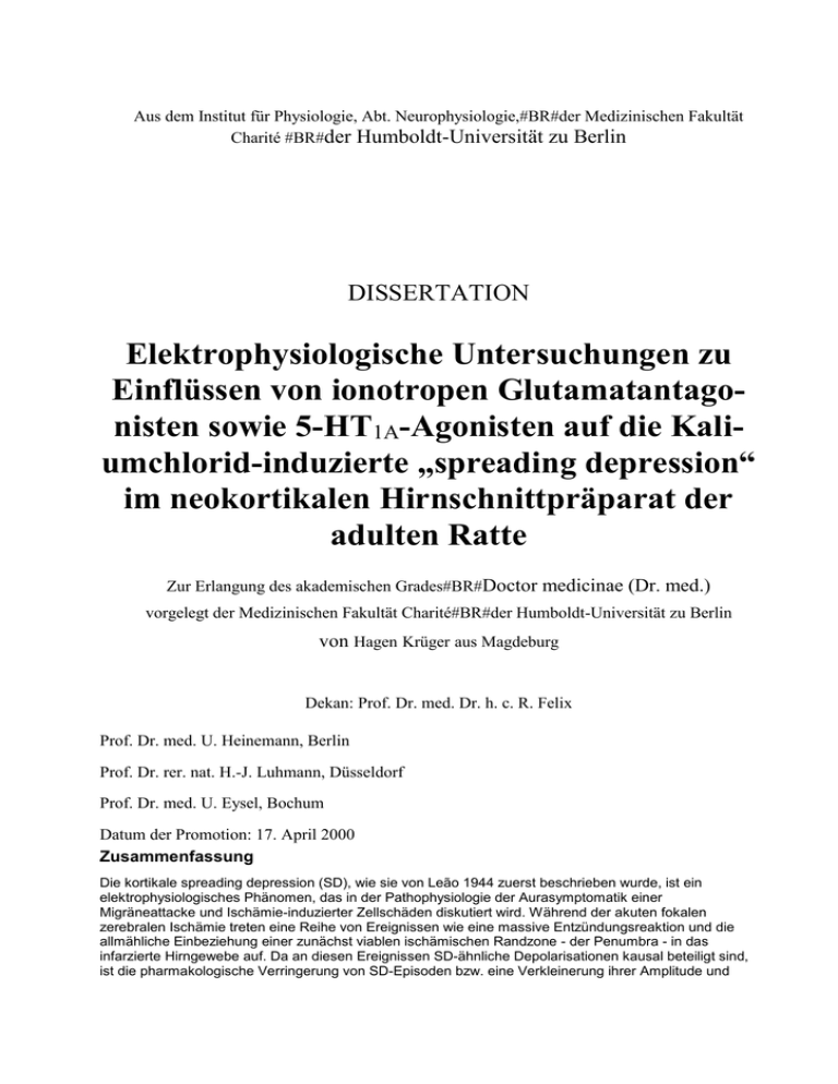 Aus dem Institut für Physiologie, Abt. Neurophysiologie,#BR#der Medizinischen Fakultät Charité #BR#der Humboldt-Universität zu Berlin DISSERTATION Elektrophysiologische Untersuchungen zu Einflüssen von ionotropen Glutamatantagonisten sowie 5-HT1A-Agonisten auf die Kaliumchlorid-induzierte „spreading depression“ im neokortikalen Hirnschnittpräparat der adulten Ratte Zur Erlangung des akademischen Grades#BR#Doctor medicinae (Dr. med.) vorgelegt der Medizinischen Fakultät Charité#BR#der Humboldt-Universität zu Berlin von Hagen Krüger aus Magdeburg Dekan: Prof. Dr. med. Dr. h. c. R. Felix Prof. Dr. med. U. Heinemann, Berlin Prof. Dr. rer. nat. H.-J. Luhmann, Düsseldorf Prof. Dr. med. U. Eysel, Bochum Datum der Promotion: 17. April 2000 Zusammenfassung Die kortikale spreading depression (SD), wie sie von Leão 1944 zuerst beschrieben wurde, ist ein elektrophysiologisches Phänomen, das in der Pathophysiologie der Aurasymptomatik einer Migräneattacke und Ischämie-induzierter Zellschäden diskutiert wird. Während der akuten fokalen zerebralen Ischämie treten eine Reihe von Ereignissen wie eine massive Entzündungsreaktion und die allmähliche Einbeziehung einer zunächst viablen ischämischen Randzone - der Penumbra - in das infarzierte Hirngewebe auf. Da an diesen Ereignissen SD-ähnliche Depolarisationen kausal beteiligt sind, ist die pharmakologische Verringerung von SD-Episoden bzw. eine Verkleinerung ihrer Amplitude und Dauer unter in vitro als auch tierexperimentellen in vivo Bedingungen eine mögliche neuroprotektive Strategie. In der vorliegenden Arbeit wurde ein in vitro Modell beschrieben, das am Hirnschnittpräparat des Neokortex der adulten Ratte eine reproduzierbare Auslösung von SD-Wellen unter normoxischen Bedingungen gestattet. Anhand von charakteristischen elektrophysiologischen Parametern einer SD wie Amplitude, Dauer und Ausbreitungsgeschwindigkeit wurden die gute Übereinstimmungen dieses in vitro Modells mit in vivo Modellen gezeigt. Obwohl SD Wellen am nicht-ischämischen Kortex keine morphologischen Schäden verursachen, zeigte sich in den hier vorgestellten Experimenten eine funktionelle Unterdrückung der GABAergen hemmenden Mechanismen des Neokortex nach repetitiven SDs auch bei ausreichender Energie- und Sauerstoffversorgung. Die hier diskutierten Ergebnisse demonstrierten, daß unter in vitro Bedingungen der AMPA-Glutamatrezeptor für die Auslösung und Ausbreitung einer SD eine untergeordnete Rolle spielt. Demgegenüber erwies sich die NMDARezeptoraktivierung als herausragend für eine SD, da die Blockade dieses Rezeptors mit dem nichtkompetitiven Antagonisten Ketamin die SD-Amplitude und SD-Dauer signifikant verringerte. Die Anwendung der selektiven 5-HT1A-Agonisten 8-OH-DPAT und BAY x 3702 erwies sich als eine neue Möglichkeit, die Zeitdauer einer SD zu verringern. Die aufgezeigte SD-induzierte neuronale Hyperexzitabilität kann unter normoxischen Bedingungen zelluläre Dysfunktionen verursachen und auch an einer Generierung der Aura eines Migräneanfalls beteiligt sein. Unter hypoxisch-ischämischen Bedingungen könnte eine SD-induzierte Dysfunktion GABAerger Kontrollmechanismen die Ausweitung ischämischer Zellschäden bewirken. Die Hoffnungen auf eine effektive Schlaganfalltherapie haben sich mit den bisherigen NMDAAntagonisten trotz ihrer hier bestätigten guten in vitro Wirksamkeit aufgrund der Interferenz mit physiologischen Glutamatfunktionen im Kortex nicht erfüllt. Die hier gezeigte konzentrationsabhängige Verkürzung der SD-Dauer durch die Aktivierung des 5-HT1A-Serotoninrezeptors unter in vitro Bedingungen kann bei der bekannten hohen 5-HT1A-Rezeptor-mRNA-dichte an besonders ischämievulnerablen Neuronen einen neuen neuroprotektiven Ansatz auch beim Menschen darstellen. Weitere Untersuchungen müssen zeigen, ob die hier beschriebene enge Verflechtung des serotonergen Systems mit der glutamatergen Neurotransmission eventuell auch zu unerwünschte Wirkungen unter in vivo Bedingungen führt. Spreading depression, Extrazelluläre Messung, GABAerge Hemmung; AMPA-Rezeptorantagonist; NMDA-Rezeptorantagonist; 5-HT1A-Rezeptoragonist; in vitro; Ratte; Migräne; Zerebrale Ischämie Abstract Spreading Depression (SD) induced Neocortical Hyperexcitability and Pharmacology of SD in vitro Repetitive cortical spreading depression (SD) and SD-like events, associated with a massive depolarization of neuronal and glial cells, is thought to play a key role in the induction of neuronal damage in the peri-infarct zone following experimental focal cerebral ischemia. In addition, experimental and clinical data suggest that SD is the underlying mechanism of neurological disturbances during migraine auras as well. However, detailed analyses on the consequences of repetitive SDs on cortical function and involved receptors are lacking. Using an in vitro rat model of SD I investigated in this thesis the electrophysiological properties of repetitive potassium chloride (KCl)-induced SDs, their influence on synaptic neurotransmission and the effects of ionotropic glutamate antagonists and 5-HT1A agonists in neocortical slices obtained from adult rats. Whereas repetitive SDs revealed only non-significant variations in duration, amplitude and integral when elicited at intervals of 30 min, paired-pulse inhibition of extracellularly recorded field potential responses was significantly affected by repetitive SD even under normoxic conditions. Compared to the control recordings, each SD episode caused a significant decrease in the efficacy of intracortical GABAergic inhibition by approximately 10%. Since excitatory synaptic transmission was unaffected, these data indicate that repetitive SDs cause a selective suppression of GABAergic function even in the non-ischemic brain. None of the compounds tested prevented the SD-induced cortical disinhibition. However, the SD-associated negative shift in the extracellular DC potential was reduced by ketamine, a selective N-meth