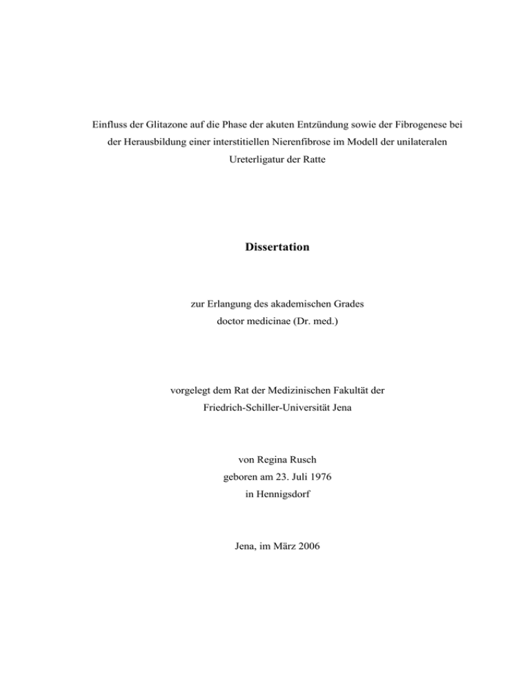 Einfluss der Glitazone auf die Phase der akuten Entzündung sowie der Fibrogenese bei der Herausbildung einer interstitiellen Nierenfibrose im Modell der unilateralen Ureterligatur der Ratte Dissertation zur Erlangung des akademischen Grades doctor medicinae (Dr. med.) vorgelegt dem Rat der Medizinischen Fakultät der Friedrich-Schiller-Universität Jena von Regina Rusch geboren am 23. Juli 1976 in Hennigsdorf Jena, im März 2006 Gutachter: 1. Prof. Dr. med. G. Stein 2. Prof. Dr. med. G. Raabe 3. Prof. Dr. med. habil. R. Fünfstück Tag der öffentlichen Verteidigung: 06. Februar 2007 Inhaltsverzeichnis 1 1.1 Einleitung................................................................................................................. 1 Chronische Niereninsuffizienz ............................................................................. 1 1.1.1 Epidemiologie ........................................................................................... 1 1.1.2 Pathophysiologie ....................................................................................... 2 1.2 Unilaterale Ureterobstruktion als Modell der interstitiellen Fibrose .................... 3 1.3 Der Zellzyklus ....................................................................................................... 4 1.3.1 Typ D-Cyclin ............................................................................................. 6 1.3.2 Typ E-Cyclin ............................................................................................. 7 1.3.3 Typ A-Cyclin ............................................................................................. 7 1.3.4 Typ B-Cyclin ............................................................................................. 8 1.4 Das 27-kilo Dalton Protein p27Kip1 ....................................................................... 8 1.5 Peroxisome proliferator-activated receptor-gamma............................................ 10 1.5.1 PPAR und Nierenerkrankungen .............................................................. 12 1.6 Das Monozyten-Chemoattrahierende Protein-1.................................................. 15 1.7 Ziele der Arbeit ................................................................................................... 18 2 2.1 Material und Methoden........................................................................................ 19 Tierversuch ......................................................................................................... 19 2.1.1 2.2 2.3 Therapie der Versuchstiere...................................................................... 19 Durchführung des Tierversuchs .......................................................................... 20 2.2.2 Messung des Blutdrucks.......................................................................... 21 2.2.3 Messung des Blutzuckers ........................................................................ 21 2.2.4 Bestimmung der Plasma-Renin-Aktivität ............................................... 22 2.2.5 Anfertigen des Zelllysats ......................................................................... 22 2.2.6 Quantitative Proteinbestimmung ............................................................. 22 Western-Blotting ................................................................................................. 23 2.3.1 Chemikalien ............................................................................................ 23 2.3.2 Puffer und Substratlösungen ................................................................... 24 2.3.3 SDS-PAGE .............................................................................................. 25 2.3.4 Proteinblotting ......................................................................................... 26 2.3.5 Immunreaktion ........................................................................................ 27 2.3.6 2.4 Färbung der Proteine ............................................................................... 27 Bestimmung des Hydroxyprolingehaltes ............................................................ 29 2.4.1 Chemikalien ............................................................................................ 29 2.4.2 Pufferlösungen und Standards für die Hydroxyprolinbestimmung ......... 29 2.4.3 Probenvorbereitung von Nierengewebe zur Hydroxyprolinbestimmung mittels HPLC ...................................................................... 30 2.5 2.6 3 2.4.4 Fluoreszenz-HPLC .................................................................................. 31 2.4.5 Bestimmung des Hydroxyprolingehaltes mittels Fluoreszenz-HPLC ..... 33 Polymerase Chain Reaction ................................................................................ 34 2.5.1 Chemikalien ............................................................................................ 35 2.5.2 Ansätze .................................................................................................... 35 2.5.3 RNA-Extraktion aus Gewebe .................................................................. 35 2.5.4 Konstruktion des Kompetitors ................................................................ 36 2.5.5 Primer ...................................................................................................... 36 2.5.6 PCR ......................................................................................................... 37 2.5.7 Quantifizieren der c-DNA-Proben .......................................................... 37 Statistische Auswertung ...................................................................................... 39 Ergebnisse .............................................................................................................. 40 3.1 Systolischer Blutdruck ........................................................................................ 40 3.2 Blutzucker ..................
