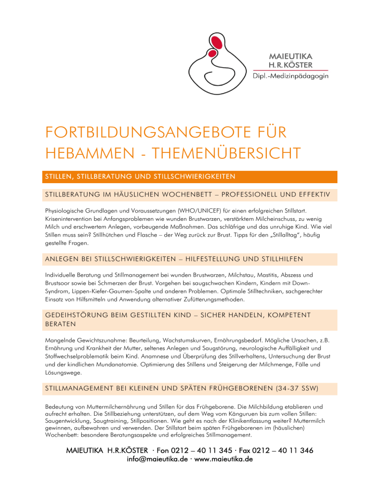 FORTBILDUNGSANGEBOTE FÜR HEBAMMEN - THEMENÜBERSICHT STILLEN, STILLBERATUNG UND STILLSCHWIERIGKEITEN STILLBERATUNG IM HÄUSLICHEN WOCHENBETT – PROFESSIONELL UND EFFEKTIV Physiologische Grundlagen und Voraussetzungen (WHO/UNICEF) für einen erfolgreichen Stillstart. Krisenintervention bei Anfangsproblemen wie wunden Brustwarzen, verstärktem Milcheinschuss, zu wenig Milch und erschwertem Anlegen, vorbeugende Maßnahmen. Das schläfrige und das unruhige Kind. Wie viel Stillen muss sein? Stillhütchen und Flasche – der Weg zurück zur Brust. Tipps für den „Stillalltag“, häufig gestellte Fragen. ANLEGEN BEI STILLSCHWIERIGKEITEN – HILFESTELLUNG UND STILLHILFEN Individuelle Beratung und Stillmanagement bei wunden Brustwarzen, Milchstau, Mastitis, Abszess und Brustsoor sowie bei Schmerzen der Brust. Vorgehen bei saugschwachen Kindern, Kindern mit DownSyndrom, Lippen-Kiefer-Gaumen-Spalte und anderen Problemen. Optimale Stilltechniken, sachgerechter Einsatz von Hilfsmitteln und Anwendung alternativer Zufütterungsmethoden. GEDEIHSTÖRUNG BEIM GESTILLTEN KIND – SICHER HANDELN, KOMPETENT BERATEN Mangelnde Gewichtszunahme: Beurteilung, Wachstumskurven, Ernährungsbedarf. Mögliche Ursachen, z.B. Ernährung und Krankheit der Mutter, seltenes Anlegen und Saugstörung, neurologische Auffälligkeit und Stoffwechselproblematik beim Kind. Anamnese und Überprüfung des Stillverhaltens, Untersuchung der Brust und der kindlichen Mundanatomie. Optimierung des Stillens und Steigerung der Milchmenge, Fälle und Lösungswege. STILLMANAGEMENT BEI KLEINEN UND SPÄTEN FRÜHGEBORENEN (34-37 SSW) Bedeutung von Muttermilchernährung und Stillen für das Frühgeborene. Die Milchbildung etablieren und aufrecht erhalten. Die Stillbeziehung unterstützen, auf dem Weg vom Känguruen bis zum vollen Stillen: Saugentwicklung, Saugtraining, Stillpositionen. Wie geht es nach der Klinikentlassung weiter? Muttermilch gewinnen, aufbewahren und verwenden. Der Stillstart beim späten Frühgeborenen im (häuslichen) Wochenbett: besondere Beratungsaspekte und erfolgreiches Stillmanagement. MAIEUTIKA H.R.KÖSTER ∙ Fon 0212 – 40 11 345 ∙ Fax 0212 – 40 11 346 [email protected] ∙ www.maieutika.de STILLEN UND EMPFÄNGNISVERHÜTUNG Stillen, Familienplanung und mütterliche Gesundheit. Besondere Aspekte der Sexualität in der Stillzeit. Rückkehr der Fruchtbarkeit unter dem Stillen. Geeignete Verhütungsmittel und -methoden während der Stillzeit, Kontraindikationen. Wirksamkeit und Nebenwirkungen der einzelnen Methoden. Natürliche Familienplanung im Übergang zur Fruchtbarkeit. Stillen als Verhütungsmethode - die LactationalAmenorrhea-Method (LAM). Individuelle Beratungsansätze anhand von Fallbeispielen. STILLBERATUNG BEI MÜTTERLICHER ERKRANKUNG Orientierende Stillberatung z.B. bei Diabetes, Hypo- und Hyperthyreose, Epilepsie, Multipler Sklerose, psychischer Erkrankung, Alkohol- und Drogenkonsum. Stillen aufrechterhalten in Krankheitskrisen und bei medizinischen Eingriffen. Anästhesien in der Stillzeit, adäquate Auswahl von Medikamenten. Relative und absolute Indikationen für Muttermilchersatznahrung nach WHO. Allmähliches und plötzliches Abstillen. Spezielle Stillberatung und Hilfsangebote. ERNÄHRUNG IN SCHWANGERSCHAFT UND STILLZEIT, BEIKOST UND ALLERGIEPROPHYLAXE ERNÄHRUNGSBERATUNG – SCHWANGERSCHAFT UND STILLZEIT Grundlagen einer bedarfsgerechten Ernährung während Schwangerschaft und Stillzeit. Evidenz basierte Prophylaxe von Nährstoffmangelsituationen und ernährungsabhängigen Schwangerschafts-komplikationen. Spezielle Beratungsaspekte bei Adipositas, Gestationsdiabetes und das Problem der perinatalen Programmierung. Bedenkliche und unverträgliche Inhaltsstoffe. Alltagstaugliche Ernährungskonzepte zur Förderung von Gesundheit und Wohlbefinden der (werdenden) Mutter und des gestillten Kindes. ERNÄHRUNGSBERATUNG – DAS KIND IM 1. LEBENSJAHR Neue Erkenntnisse zur bedarfsgerechten Ernährung mit Muttermilch bzw. industriell- und selbst hergestellter Säuglingsnahrung. Aktuelle Empfehlungen zur Einführung von Beikost: Zeitpunkte, geeignete Lebensmittel und Produkte, Schadstoffbelastungen, Nahrungsmittelintoleranzen und -unverträglichkeiten, Evidenz basierte Maßnahmen zur Allergieprophylaxe. Kritische Bewertung nationaler Beikostempfehlungen unter dem Aspekt der Stillförderung und vergleichende Betrachtung mit internationalen Empfehlungen. VOLLWERTIG KOCHEN: IN SCHWANGERSCHAFT, STILLZEIT & BABYS 1. JAHR Vollwertküche für Schwangere und Stillende – einfach und schnell zubereitet, gesund und lecker. Selbst hergestellte Mahlzeiten in der B(r)eikostphase – vom ersten Brei bis zum Familientisch. Praktische Umsetzung beim gemeinsamen Kochen und Essen. Tipps für die Gestaltung von Kochkursen und individuellen Anleitungssituationen. Kleine Theorie der qualitätserhaltenden Vorratshaltung und Zubereitung von Lebensmitteln. Vorkenntnisse zu Ernährungsfragen werden vorausgesetzt. MAIEUTIKA H.R.KÖSTER ∙ Fon 0212 – 40 11 345 ∙ Fax 0212 – 40 11 346 [email protected] ∙ www.maieutika.de NEUGEBORENES HYPOGLYKÄMIE BEIM NEUGEBORENEN – PROPHYLAXE UND FRÜHERKENNUNG DURCH DIE HEBAMME Entstehungszusammenhänge einer Hypoglykämie, Risikofaktoren, Symptome, Notfallmanagement. Kinder diabetischer Mütter. Besonderheiten des Stoffwechsels beim Neugeborenen, Ernährungsbedarf in den ersten Lebenstagen. Evidenz basierte Hypoglykämie-Prophylaxe bei der Geburt und im Rahmen der Wochenbettbetreuung, aktuelle Leitlinien NEUGEBORENENIKTERUS – PROPHYLAXE UND BEURTEILUNG BEI DER HÄUSLICHEN WOCHENBETTBETREUUNG Die aktuelle Datenlage zur Hyperbilirubinämie bei Neugeborenen. Auffrischung und Vertiefung von Grundlagenwissen zu den verschiedenen Formen des Neugeborenenikterus. Anamnestische Risikoerfassung, Diagnosestellung, aktuelle Leitlinien. Evidenz basierte Maßnahmen zur günstigen Beeinflussung des Ikterus bzw. zur Vorbeugung einer Hyperbilirubinämie. HYGIENE UND INFEKTIONSPROPHYLAXE HYGIENEMAßN