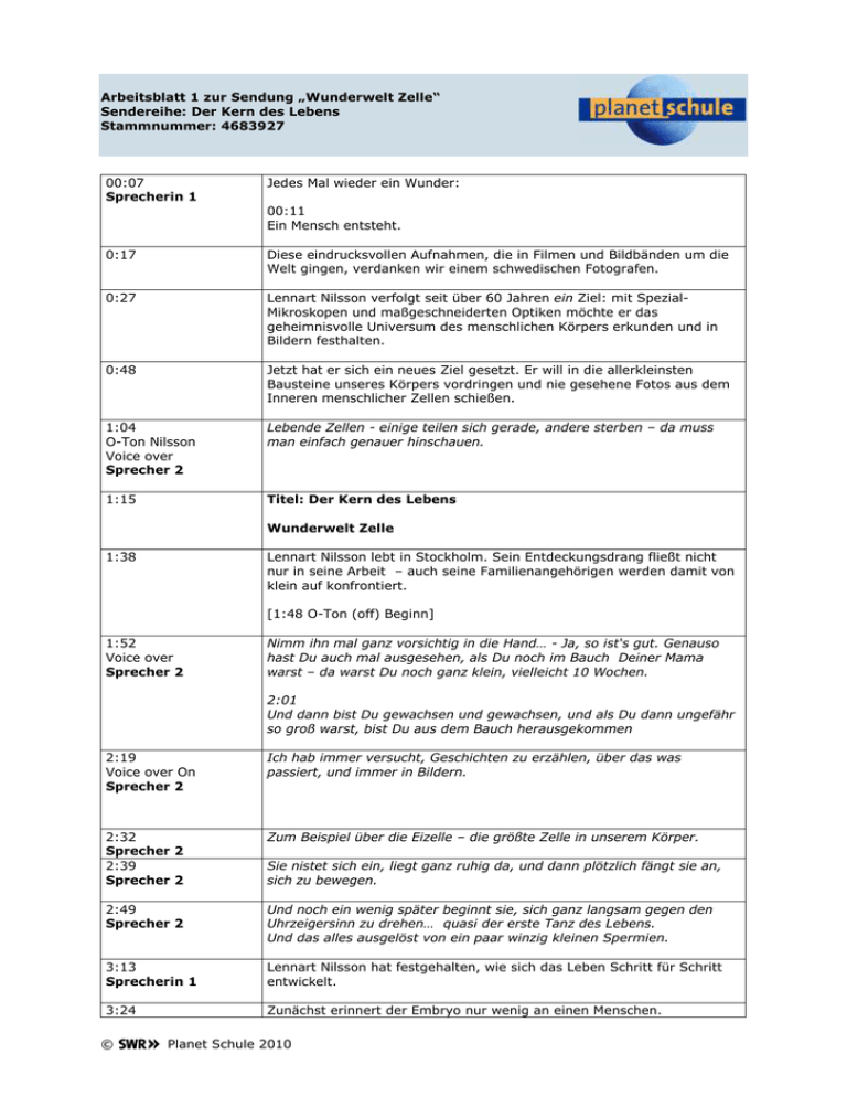 Arbeitsblatt 1 zur Sendung „Wunderwelt Zelle“ Sendereihe: Der Kern des Lebens Stammnummer: 4683927 00:07 Sprecherin 1 Jedes Mal wieder ein Wunder: 00:11 Ein Mensch entsteht. 0:17 Diese eindrucksvollen Aufnahmen, die in Filmen und Bildbänden um die Welt gingen, verdanken wir einem schwedischen Fotografen. 0:27 Lennart Nilsson verfolgt seit über 60 Jahren ein Ziel: mit SpezialMikroskopen und maßgeschneiderten Optiken möchte er das geheimnisvolle Universum des menschlichen Körpers erkunden und in Bildern festhalten. 0:48 Jetzt hat er sich ein neues Ziel gesetzt. Er will in die allerkleinsten Bausteine unseres Körpers vordringen und nie gesehene Fotos aus dem Inneren menschlicher Zellen schießen. 1:04 O-Ton Nilsson Voice over Sprecher 2 Lebende Zellen - einige teilen sich gerade, andere sterben – da muss man einfach genauer hinschauen. 1:15 Titel: Der Kern des Lebens Wunderwelt Zelle 1:38 Lennart Nilsson lebt in Stockholm. Sein Entdeckungsdrang fließt nicht nur in seine Arbeit – auch seine Familienangehörigen werden damit von klein auf konfrontiert. [1:48 O-Ton (off) Beginn] 1:52 Voice over Sprecher 2 Nimm ihn mal ganz vorsichtig in die Hand… - Ja, so ist‘s gut. Genauso hast Du auch mal ausgesehen, als Du noch im Bauch Deiner Mama warst – da warst Du noch ganz klein, vielleicht 10 Wochen. 2:01 Und dann bist Du gewachsen und gewachsen, und als Du dann ungefähr so groß warst, bist Du aus dem Bauch herausgekommen 2:19 Voice over On Sprecher 2 Ich hab immer versucht, Geschichten zu erzählen, über das was passiert, und immer in Bildern. 2:32 Sprecher 2 2:39 Sprecher 2 Zum Beispiel über die Eizelle – die größte Zelle in unserem Körper. 2:49 Sprecher 2 Und noch ein wenig später beginnt sie, sich ganz langsam gegen den Uhrzeigersinn zu drehen… quasi der erste Tanz des Lebens. Und das alles ausgelöst von ein paar winzig kleinen Spermien. 3:13 Sprecherin 1 Lennart Nilsson hat festgehalten, wie sich das Leben Schritt für Schritt entwickelt. 3:24 Zunächst erinnert der Embryo nur wenig an einen Menschen. © Sie nistet sich ein, liegt ganz ruhig da, und dann plötzlich fängt sie an, sich zu bewegen. Planet Schule 2010 Arbeitsblatt 1 zur Sendung „Wunderwelt Zelle“ Sendereihe: Der Kern des Lebens Stammnummer: 4683927 3:30 Dann erscheinen mehr und mehr unserer charakteristischen Züge. Die Arme beginnen zu wachsen, dann die Beine. Hände und Füße entstehen. 3:43 Der Embryo wird zum Fötus, beginnt zu greifen und zu treten – als würde er schon für das Leben draußen üben. 3:54 Dann ist es irgendwann Zeit, hinaus ins richtige Leben zu treten 4:15 Nilssons Enkelin Rebecka ist sechs Jahre alt. 4:22 Voice over Sprecher 2 Wir kommen wunderbar miteinander aus, wir machen viel Unsinn miteinander. Sie bekommt schon eine Menge mit, und ich kann ihr sogar schon kleine Rätsel stellen. 4:43 Sprecherin 1 Dass das ganze Leben irgendwann hier, im Wasser entstanden sein soll, das kann Rebecka allerdings doch nicht so ganz glauben. 4:56 Lennart Nilssons gilt seit über fünf Jahrzehnten als Pionier auf dem Gebiet der Mikrofotografie. Seit jeher nutzt er dafür spezielle Mikroskope, häufig Prototypen, die die Hersteller von ihm testen lassen. 5:11 Er hat ein ganzes Arsenal von Spezialoptiken selbst entwickelt. Oft handelt es sich dabei um medizinische Instrumente, zum Beispiel Endoskope, die normalerweise für Operationen eingesetzt werden. 5:24 Sie ermöglichen völlig neue Blickwinkel auf alltägliche Dinge und Situationen …. 5:32 … und ungewöhnliche Blicke auf den menschlichen Körper. 5:42 Es sind aber vor allem Nilssons faszinierende Einblicke in den menschlichen Körper, die verdeutlichen, wie perfekt das Zusammenspiel seiner Teile funktioniert. 5:54 Für alles das, was der Körper braucht und was ihm wiederfährt, haben sich hochspezialisierte Zellen entwickelt. 6:03 Voice over Nilsson Sprecher 2 Wir haben Hirnzellen, Herzzellen, Lungenzellen – sehr viele verschiedene Zellen für ganz spezifische Aufgaben. 6:13 Sprecherin 1 Die Zellen des Verdauungssystems produzieren Enzyme, die unsere Mahlzeiten in Nährstoffe und Abfall aufspalten. 6:21 Abwehrzellen unseres Immunsystems verschlingen gefährliche Mikroben. 6:28 Hochspezialisierte Sinneszellen ordnen für uns den ständigen Informationsstrom, dem wir ausgesetzt sind. 6:38 Zum Beispiel die Information, die in Form von Lichtwellen in unser Auge dringt. Die Linse erzeugt ein umgekehrtes Bild, das auf eine Schicht hochentwickelter Lichtrezeptor-Zellen projiziert wird. 6:53 Im Innern der Netzhaut verwandeln mikroskopische Generatoren die Lichtreize in elektrische Impulse, die in langen Nervenfasern zum Gehirn geleitet werden © Planet Schule 2010 Arbeitsblatt 1 zur Sendung „Wunderwelt Zelle“ Sendereihe: Der Kern des Lebens Stammnummer: 4683927 7:06 Sternförmige Zellen in unserer Nasenschleimhaut erzeugen Geruchseindrücke. 7:16 Ob das Zwitschern der Vögel, Lärm oder Gespräche – eine wahre Flut von Schallwellen dringt ständig in unsere Ohren. 7:27 Dort treffen sie auf spezielle Rezeptorzellen mit winzigen Haarbüscheln, die im Rhythmus der Schallwellen schwingen. 7:39 Die dadurch entstehenden elektrischen Impulse werden auch hier von Nervenfasern weitergeleitet…. 7:46 …. zum Gehirn, das aus den Informationen sämtlicher Sinneszellen unser Bild von der Welt erzeugt. 7:54 Diese Aufnahmen zeigen das Innere des Gehirns – eine geheimnisvolle Welt voller Windungen und Höhlen. Milliarden von Nervenzellen bilden die Schaltzentrale unseres Körpers und formen uns zu der Person, die wir sind. 8:09 Charakter und Persönlichkeit, all unsere besonderen Fähigkeiten entstehen hier – in einem Netzwerk gestreckter Nervenzellen, das die Wissenschaft noch längst nicht vollständig versteht. 8:28 Mit 86 Jahren hat sich Lennart Nilsson nun noch einmal ein neues Ziel gesetzt. Er möchte noch viel tiefer in die Mikrowelt unseres Körpers eintauchen – bis in seine kleinsten Bausteine, die einzelnen Zellen. Wie funkt