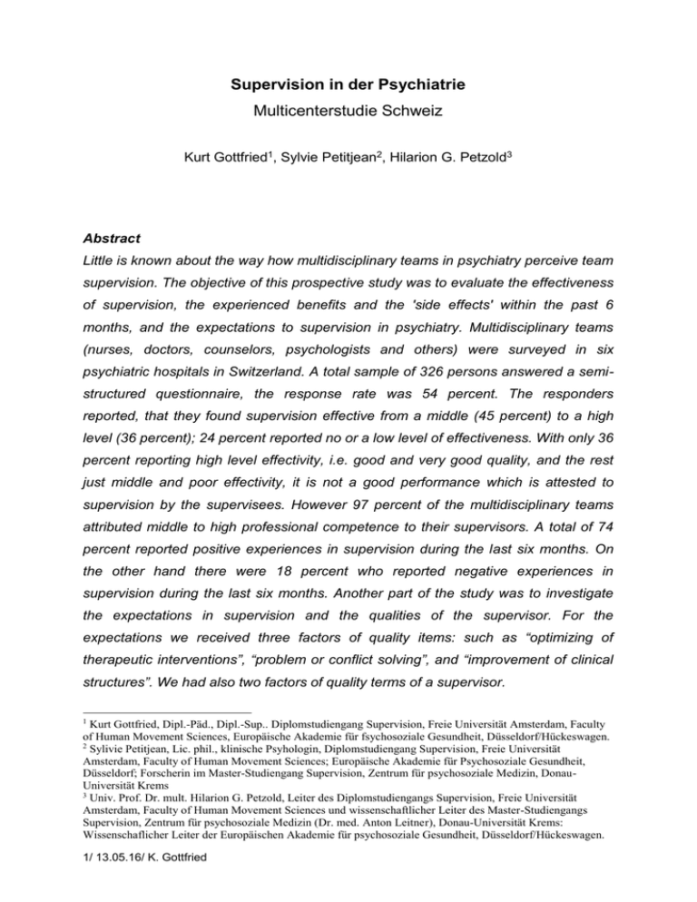 Supervision in der Psychiatrie Multicenterstudie Schweiz Kurt Gottfried1, Sylvie Petitjean2, Hilarion G. Petzold3 Abstract Little is known about the way how multidisciplinary teams in psychiatry perceive team supervision. The objective of this prospective study was to evaluate the effectiveness of supervision, the experienced benefits and the 'side effects' within the past 6 months, and the expectations to supervision in psychiatry. Multidisciplinary teams (nurses, doctors, counselors, psychologists and others) were surveyed in six psychiatric hospitals in Switzerland. A total sample of 326 persons answered a semistructured questionnaire, the response rate was 54 percent. The responders reported, that they found supervision effective from a middle (45 percent) to a high level (36 percent); 24 percent reported no or a low level of effectiveness. With only 36 percent reporting high level effectivity, i.e. good and very good quality, and the rest just middle and poor effectivity, it is not a good performance which is attested to supervision by the supervisees. However 97 percent of the multidisciplinary teams attributed middle to high professional competence to their supervisors. A total of 74 percent reported positive experiences in supervision during the last six months. On the other hand there were 18 percent who reported negative experiences in supervision during the last six months. Another part of the study was to investigate the expectations in supervision and the qualities of the supervisor. For the expectations we received three factors of quality items: such as “optimizing of therapeutic interventions”, “problem or conflict solving”, and “improvement of clinical structures”. We had also two factors of quality terms of a supervisor. 1 Kurt Gottfried, Dipl.-Päd., Dipl.-Sup.. Diplomstudiengang Supervision, Freie Universität Amsterdam, Faculty of Human Movement Sciences, Europäische Akademie für fsychosoziale Gesundheit, Düsseldorf/Hückeswagen. 2 Sylivie Petitjean, Lic. phil., klinische Psyhologin, Diplomstudiengang Supervision, Freie Universität Amsterdam, Faculty of Human Movement Sciences; Europäische Akademie für Psychosoziale Gesundheit, Düsseldorf; Forscherin im Master-Studiengang Supervision, Zentrum für psychosoziale Medizin, DonauUniversität Krems 3 Univ. Prof. Dr. mult. Hilarion G. Petzold, Leiter des Diplomstudiengangs Supervision, Freie Universität Amsterdam, Faculty of Human Movement Sciences und wissenschaftlicher Leiter des Master-Studiengangs Supervision, Zentrum für psychosoziale Medizin (Dr. med. Anton Leitner), Donau-Universität Krems: Wissenschaflicher Leiter der Europäischen Akademie für psychosoziale Gesundheit, Düsseldorf/Hückeswagen. 1/ 13.05.16/ K. Gottfried 1. Einleitung Die vorliegende Studie ist Teil einer Reihe umfangreicherer Projekte des Seniorautors und seiner MitarbeiterInnen, die beabsichtigen, zur forschungsgestützten Qualitätsentwicklung und -sicherung in der Supervision beizutragen (Petzold, Schigl et al. 2003). Da die Forschungslage, was Wirkungen und Nebenwirkungen von Supervision (Petzold, Orth et al. 2003) in den verschiedenen Settings und bei unterschiedlichen Zielgruppen mit verschiedenen Supervisionsansätzen anbetrifft, noch in den Anfängen steht, sind auf unterschiedlichsten Gebieten der Supervision Forschungsanstrengungen notwendig und es ist insbesondere erforderlich, eine Verschränkung von Praxis, Forschung und Lehre voranzutreiben: zum einen durch eine Förderung der Kooperation von Supervisionsforschern und Praktikern von Supervision – letztere müssen eine forschungsfreundliche Kultur entwickeln, wollen sie die Qualität ihres Verfahrens sichern -, zum anderen durch eine Intensivierung der Auseinandersetzung mit Methoden und Ergebnissen der Supervisionsforschung im Rahmen von Supervisionsausbildungen, bei denen dieses Thema in der Regel in den Curricula nicht verankert ist (von den in dieser Hinsicht gänzlich unzureichenden, und empirisch nie untersuchten „Standards“, mit denen die Fach- und Berufsverbände die Ausbildungsqualität sichern wollen, gar nicht zu reden, denn „Forschung“ und Kenntnisse wissenschaftlicher Forschungsergebnisse sind dort nicht verankert). Schließlich ist die Intensivierung der Forschung in der universitären Lehre von Supervision dringend voranzutreiben, um die Studierenden, die fast alle nach Studienabschluß als Supervisoren zu praktizieren beginnen, in Forschungsvorhaben zu involvieren, sie zu schulen und für Forschung zu begeistern, denn nur so werden die „Kompetenzen“, wird das Wissen generiert werden, das in der „Performanz“, dem konkreten Handeln in der Praxis (Petzold, Engemann, Zachert 2003) zum Tragen kommen soll, das den notwendigen empirischen Hintergrund für wirksame Methoden und Zielgruppen, die erforderlichen Kenntnisse Institutionen/Organisationen und über Settings Felder, Klientsysteme, bereitstellt, um eine evidenzbasierte Wirksamkeit von Supervision gewährleisten zu können. Der Output an studentischen Forschungsarbeiten (Dissertationen, Diplom- und Masterthesen) im 2/ 13.05.16/ K. Gottfried europäischen Raum ist bislang sehr gering. Länderübergreifende universitäre Forschungskooperationen sind noch selten. Das wird sich ändern müssen. Die vorliegende Studie über Supervision im Feld der Psychiatrie in der Schweiz, die mit dem gleichen Instrument auch in Deutschland, Österreich und Norwegen durchgeführt werden soll und in der Kooperation von drei Studiengängen der Supervision (Amsterdam, Hückeswagen, Krems) und ihren Studierenden aus mehreren Ländern realisiert wird, ist ein Beispiel für die Bemühungen, die wissenschaftliche Fundierung und die Wissensbasis von Supervision zu verbreitern. 1.1 Supervision in der Psychiatrie Supervision in der Psychiatrie als Instrument der Qualitätssicherung und – erweiterung, zur Verbesserung der Arbeit mit und an den Patienten sowohl wie der Förderung beruflicher Kompetenz der int