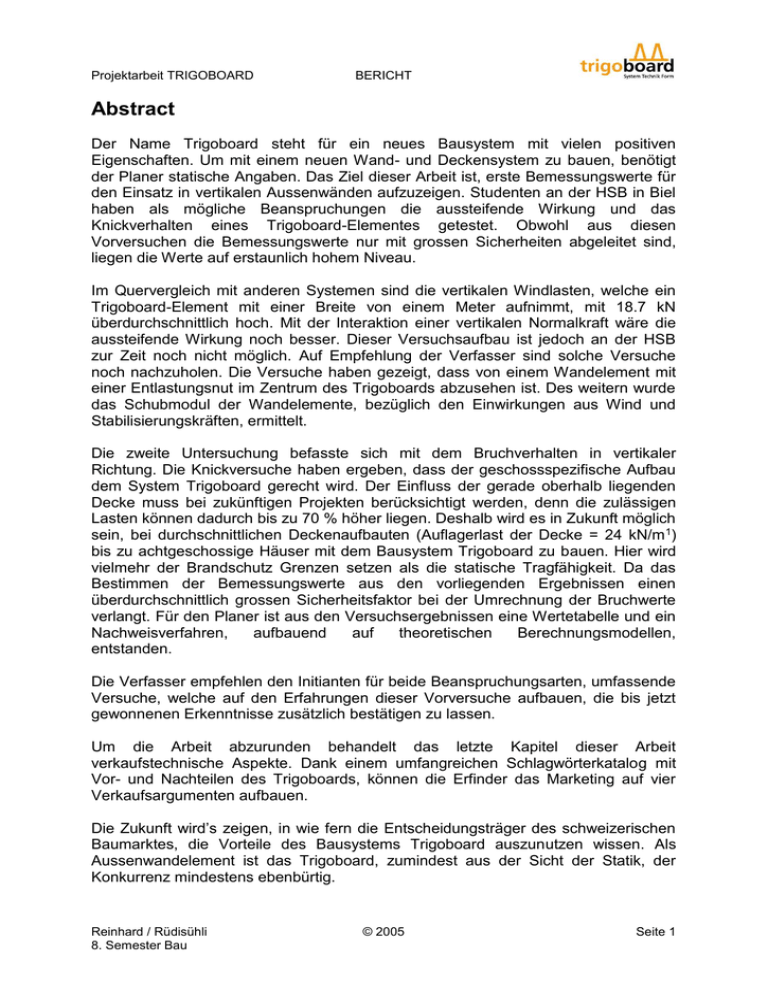 Projektarbeit TRIGOBOARD BERICHT Abstract Der Name Trigoboard steht für ein neues Bausystem mit vielen positiven Eigenschaften. Um mit einem neuen Wand- und Deckensystem zu bauen, benötigt der Planer statische Angaben. Das Ziel dieser Arbeit ist, erste Bemessungswerte für den Einsatz in vertikalen Aussenwänden aufzuzeigen. Studenten an der HSB in Biel haben als mögliche Beanspruchungen die aussteifende Wirkung und das Knickverhalten eines Trigoboard-Elementes getestet. Obwohl aus diesen Vorversuchen die Bemessungswerte nur mit grossen Sicherheiten abgeleitet sind, liegen die Werte auf erstaunlich hohem Niveau. Im Quervergleich mit anderen Systemen sind die vertikalen Windlasten, welche ein Trigoboard-Element mit einer Breite von einem Meter aufnimmt, mit 18.7 kN überdurchschnittlich hoch. Mit der Interaktion einer vertikalen Normalkraft wäre die aussteifende Wirkung noch besser. Dieser Versuchsaufbau ist jedoch an der HSB zur Zeit noch nicht möglich. Auf Empfehlung der Verfasser sind solche Versuche noch nachzuholen. Die Versuche haben gezeigt, dass von einem Wandelement mit einer Entlastungsnut im Zentrum des Trigoboards abzusehen ist. Des weitern wurde das Schubmodul der Wandelemente, bezüglich den Einwirkungen aus Wind und Stabilisierungskräften, ermittelt. Die zweite Untersuchung befasste sich mit dem Bruchverhalten in vertikaler Richtung. Die Knickversuche haben ergeben, dass der geschossspezifische Aufbau dem System Trigoboard gerecht wird. Der Einfluss der gerade oberhalb liegenden Decke muss bei zukünftigen Projekten berücksichtigt werden, denn die zulässigen Lasten können dadurch bis zu 70 % höher liegen. Deshalb wird es in Zukunft möglich sein, bei durchschnittlichen Deckenaufbauten (Auflagerlast der Decke = 24 kN/m 1) bis zu achtgeschossige Häuser mit dem Bausystem Trigoboard zu bauen. Hier wird vielmehr der Brandschutz Grenzen setzen als die statische Tragfähigkeit. Da das Bestimmen der Bemessungswerte aus den vorliegenden Ergebnissen einen überdurchschnittlich grossen Sicherheitsfaktor bei der Umrechnung der Bruchwerte verlangt. Für den Planer ist aus den Versuchsergebnissen eine Wertetabelle und ein Nachweisverfahren, aufbauend auf theoretischen Berechnungsmodellen, entstanden. Die Verfasser empfehlen den Initianten für beide Beanspruchungsarten, umfassende Versuche, welche auf den Erfahrungen dieser Vorversuche aufbauen, die bis jetzt gewonnenen Erkenntnisse zusätzlich bestätigen zu lassen. Um die Arbeit abzurunden behandelt das letzte Kapitel dieser Arbeit verkaufstechnische Aspekte. Dank einem umfangreichen Schlagwörterkatalog mit Vor- und Nachteilen des Trigoboards, können die Erfinder das Marketing auf vier Verkaufsargumenten aufbauen. Die Zukunft wird’s zeigen, in wie fern die Entscheidungsträger des schweizerischen Baumarktes, die Vorteile des Bausystems Trigoboard auszunutzen wissen. Als Aussenwandelement ist das Trigoboard, zumindest aus der Sicht der Statik, der Konkurrenz mindestens ebenbürtig. Reinhard / Rüdisühli 8. Semester Bau © 2005 Seite 1 Projektarbeit TRIGOBOARD BERICHT Vorwort Im 8. Semester zum Ingenieur FH, an der Hochschule für Architektur, Bau und Holz (HSB) in Biel, führen die Studenten im Rahmen des Studiums eine Projektarbeit durch. Diese hat zum Ziel, in Zusammenarbeit mit einem Industriepartner, das theoretische und praktische Wissen anzuwenden und weiter zu entwickeln. Die vorliegende Arbeit befasste sich mit dem Untersuchen und Analysieren der Trigoboard-Elemente auf horizontale Stablitität (Schubfluss der Aussteifung) und Knicken. An dieser Stelle danken wir den Initianten des Trigoboards, Herr Joe Dober und Herr Josef Ehrler, dass wir die Möglichkeit hatten, diese interessante und aufschlussreiche Arbeit durchzuführen. Insbesondere danken wir unseren betreuenden Dozenten, Herr Dr. Andreas Hurst und Herr Dr. Maurice Brunner, welche stets Zeit für die Beantwortung der offenen Fragen hatten. Einen weiteren Dank geht an Herr Peter Makiol, vom Büro Makiol und Wiederkehr. Durch seine hilfreichen Tipps und Anregungen konnten wir einige Verbesserungen anbringen. Als letztes danken wir den Herr Schnüriger und Herr Roder, ohne den beiden Mitarbeiter der HSB hätten die Versuche im Labor nicht durchgeführt werden können. Des weitern bedanken wir uns bei allen Personen, die uns während dieser Zeit begleitet und unterstützt haben. Biel, den 17.6.2005 Reinhard / Rüdisühli 8. Semester Bau Reinhard Markus Rüdisühli Martin © 2005 Seite 2 Projektarbeit TRIGOBOARD BERICHT Impressum Verfasser: Reinhard Markus Grund CH-3474 Rüedisbach Rüdisühli Martin Spidach Postfach 509 LI-9491 Ruggell Industriepartner: Dober Joe Chliarni-Trotte CH-6403 Küssnacht am Rigi Ehrler Josef Robmatt CH-6344 Meierskappel Makiol und Wiederkehr Peter Makiol Industriestrasse 9 CH-5712 Beinwil am See Betreuer: Dr. Brunner Maurice Dozent für Baustatik Dr. Andreas Hurst Bereichsleiter FH Hochschule für Architektur Bau und Holz HSB Fachbereich Holz Solothurnstrasse 102 CH-2504 Biel-Bienne © 2005 – 2504 Biel-Bienne Alle Rechte, insbesondere das Recht der Vervielfältigung, Verbreitung und Übersetzung vorbehalten. Kein Teil des Werkes darf in irgendeiner Form ohne schriftliche Genehmigung reproduziert oder über elektronische Systeme verbreitet werden. Die Genehmigung ist bei der HSB Biel einzuholen. Reinhard / Rüdisühli 8. Semester Bau © 2005 Seite 3 Projektarbeit TRIGOBOARD 1. BERICHT Inhaltsangabe 1. Inhaltsangabe ...................................................................................................... 4 2. Einleitung............................................................................................................. 6 2.1 Vorwort ......................................................................................................... 6 2.2 Problemstellung............................................................................................ 6 2.3 Abgrenzungen .............................................