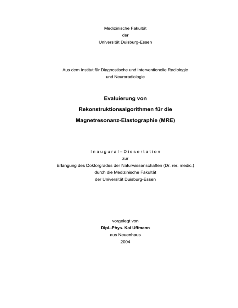 Medizinische Fakultät der Universität Duisburg-Essen Aus dem Institut für Diagnostische und Interventionelle Radiologie und Neuroradiologie Evaluierung von Rekonstruktionsalgorithmen für die Magnetresonanz-Elastographie (MRE) Inaugural–Dissertation zur Erlangung des Doktorgrades der Naturwissenschaften (Dr. rer. medic.) durch die Medizinische Fakultät der Universität Duisburg-Essen vorgelegt von Dipl.-Phys. Kai Uffmann aus Neuenhaus 2004 Dekan: Univ.-Prof. Dr. rer. nat. K.-H. Jöckel 1. Gutachter: Univ.-Prof. Dr. sc. techn. M. E. Ladd 2. Gutachter: Prof. Dr. rer. nat. O. Bryngdahl Tag der mündlichen Prüfung: 2. Mai 2005 2 Veröffentlichungen Die dieser Arbeit zugrunde liegenden Studien führten zu folgenden Publikationen in internationalen Peer-Reviewed Journals mit dem Verfasser dieser Arbeit als Erstautor: Uffmann, K., Abicht, C., Grote, W., Quick, H.H., Ladd, M.E., (2002): Design of an MRcompatible piezoelectric actuator for MR elastography. Concepts in Magnetic Resonance (Magnetic Resonance Engineering) 15(4), 239-254. Uffmann, K., Maderwald, S., Ajaj, W., Galbán, C.G., Mateiescu, S., Quick, H.H., Ladd, M.E., (2004): In vivo elasticity measurements of extremity skeletal muscle with MR elastography. NMR Biomed 17(4), 181-90. Folgende Studienresultate wurden auf Kongressen vorgestellt: Uffmann K., Abicht C., Quick H.H., Ulbrich H., Ladd M.E., (2001): Vergleich von Aktorkonzepten für die MR-Elastographie: piezoelektrisch versus elektromechanisch. Werkstattgespräche: Experimentelle Radiologie, Fortschr Röntgenstr 173 (9), 855 Uffmann K., Abicht C., Quick H.H., Ulbrich H., Ladd M.E., (2001): Characterization of an electromagnetic actuator for MR elastography. Proc. Intl. Soc. Mag. Reson. Med. 9, Glasgow, 222 Uffmann K., Abicht C., Quick H.H., Ulbrich H., Ladd M.E., (2001): Vergleich verschiedener Konstruktionsprinzipien von Aktoren für die MR-Elastographie. 4. Jahrestagung der Deutschen Sektion der ISMRM e.V., 27 Uffmann K., Abicht C., Quick H.H., Ulbrich H., Debatin J.F., Ladd M.E., (2001): A system for generating either transverse and longitudinal waves for MR elastography. Proc. Intl. Soc. Mag. Reson. Med. 9, 224 Uffmann K., Grote W., Abicht C., Quick H.H., Ladd M.E., (2002): A piezoelectric actuator for MR elastography. Proc. Intl. Soc. Mag. Reson. Med. 10, 382 Uffmann K., Maderwald S., Mateiescu S., Ajaj W., Galbán C.J., Ladd M.E., (2003): In vivo MR elastography of skeletal muscle. Ann. Scientific Meeting of the ESMRMB 20, MAGMA, Suppl.1, Vol. 16, 76 Uffmann K., Maderwald S., de Greiff A., Ladd M.E., (2004): Determination of gray and white matter elasticity with MR elastography. Proc. Intl. Soc. Mag. Reson. Med. 12, 339 Uffmann K., Maderwald S., Mateiescu S., Ajaj W., Galbán C.J., Ladd M.E., (2004): In vivo examination of skeletal muscle with MR elastogaphy. Proc. Intl. Soc. Mag. Reson. Med. 12, Kyoto, 340 Uffmann K., Ladd M.E., (2004): Single phase image reconstruction for MR elastography. Proc. Intl. Soc. Mag. Reson. Med. 12, 340 Darüber hinaus resultierten Studien zu dieser Arbeit in weiteren Kongressbeiträgen mit dem Verfasser als Ko-Autor. Diese Arbeit wurde vom Ministerium für Wissenschaft und Forschung des Landes Nordrhein-Westfalen und dem internen Forschungsprogramm der medizinischen Fakultät IFORES gefördert. 3 Inhaltsverzeichnis Veröffentlichungen 3 Inhaltsverzeichnis 4 1 Einleitung 7 1.1 Physik der Elastizitätsmessungen 8 1.1.1 Elastizitätstheorie 1.1.2 Elastizitätsbestimmung in der Praxis 1.2 8 Medizinische Elastographie 15 16 1.2.1 Das diagnostische Potential der Elastographie 17 1.2.2 Sicherheitsaspekte der dynamischen Elastographie 19 1.3 Elastizität menschlichen Gewebes 22 1.3.1 Ex vivo 22 1.3.2 In vivo 24 1.4 Bildgebende Verfahren für in vivo Elastizitätsmessung 24 1.4.1 Ultraschall-Elastographie 24 1.4.2 Magnetresonanz-Elastographie 26 1.4.2.1 Mechanische Anregung 27 1.4.2.2 Die Bildgebungssequenz 28 1.5 Ziel der Arbeit 29 2 Material und Methoden 2.1 30 Das MRE-System 30 2.1.1 Mechanische Anregung 31 2.1.2 Die Bildgebungssequenz 33 2.2 Rekonstruktion der Bilddaten 2.2.1 34 Rekonstruktionsmethoden 36 2.2.1.1 Phase Unwrapping 36 2.2.1.2 2D Fast Fourier Transformation 37 2.2.1.3 Simple Imagewise Reconstruction 39 2.2.1.4 Local Frequency Estimation 39 2.2.1.5 Manuelle Auswertung 41 2.2.1.6 Phasengradienten Rekonstruktion 42 2.2.1.7 Advanced Reconstruction 42 2.2.2 2.2.2.1 Evaluierung der Rekonstruktionsmethoden Evaluierung mit Testbilder 4 43 44 2.2.2.2 2.3 Evaluierung der MRE-Untersuchungen 44 MRE-Untersuchungen 45 Phantome 45 2.3.1 2.3.1.1 Akquisition 45 2.3.1.2 Rekonstruktion 46 2.3.2 Skelettmuskulatur 47 2.3.2.1 Akquisition 47 2.3.2.2 Rekonstruktion 47 2.3.3 Hirn 48 2.3.3.1 Akquisition 48 2.3.3.2 Rekonstruktion 49 2.3.4 Haut 50 2.3.4.1 Akquisition 50 2.3.4.2 Rekonstruktion 50 3 Ergebnisse 51 3.1 Das MRE-System 51 3.2 Rekonstruktion der Bilddaten 51 3.2.1 3.3 Evaluierung mit Testbilder 51 MRE-Untersuchungen 53 Phantome 53 3.3.1 3.3.1.1 Akquisition 53 3.3.1.2 Rekonstruktion 54 3.3.2 Skelettmuskulatur 57 3.3.2.1 Akquisition 57 3.3.2.2 Rekonstruktion 58 3.3.3 Hirn 63 3.3.3.1 Akquisition 63 3.3.3.2 Rekonstruktion 64 3.3.4 Haut 66 3.3.4.1 Akquisition 66 3.3.4.2 Rekonstruktion 67 4 Diskussion 4.1 69 Das MRE-System 69 4.1.1 Mechanische Anregung 69 4.1.2 Bildgebungssequenz 69 4.2 Rekonstruktion der Bilddaten 70 5 4.2.1 Rekonstruktionsmethoden 70 4.2.1.1 2D Fast Fourier Transformation 70 4.2.1.2 Simple Imagewise Reconstruction 71 4.2.1.3 Local Frequency Estimation 71 4.2.1.4 Manuelle Auswertung 71 4.2.1.5 Phasengradienten Rekonstruktion 72 4.2.1.6 Advanced Reconstruction 73 4.2.2 Evaluierung der Rekonstruktionsmethoden 4.2.2.1 4.3 Testbilder 73 74 MRE-Untersuchungen 75 Phantome 75 4.3.1 4.3.1.1 Akquisition 75 4.3.1.2 Rekonstruktion 76 4.3.2 Skelettmuskulatur 78 4.3.2.1 Akquisition 78 4.3.2.2 Rekonstruktion 79 4.3.3 Hirn 80 4.3.3.1 Akquisition 80 4.3.3.2 Rekonstruktion 80 4.3.4 Haut 82 4.3.4.1 Akquisition 82 4.3.4.2 Rekonstruktion 82 5 Schlussfol